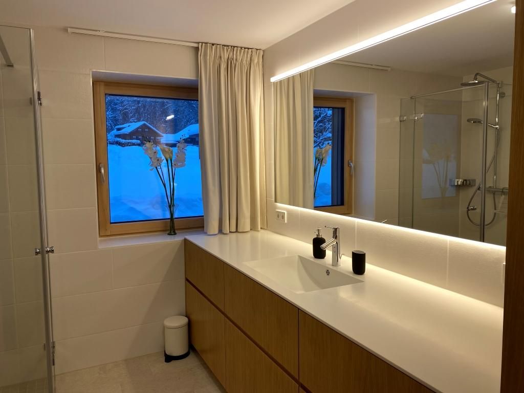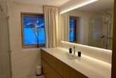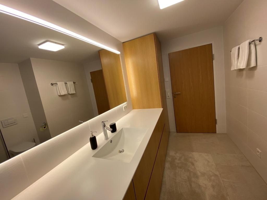• Modernes Badezimmer mit Bodenheizung, Dusche, Haartrockner und Fenster