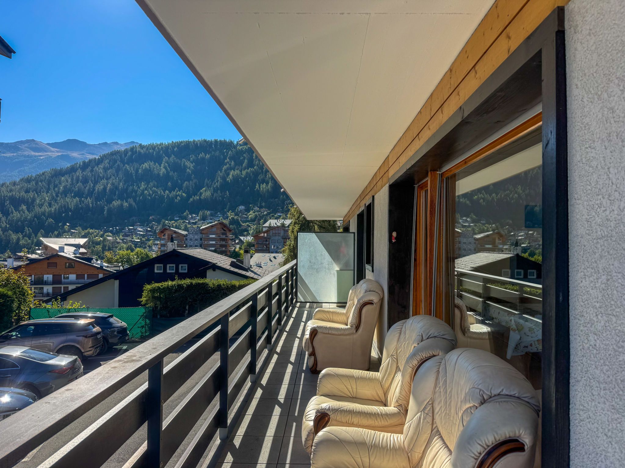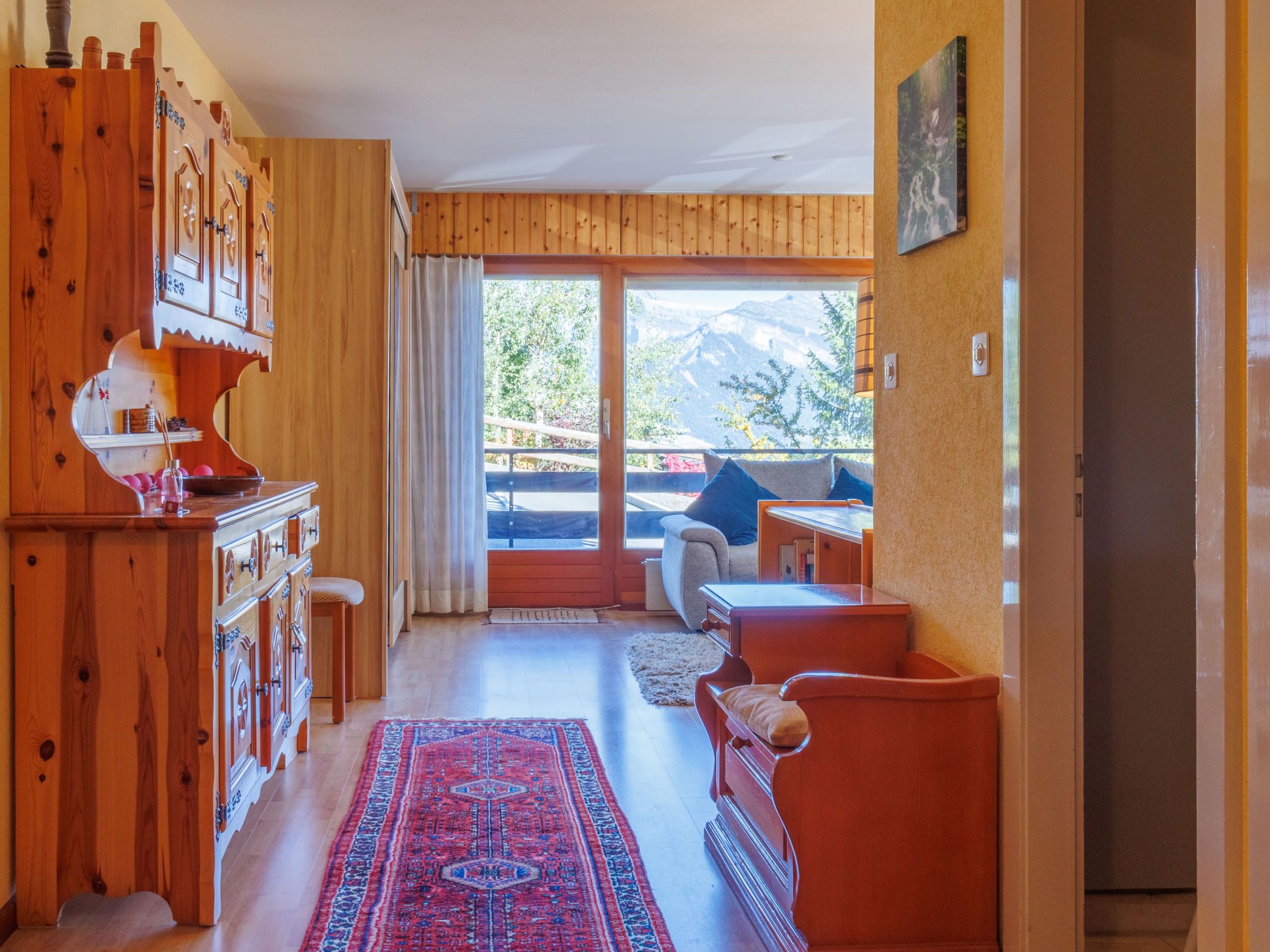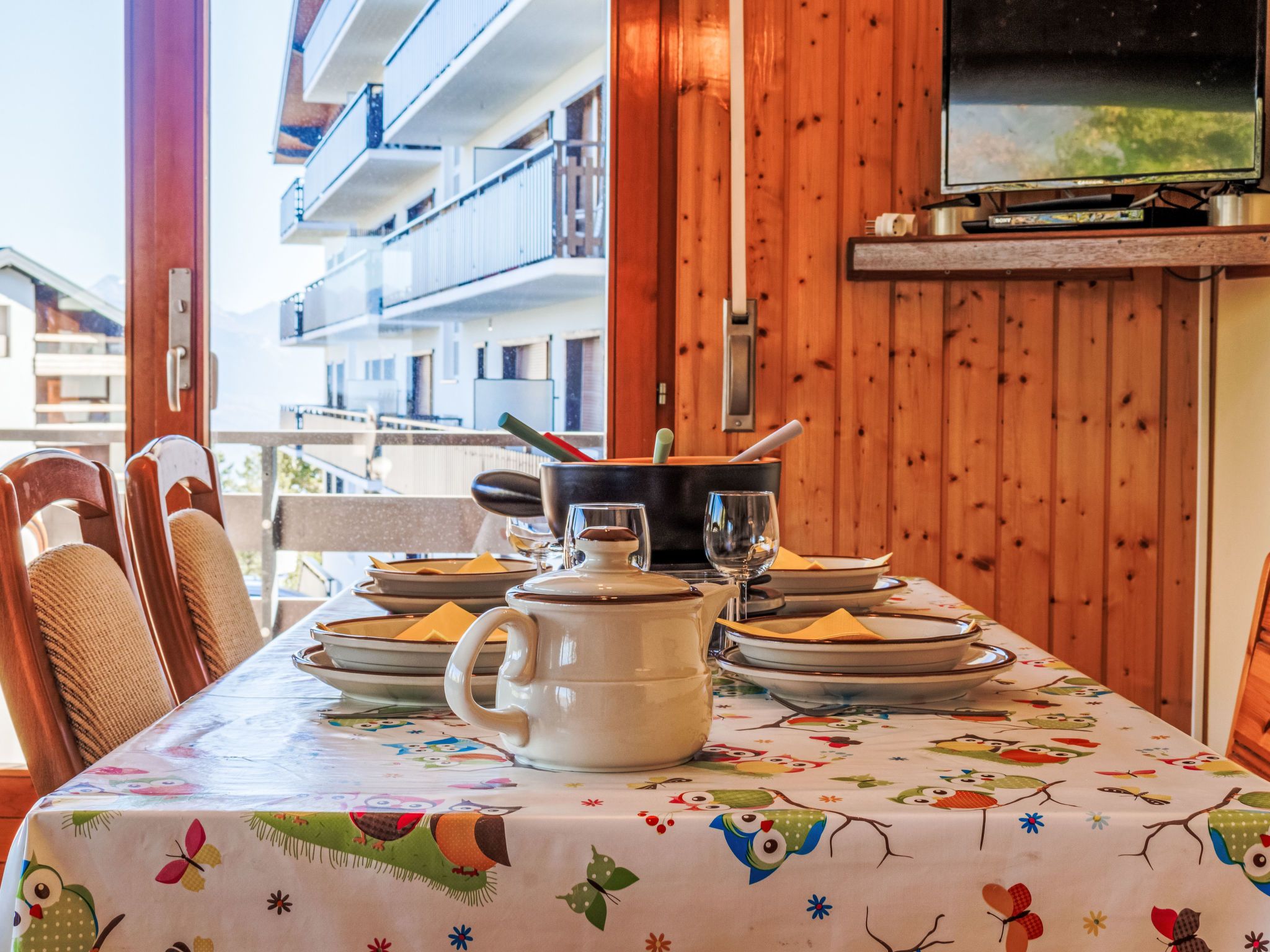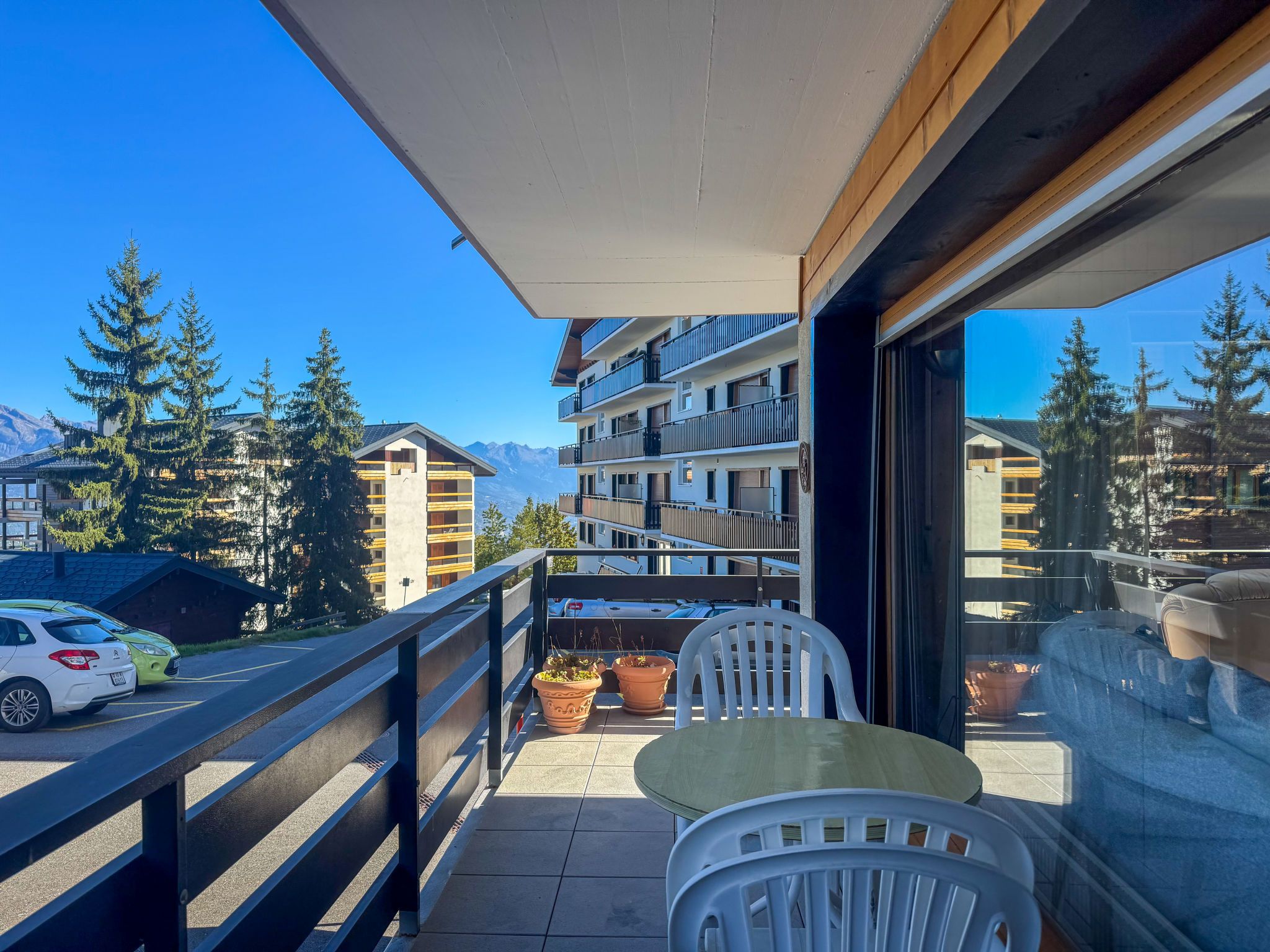 Aiglon G0, 2-Zimmer-Wohnung 50 m2, im ebenerdigen Untergeschoss, Südostlage. Objekt geeignet für 2 Erwachsene + 2 Kinder. Komfortabel und schön eingerichtet: Eingang mit 2 Wandschrankbetten (90 cm, Länge 200 cm). Wohn-/Esszimmer mit Kabel-TV. Ausgang zum Balkon. 1 Zimmer mit 1 Doppelbett (160 cm, Länge 200 cm). Ausgang zum Balkon, Richtung Osten. Küche (3 Kochplatten, Backofen, Geschirrspüler, Toaster, Wasserkocher, elektrische Kaffeemaschine, Kapseln für die Kaffeemaschine (Dolce Gusto) extra, Racletteofen, Fondue Set (Chinoise, Käse)). Bad/WC. Balkon 25 m2. Balkonmöbel. Sicht auf die Berge und das Tal. Zur Verfügung: Haartrockner. Internet (WLAN, gratis). Bitte beachten: Wohnung auf Parkplatzseite. Nichtraucher-Unterkunft. Anstelle eines abgeschlossenen Schlafzimmers befinden sich manche Schlafplätze in einem offenen Bereich (Galerie, Nische etc.).