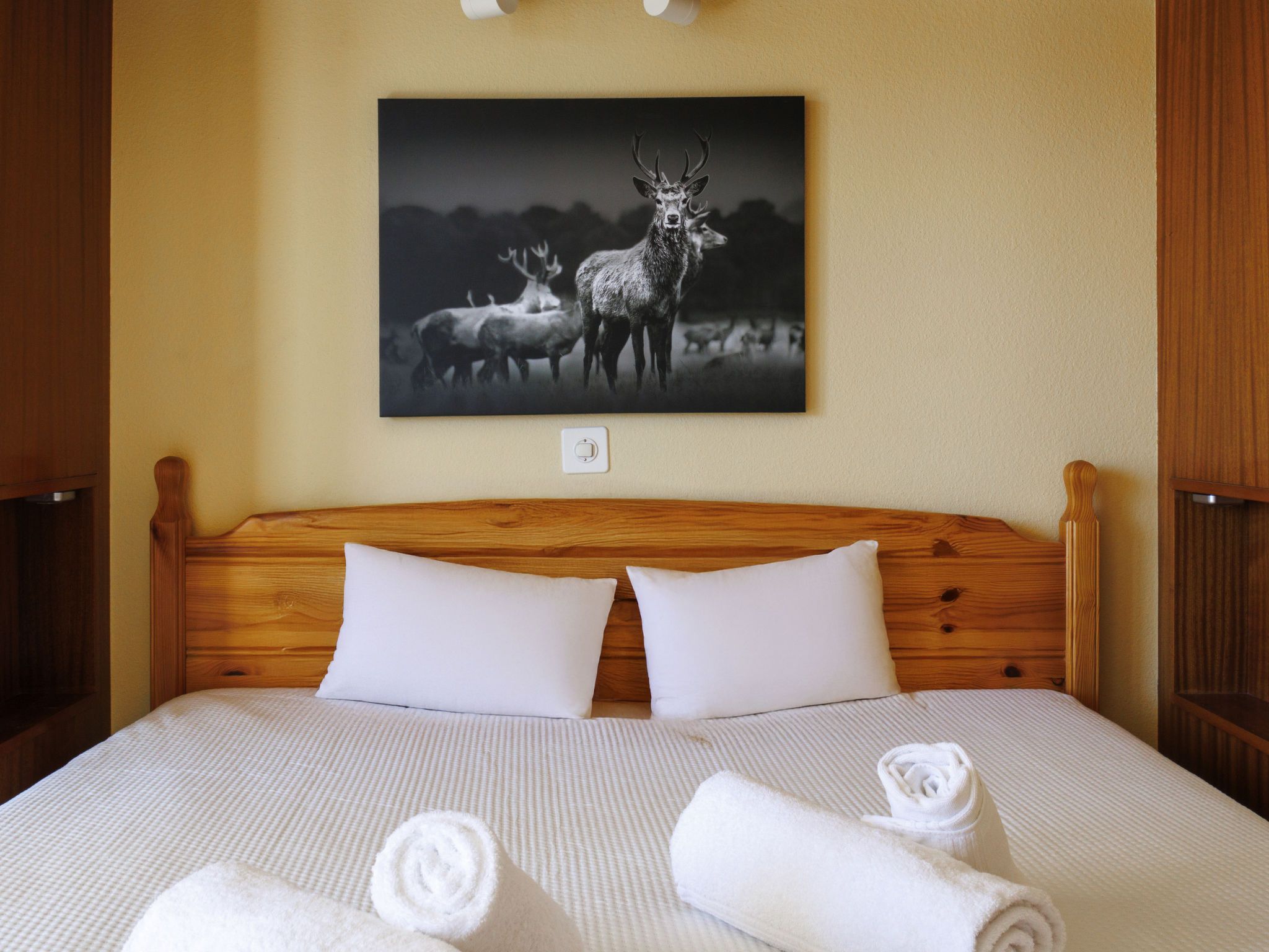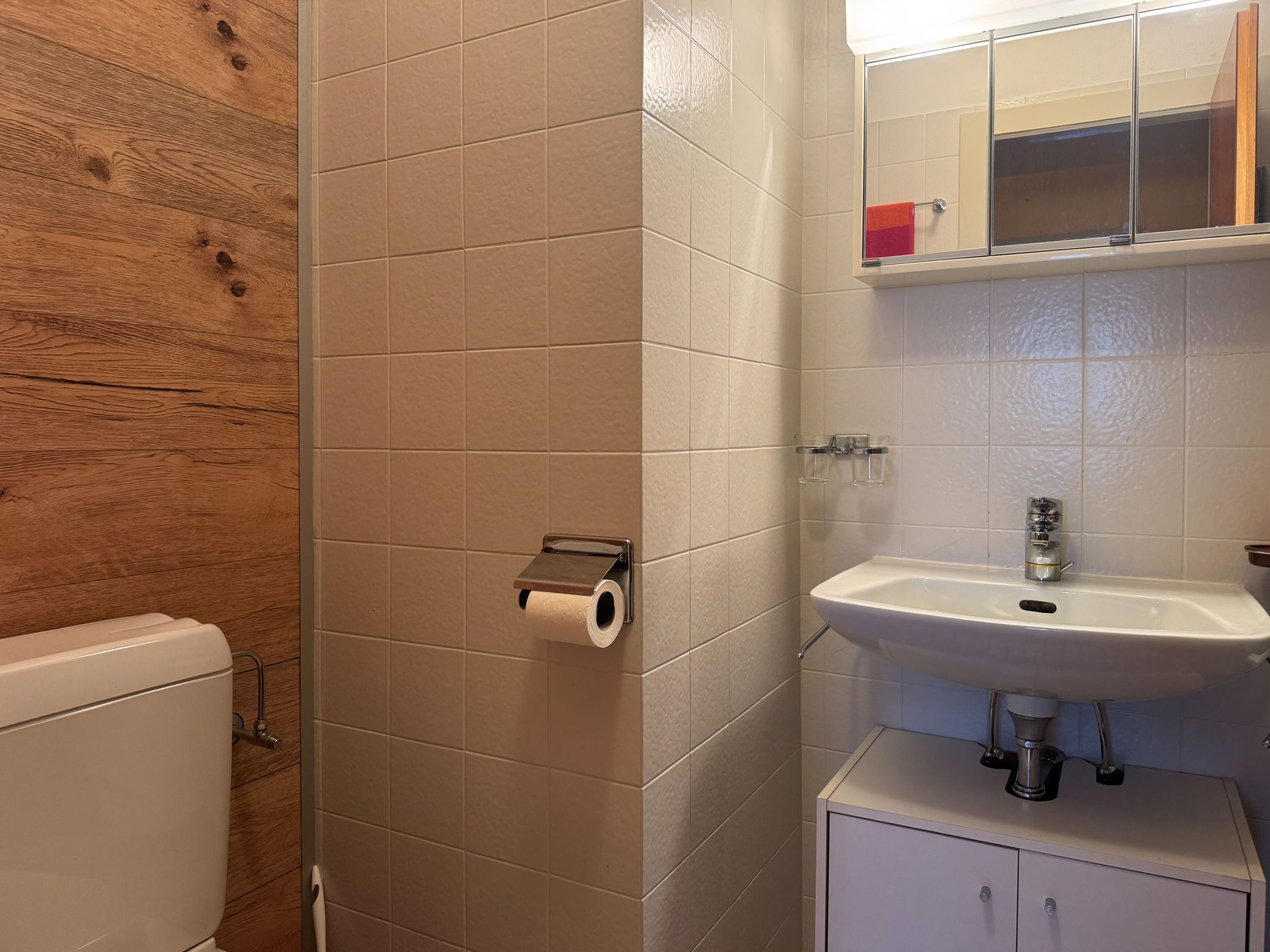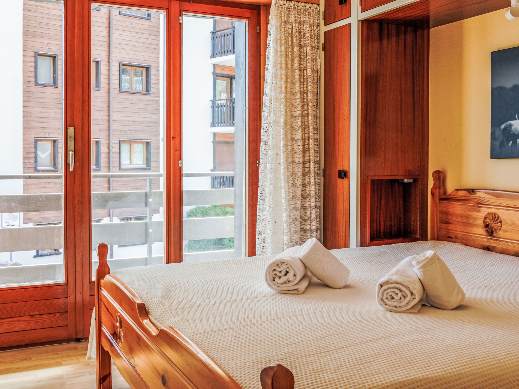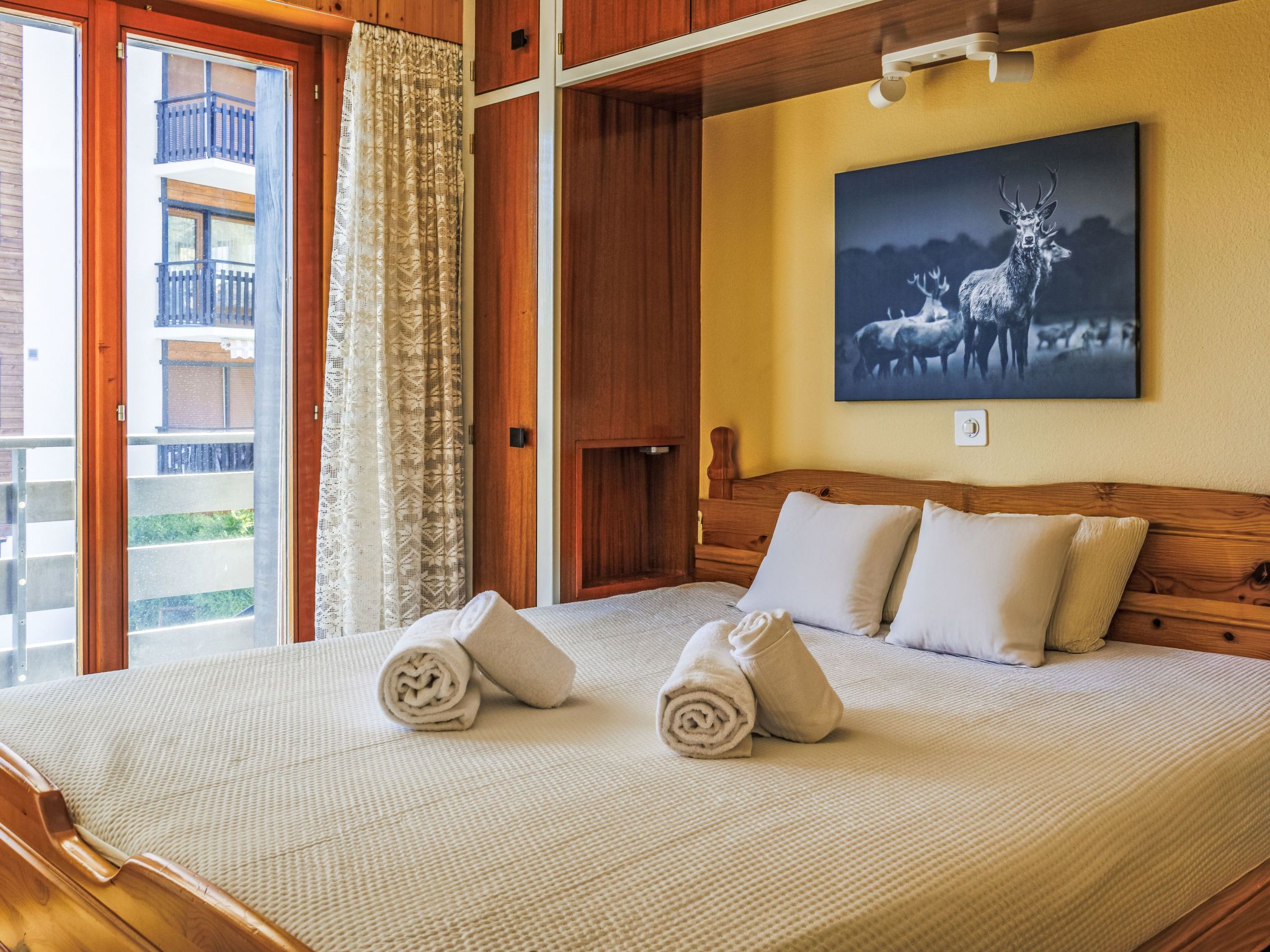 Aiglon G0, 2-Zimmer-Wohnung 50 m2, im ebenerdigen Untergeschoss, Südostlage. Objekt geeignet für 2 Erwachsene + 2 Kinder. Komfortabel und schön eingerichtet: Eingang mit 2 Wandschrankbetten (90 cm, Länge 200 cm). Wohn-/Esszimmer mit Kabel-TV. Ausgang zum Balkon. 1 Zimmer mit 1 Doppelbett (160 cm, Länge 200 cm). Ausgang zum Balkon, Richtung Osten. Küche (3 Kochplatten, Backofen, Geschirrspüler, Toaster, Wasserkocher, elektrische Kaffeemaschine, Kapseln für die Kaffeemaschine (Dolce Gusto) extra, Racletteofen, Fondue Set (Chinoise, Käse)). Bad/WC. Balkon 25 m2. Balkonmöbel. Sicht auf die Berge und das Tal. Zur Verfügung: Haartrockner. Internet (WLAN, gratis). Bitte beachten: Wohnung auf Parkplatzseite. Nichtraucher-Unterkunft. Anstelle eines abgeschlossenen Schlafzimmers befinden sich manche Schlafplätze in einem offenen Bereich (Galerie, Nische etc.).