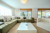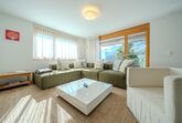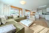 Heller, offener Wohnraum mit Sofaecke, TV, WLAN und schönem Blick auf die Berge. Der Raum ist verbunden mit der Küche und dem Essbereich.