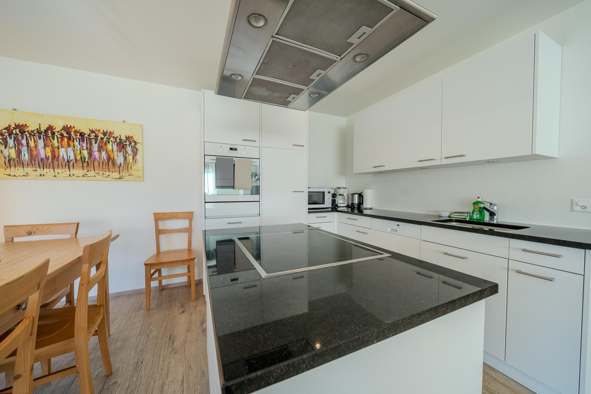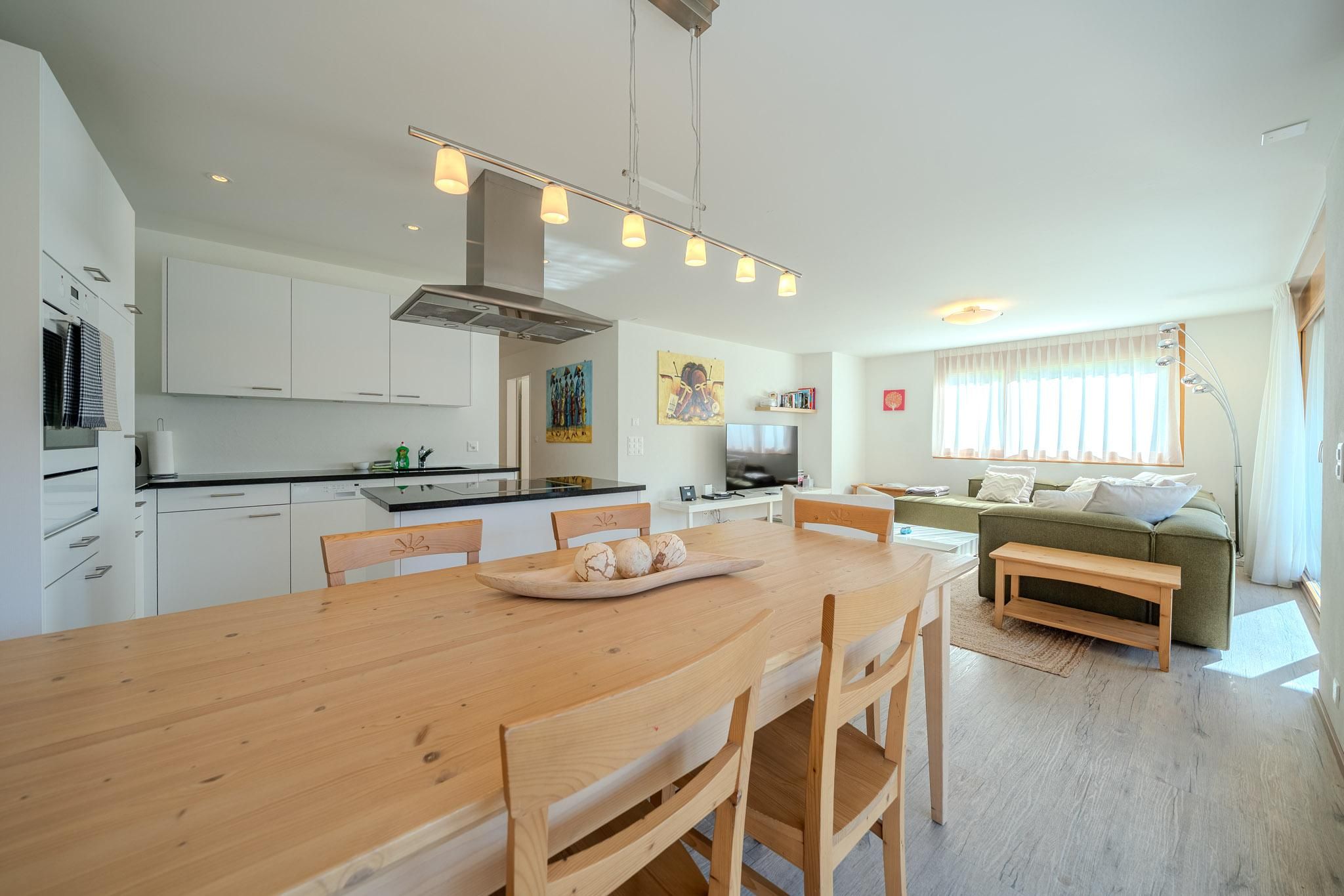 Modern und komplett ausgestattet: Nespresso-Kaffeemaschine, Geschirrspüler, Mikrowelle, Raclette- und Fondue-Set sowie alle wichtigen Kochutensilien. Der Esstisch bietet Platz für bis zu 6 Personen.