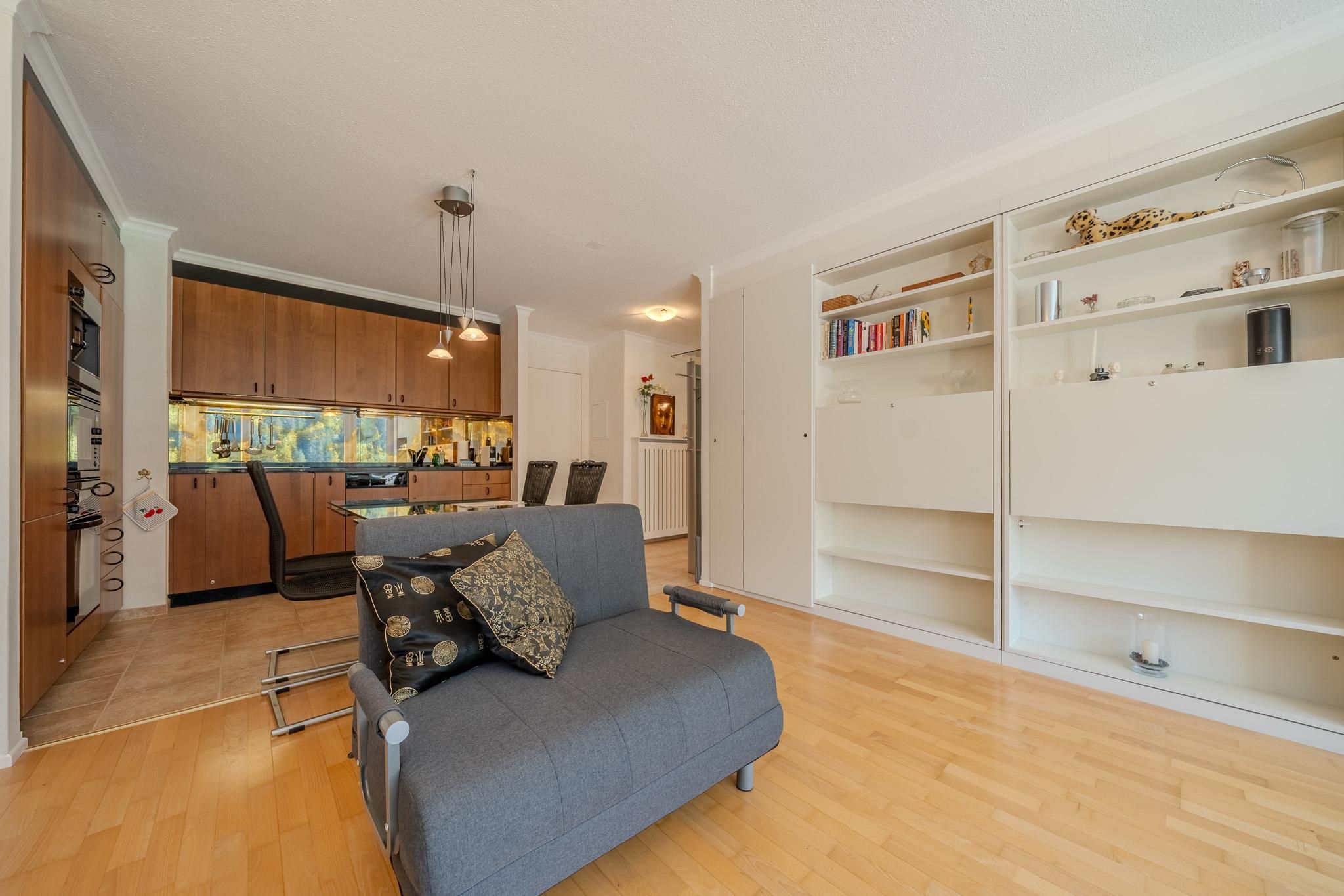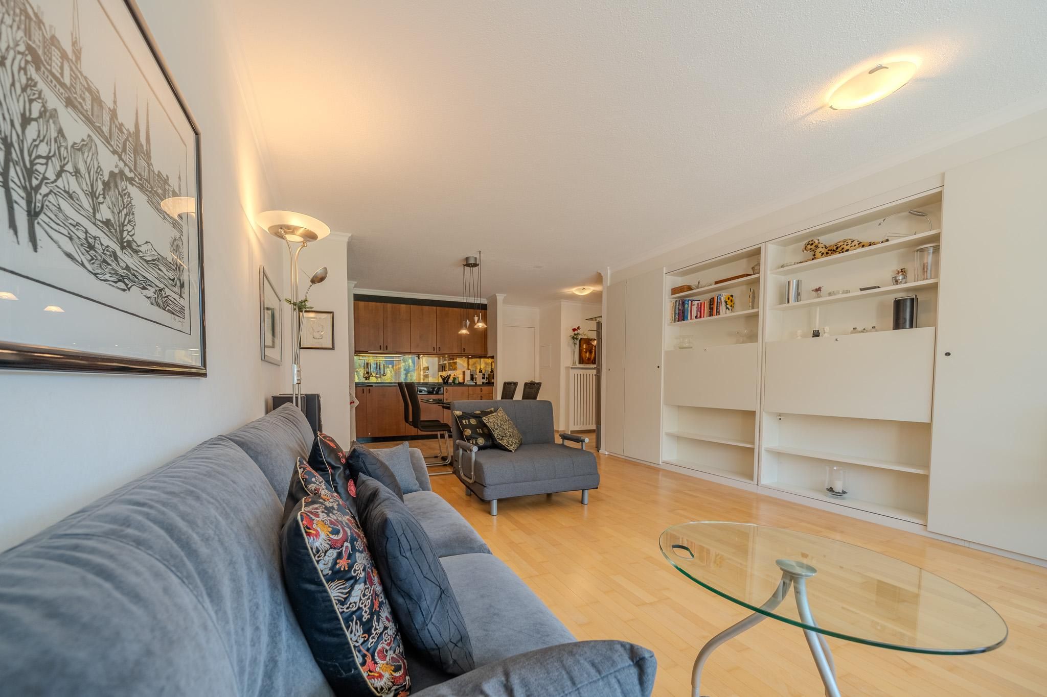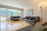 Grosszügig und hell, mit Sofa, TV, Esstisch und Zugang zum grossen Balkon mit Bergblick.