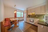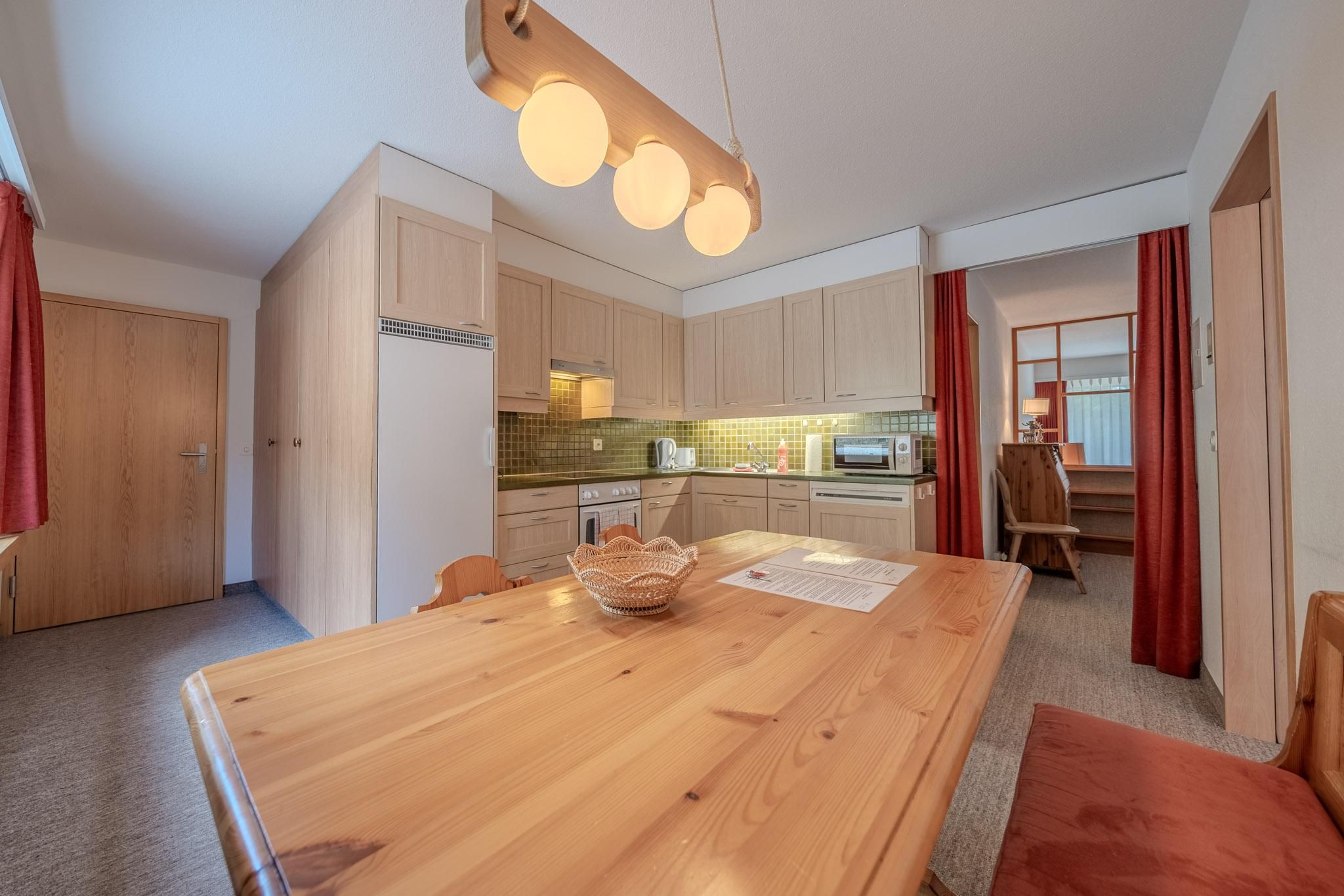 Voll ausgestattet mit Esstisch, Geschirrspüler, Mikrowelle, Fondue- und Raclette-Set, Toaster, Nespresso-Kaffeemaschine, Wasserkocher, Kühlschrank, Backofen und Grundausstattung an Küchenutensilien.