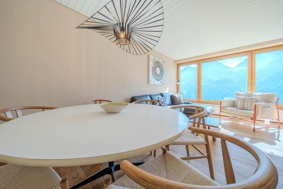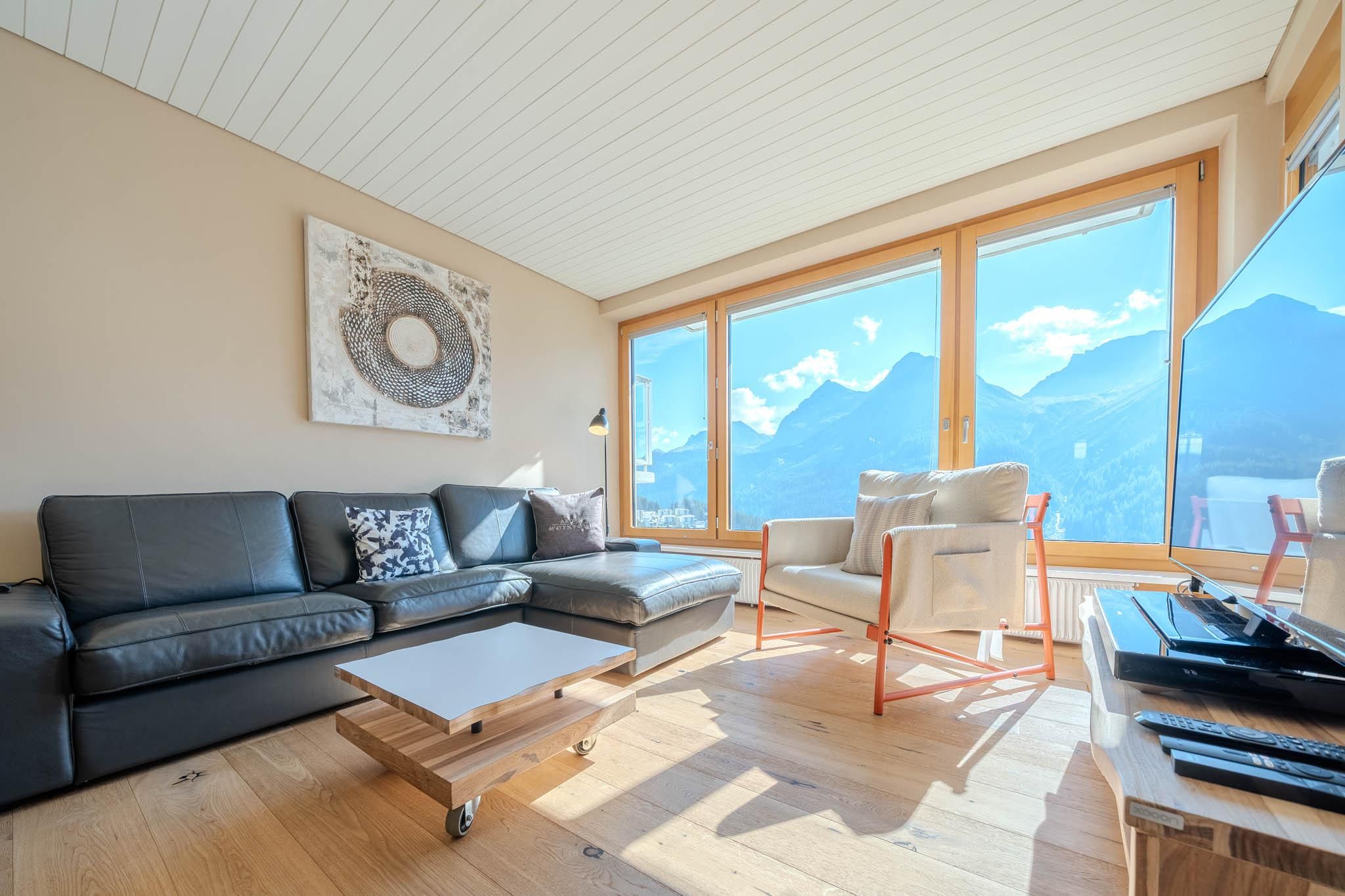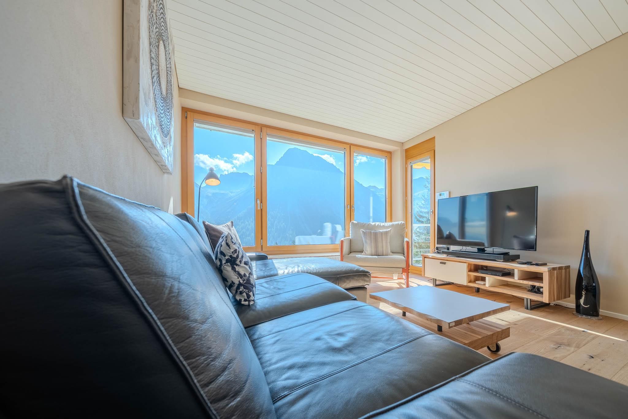 Hell und modern, mit grosszügigem Platzangebot und einzigartigem Blick auf die Berge und das Dorf Arosa. Ausgestattet mit bequemen Sofas, Esstisch, TV und WLAN.