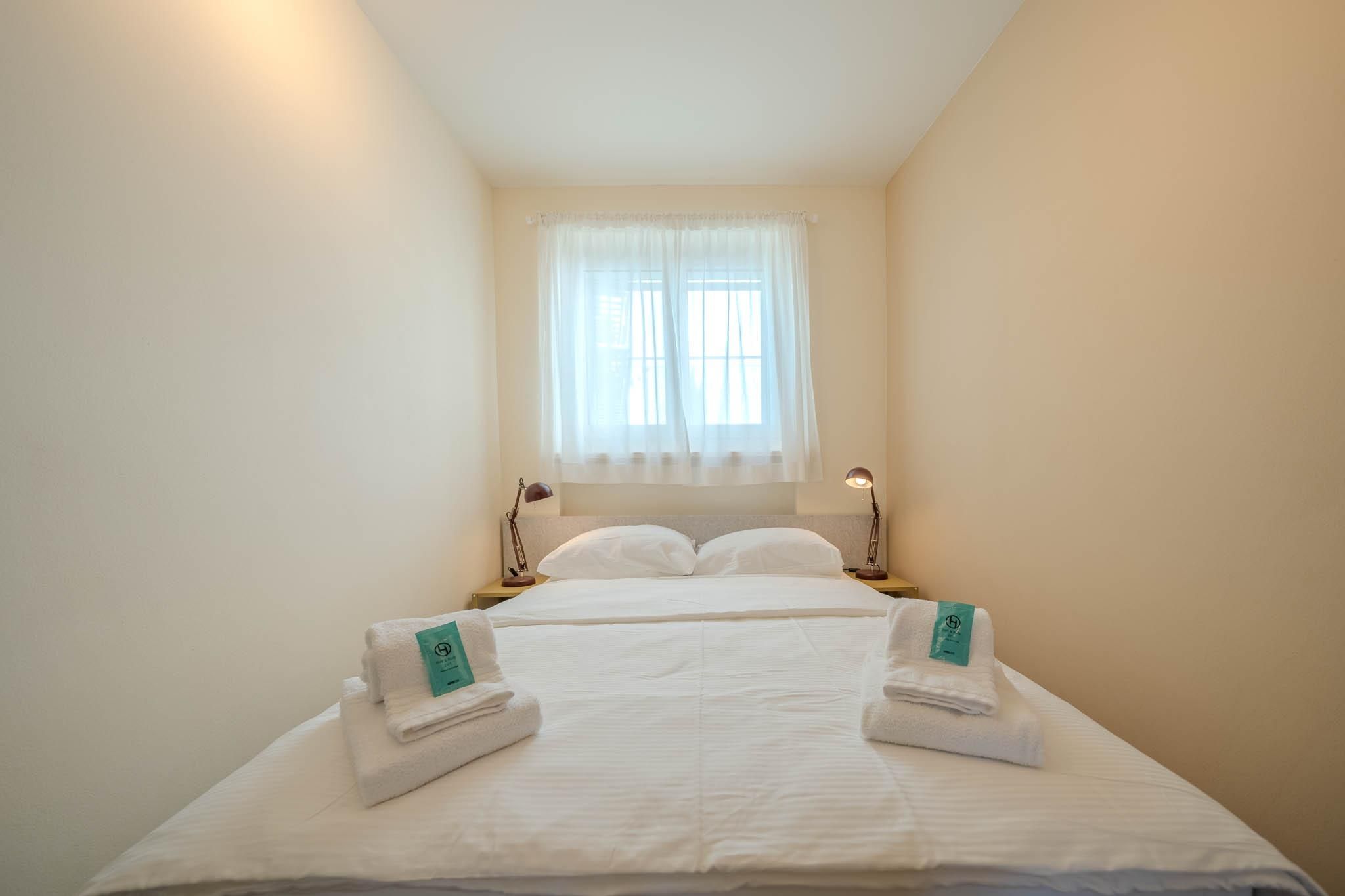 Doppelbett, viel Stauraum im Kleiderschrank und direkter Zugang zum Balkon.