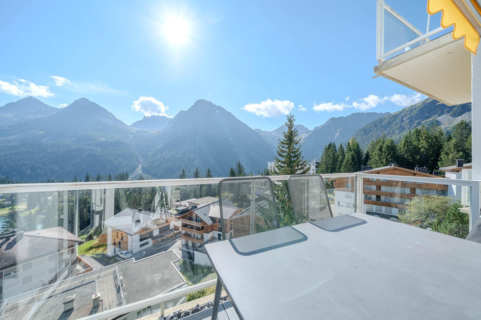 Atemberaubende Aussicht auf die umliegenden Berge und Arosa, ausgestattet mit Tisch und Stühlen.