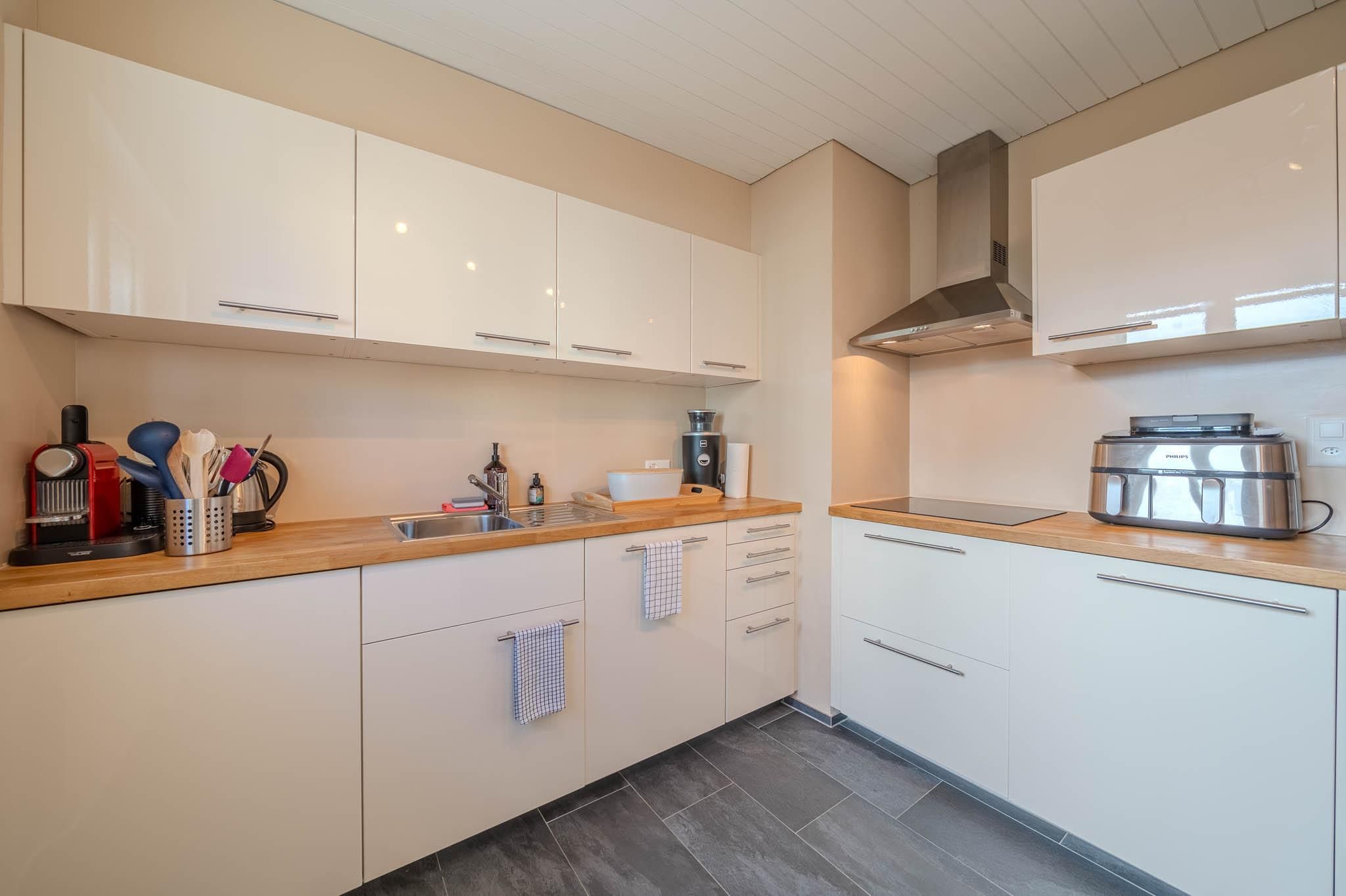 Modern und komplett ausgestattet mit allen wichtigen Utensilien, Geschirrspüler, Nespresso-Kaffeemaschine, Heissluftfritteuse, Mikrowelle, Toaster sowie Raclette- und Fondue-Sets – alles, was Sie zum Kochen zu Hause brauchen, und noch mehr.