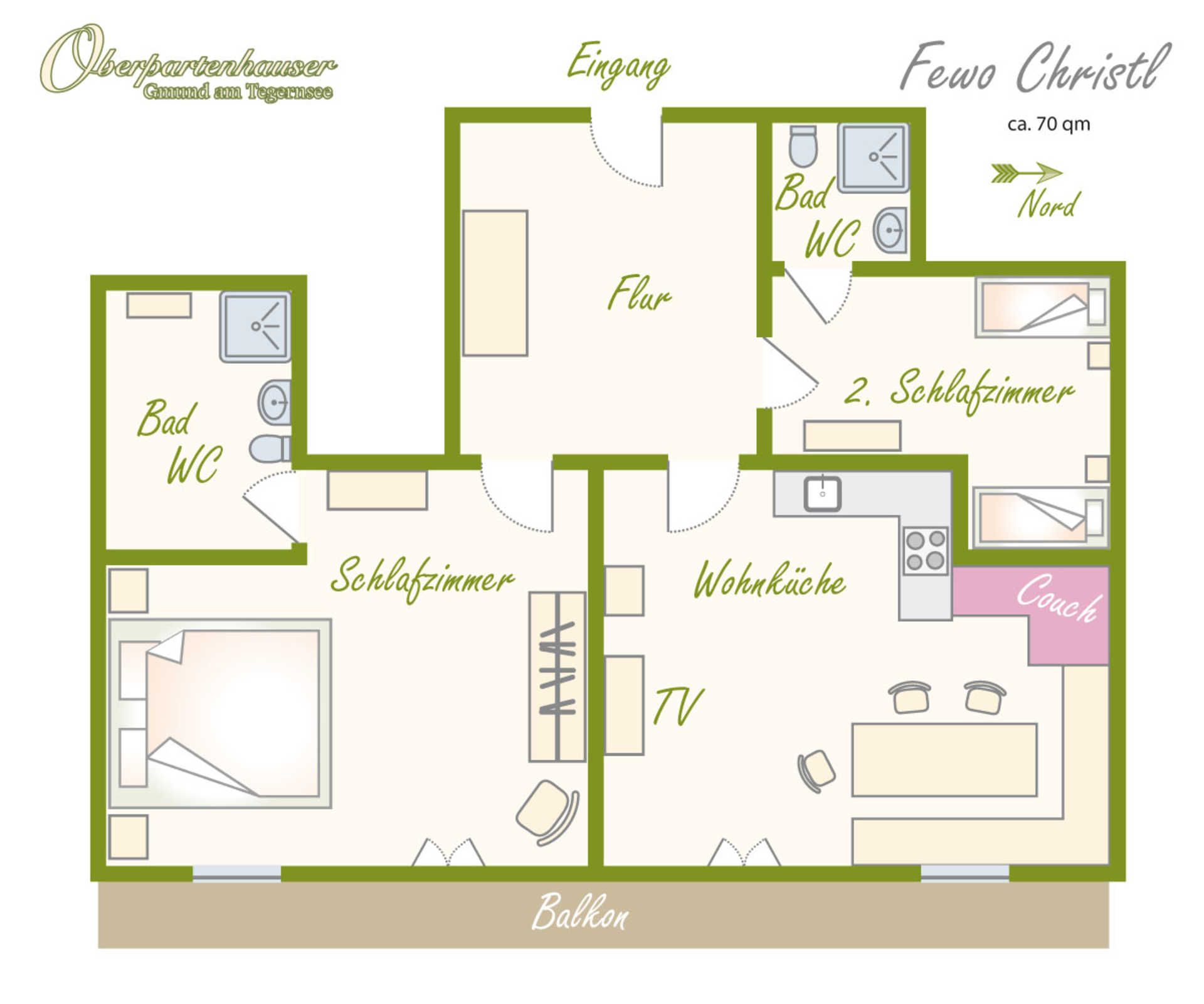 Gemütliche gr. Ferienwohnung, ca. 75 qm mit Balkon, SAT-TV, WLAN, gut ausgestattete Wohnküche, 2 Schlafräume mit jeweils Dusche/WC.
