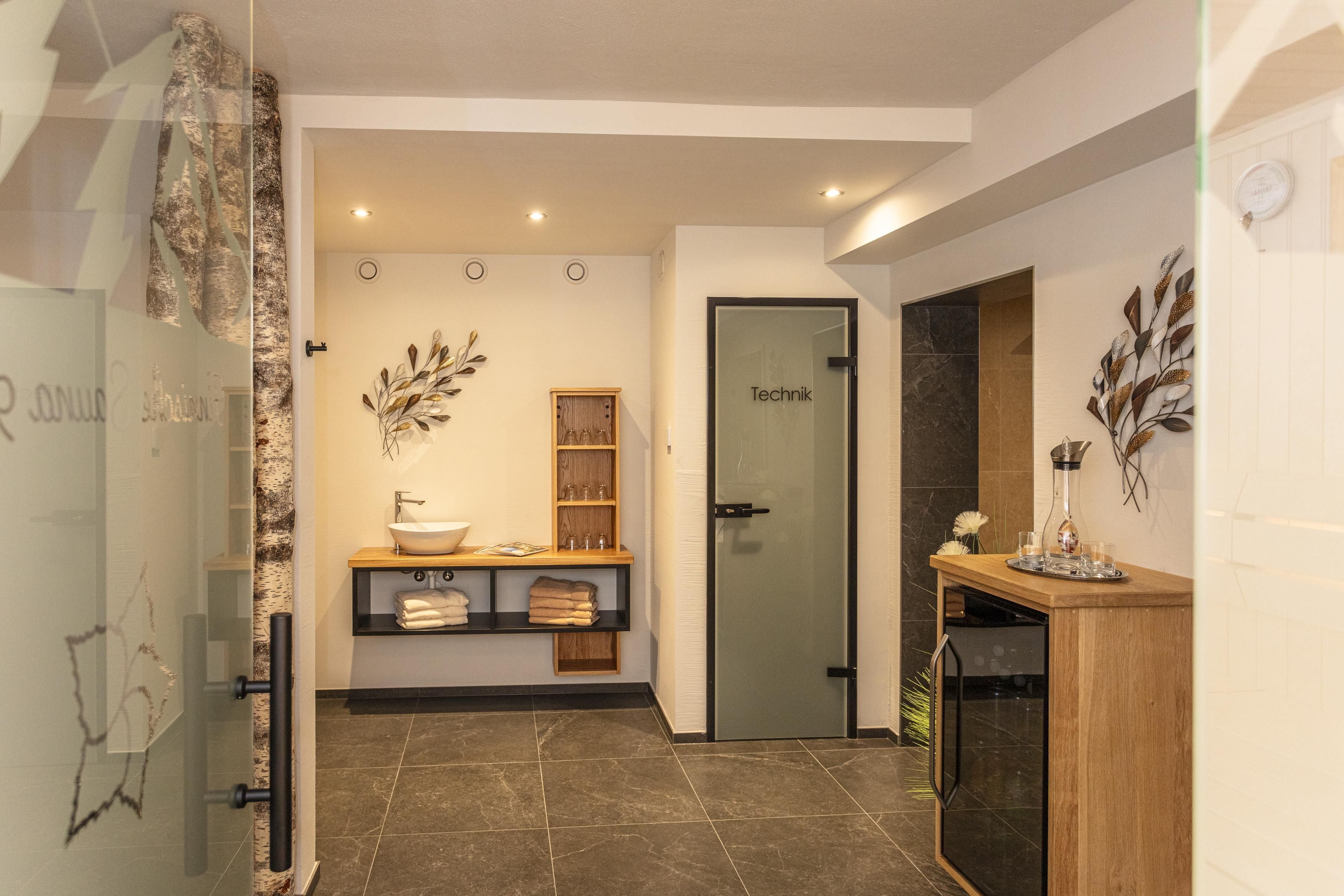 - Unser Wellnessbereich umfasst eine finnische Sauna (90°), eine Biosauna (60°) sowie einen modernen Ruheraum. Die Nutzung ist in der Zimmerbuchung inklusive.