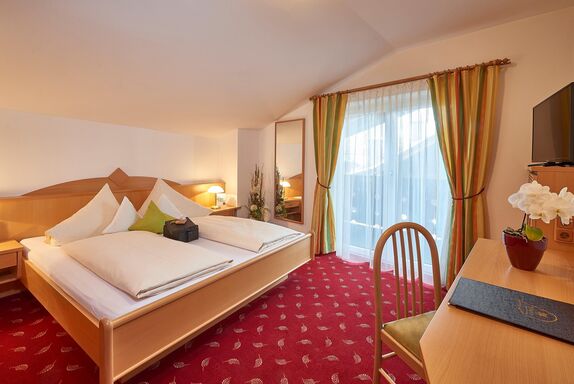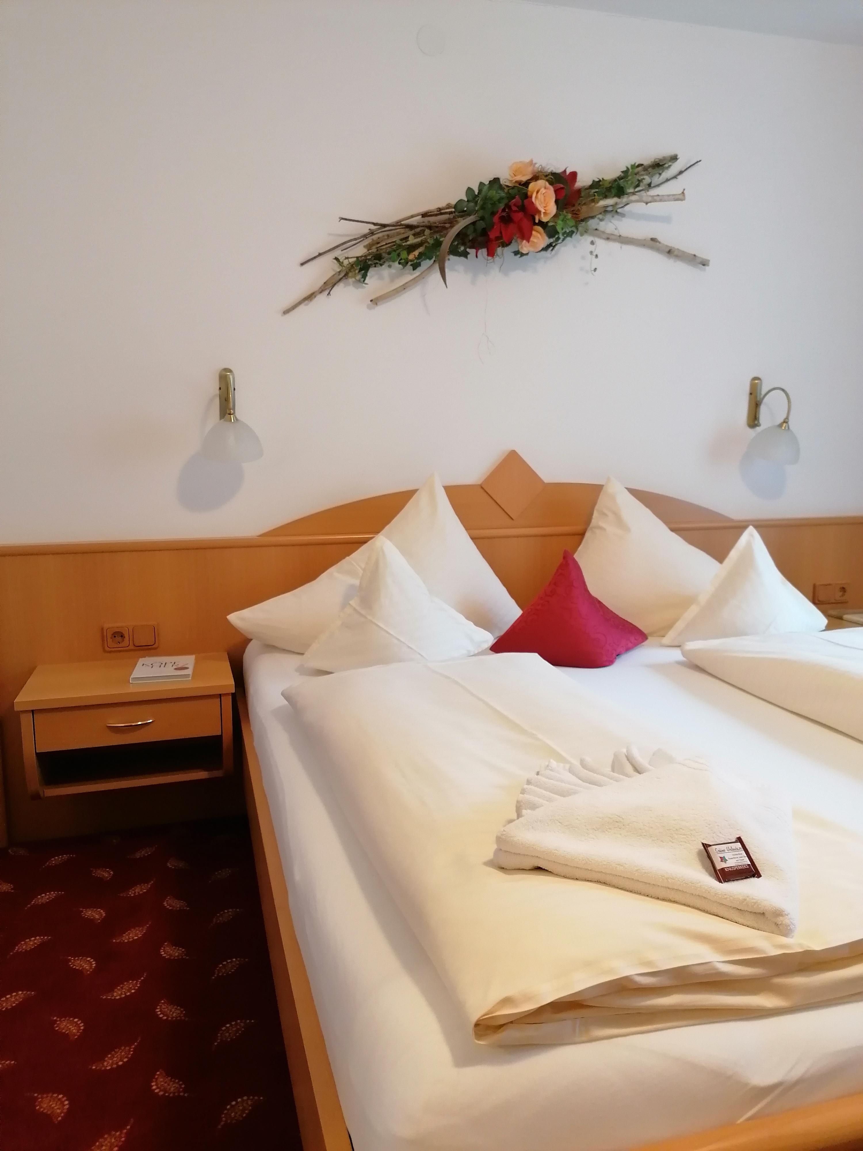 Gemütliches Zimmer ca. 21 m², ausgestattet mit Dusche/WC, Fön, Kosmetiktücher, Seife/Duschbad, Handtücher, Flat-TV, Trinkwasserleitung, Mineralwasserflasche, fertig bezogene Betten, Sitzgruppe oder Schreibtisch, kostenloses W-Lan (Wifi) und Balkon.