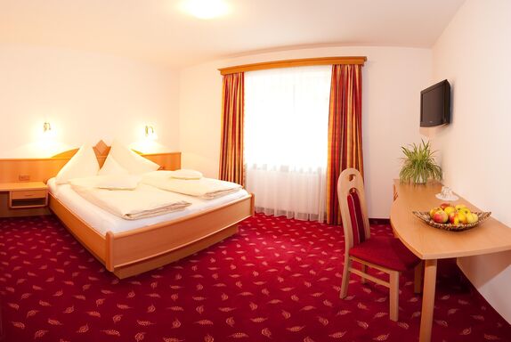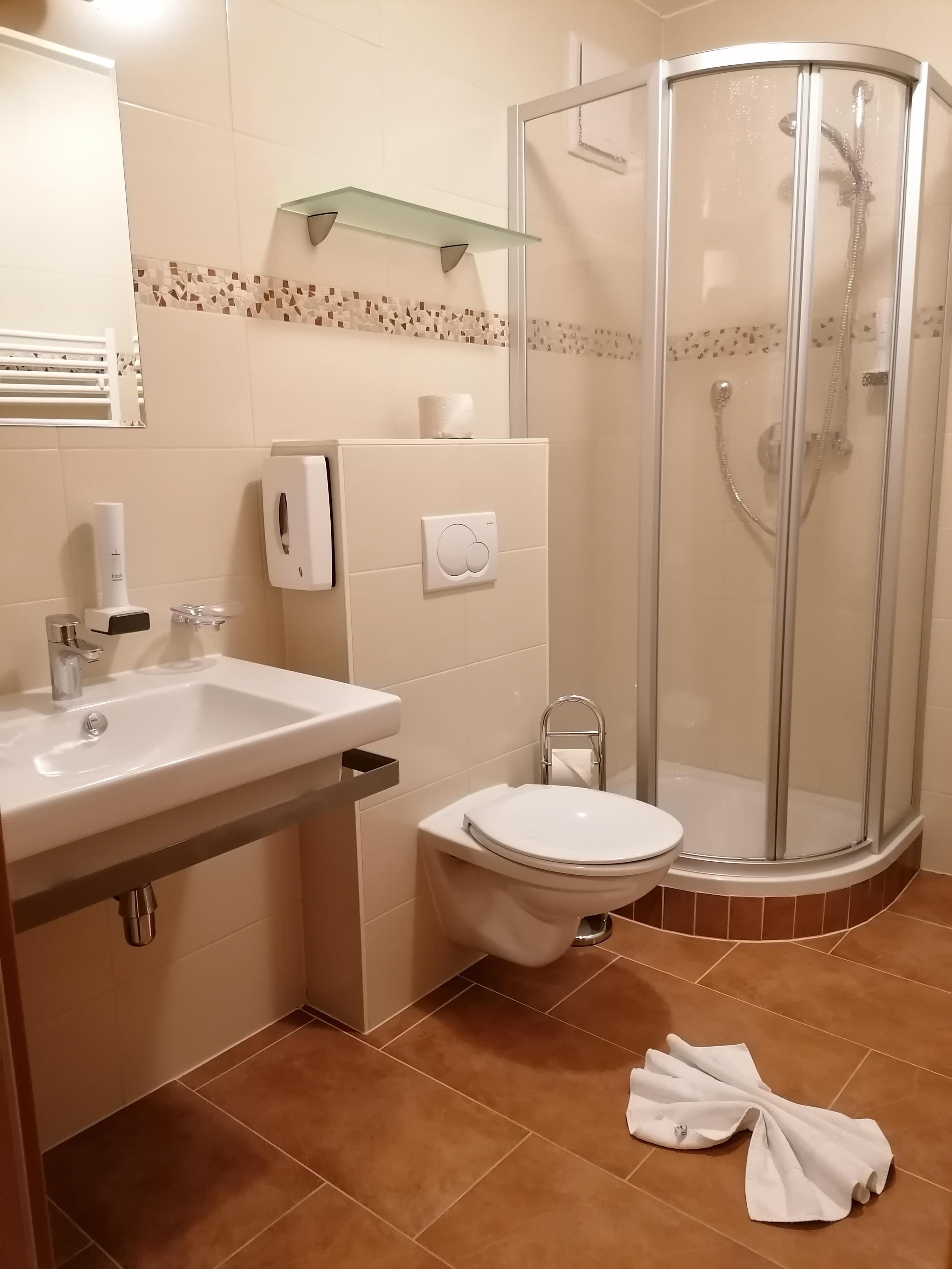 Gemütliches Zimmer ca. 23 m², ausgestattet mit Dusche/WC, Fön, Kosmetiktücher, Seife/Duschbad, Handtücher, Schreibtisch, Flat-TV, Trinkwasserleitung, Mineralwasserflasche, fertig bezogene Betten, kostenloses W-Lan (Wifi), ohne Balkon. Gitterbett möglich. Bei Buchung als Dreibett wird ein Klappbett zur Verfügung gestellt.