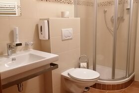 Gemütliches Zimmer ca. 23 m², ausgestattet mit Dusche/WC, Fön, Kosmetiktücher, Seife/Duschbad, Handtücher, Schreibtisch, Flat-TV, Trinkwasserleitung, Mineralwasserflasche, fertig bezogene Betten, kostenloses W-Lan (Wifi), ohne Balkon. Gitterbett möglich. Bei Buchung als Dreibett wird ein Klappbett zur Verfügung gestellt.