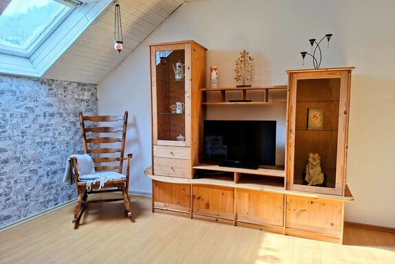 Im gemütlichen Wohnzimmer laden ein Sofa, ein Flachbild-TV, Gesellschaftsspiele sowie eine Leseecke für Groß und Klein zum geselligen Beisammensein ein.