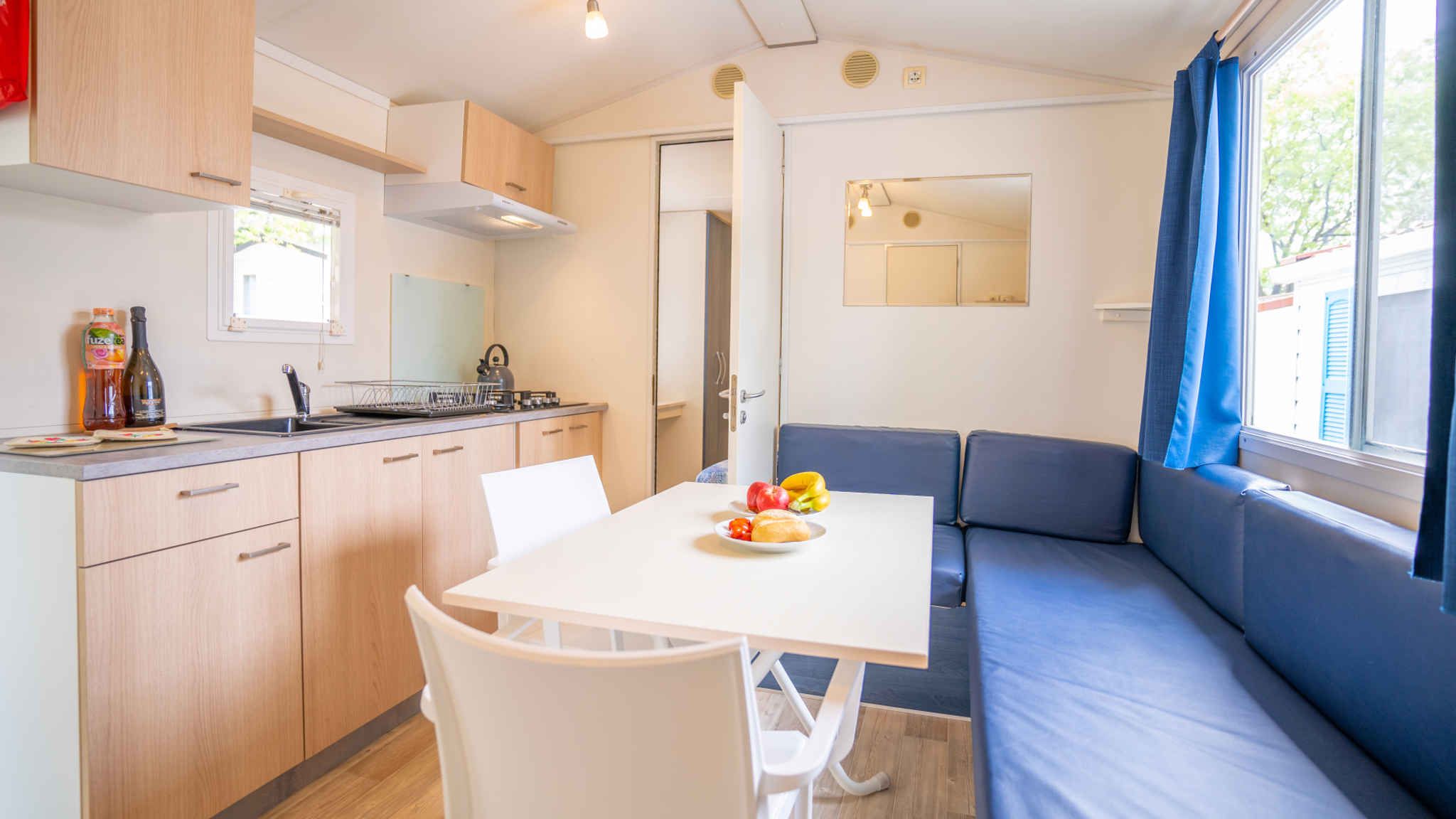 Ihr Mobilehome hat 1 Etage, 3 Zimmer (davon 2 Schlafzimmer), ist 24 qm groß und ist für maximal 5 Personen geeignet. Das Rauchen ist in Innenräumen nicht gestattet. Eine Klimaanlage sorgt an heißen Tagen für angenehme Temperaturen. Die Zimmer teilen sich wie folgt auf: Wohnzimmer mit 1 Zusatzbett auf Sitzecke und Essecke. Sie haben Zugang zur Terrasse mit Gartenmöbeln. Schlafzimmer mit 2 Einzelbetten. Schlafzimmer mit 1 Doppelbett. Kochecke im Wohnzimmer mit Gasherd (4 Flammen) und Kühlschrank (Eisfach). Bad mit Dusche, 1 Waschbecken und WC. Darüber hinaus ist Ihr Mobilehome mit Gitterbett und Kinderstuhl ausgestattet.