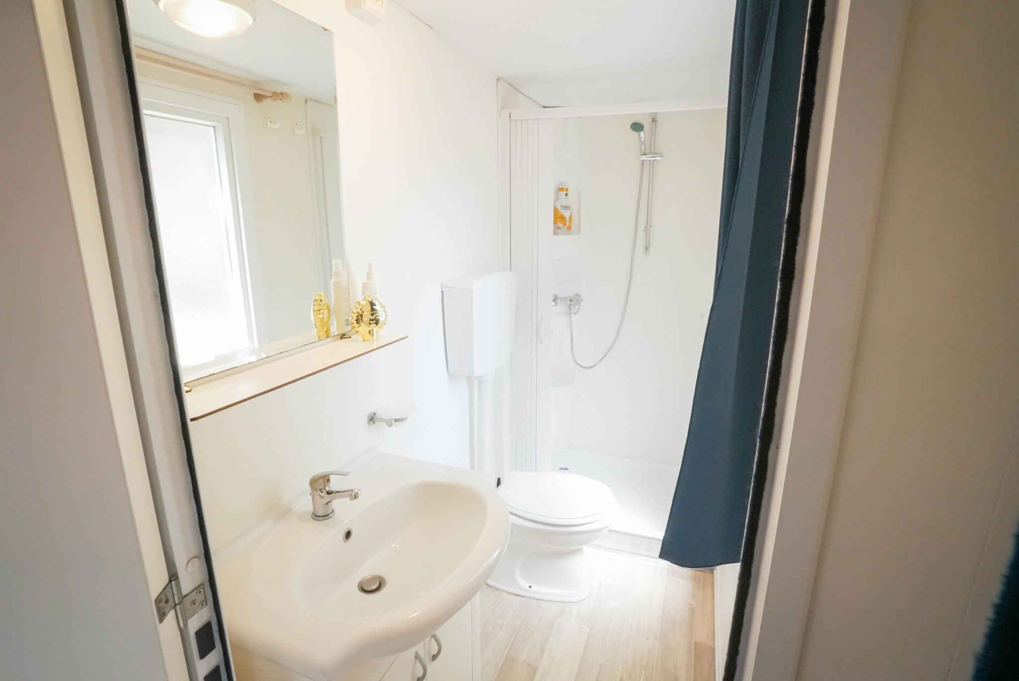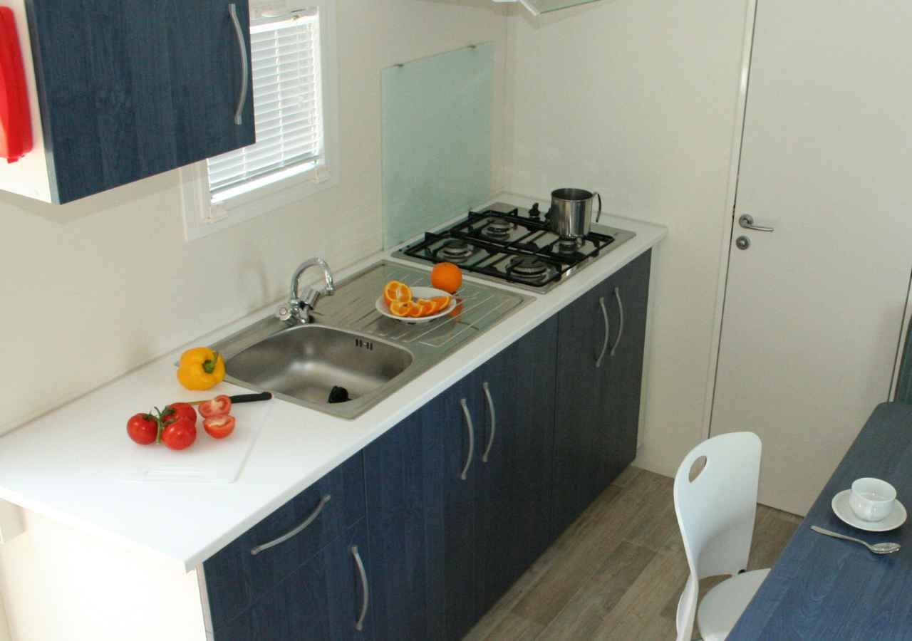 Ihr Mobilehome hat 1 Etage, 3 Zimmer (davon 2 Schlafzimmer), ist 24 qm groß und ist für maximal 5 Personen geeignet. Das Rauchen ist in Innenräumen nicht gestattet. Eine Klimaanlage sorgt an heißen Tagen für angenehme Temperaturen. Die Zimmer teilen sich wie folgt auf: Wohnzimmer mit 1 Zusatzbett auf Sitzecke und Essecke. Sie haben Zugang zur Terrasse mit Gartenmöbeln. Schlafzimmer mit 2 Einzelbetten. Schlafzimmer mit 1 Doppelbett. Kochecke im Wohnzimmer mit Gasherd (4 Flammen) und Kühlschrank (Eisfach). Bad mit Dusche, 1 Waschbecken und WC. Darüber hinaus ist Ihr Mobilehome mit Gitterbett und Kinderstuhl ausgestattet.