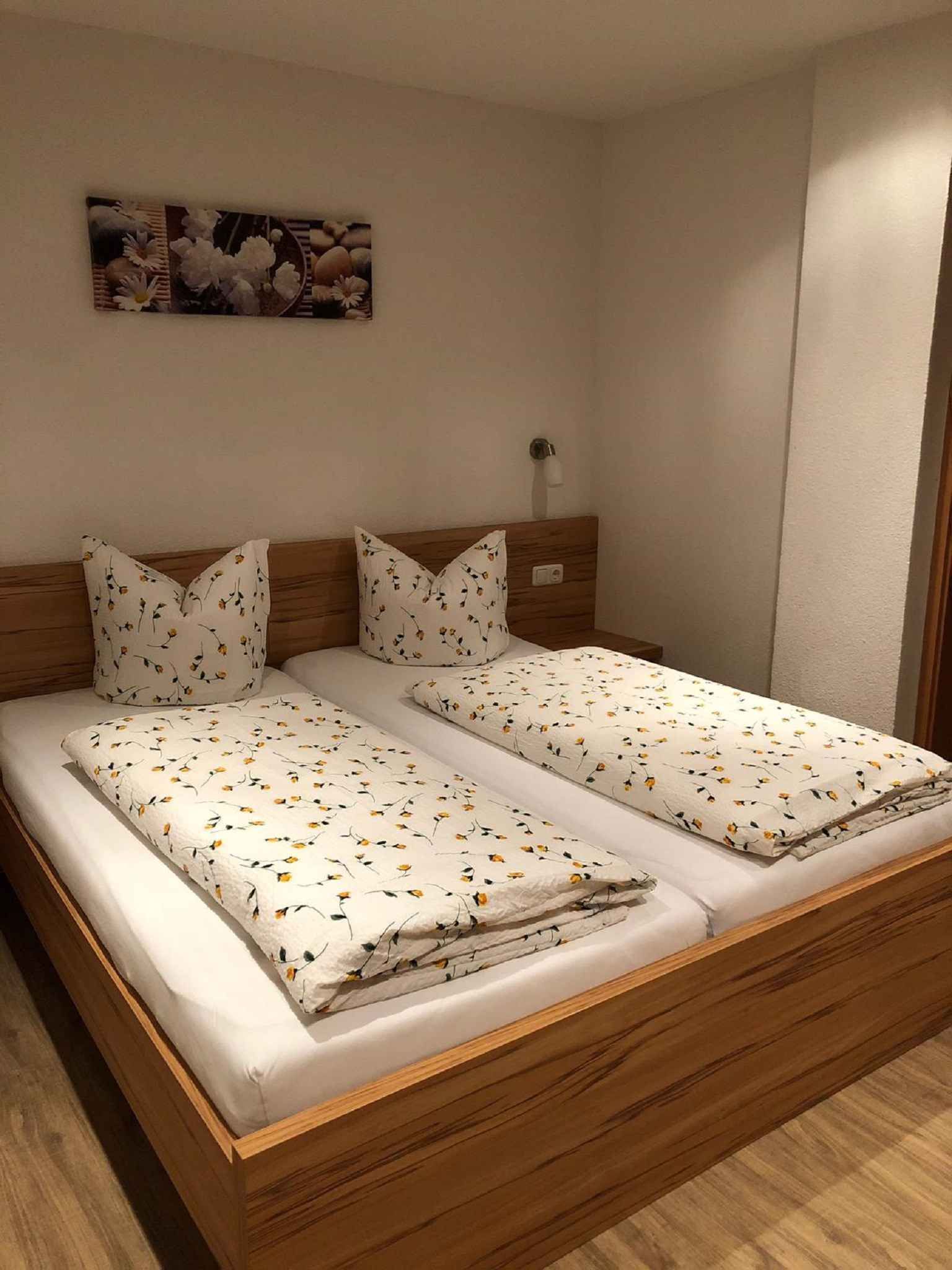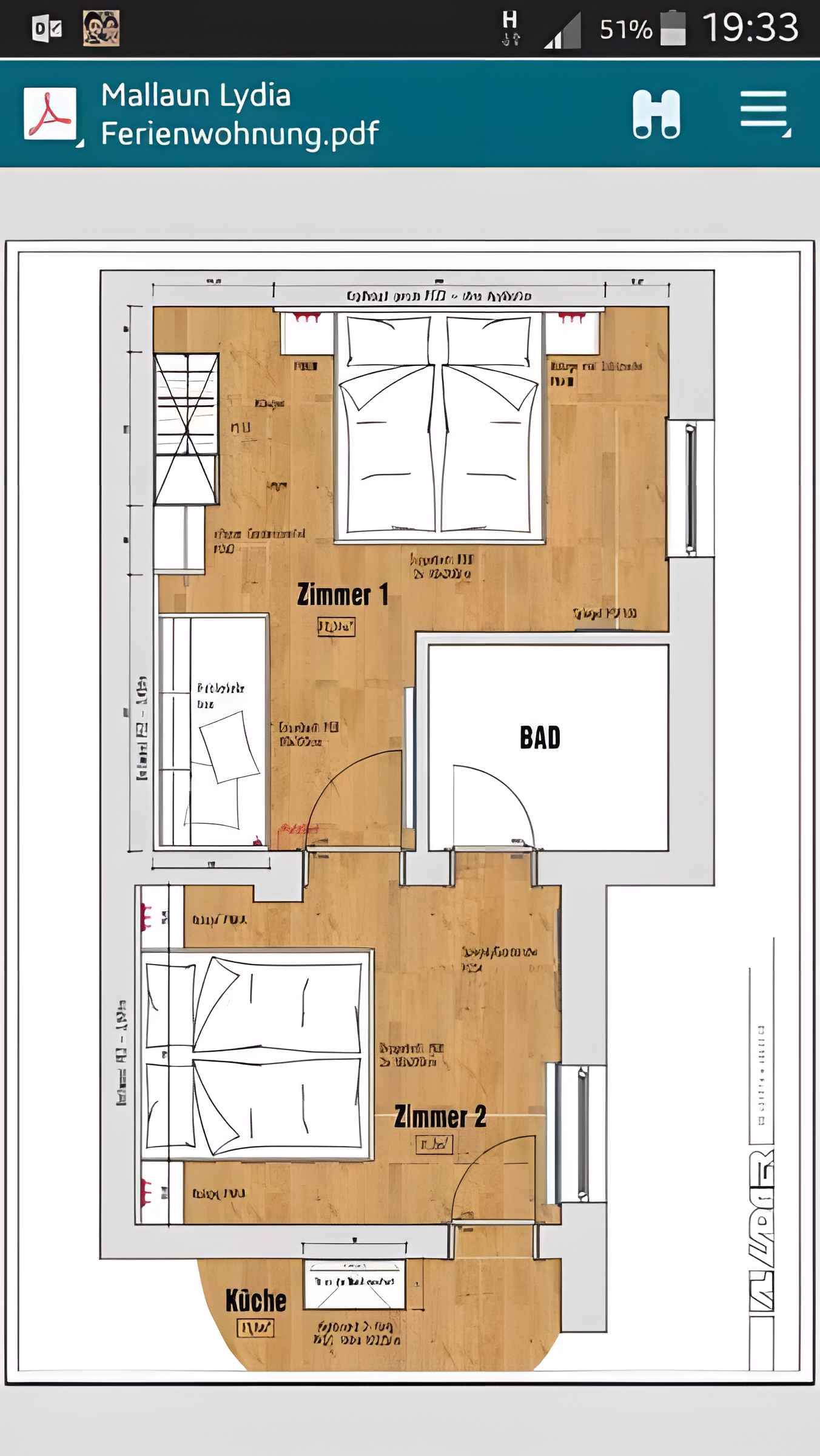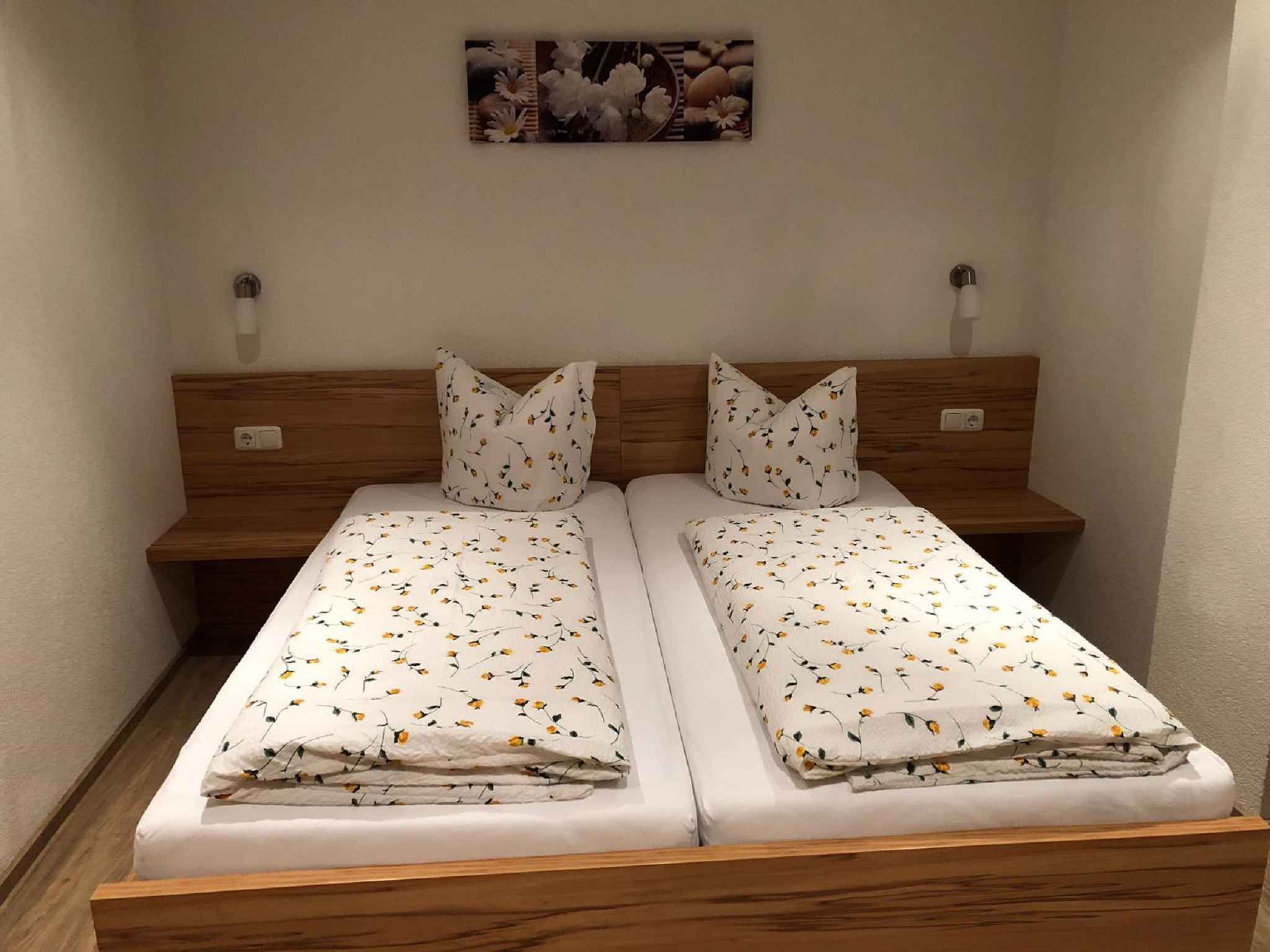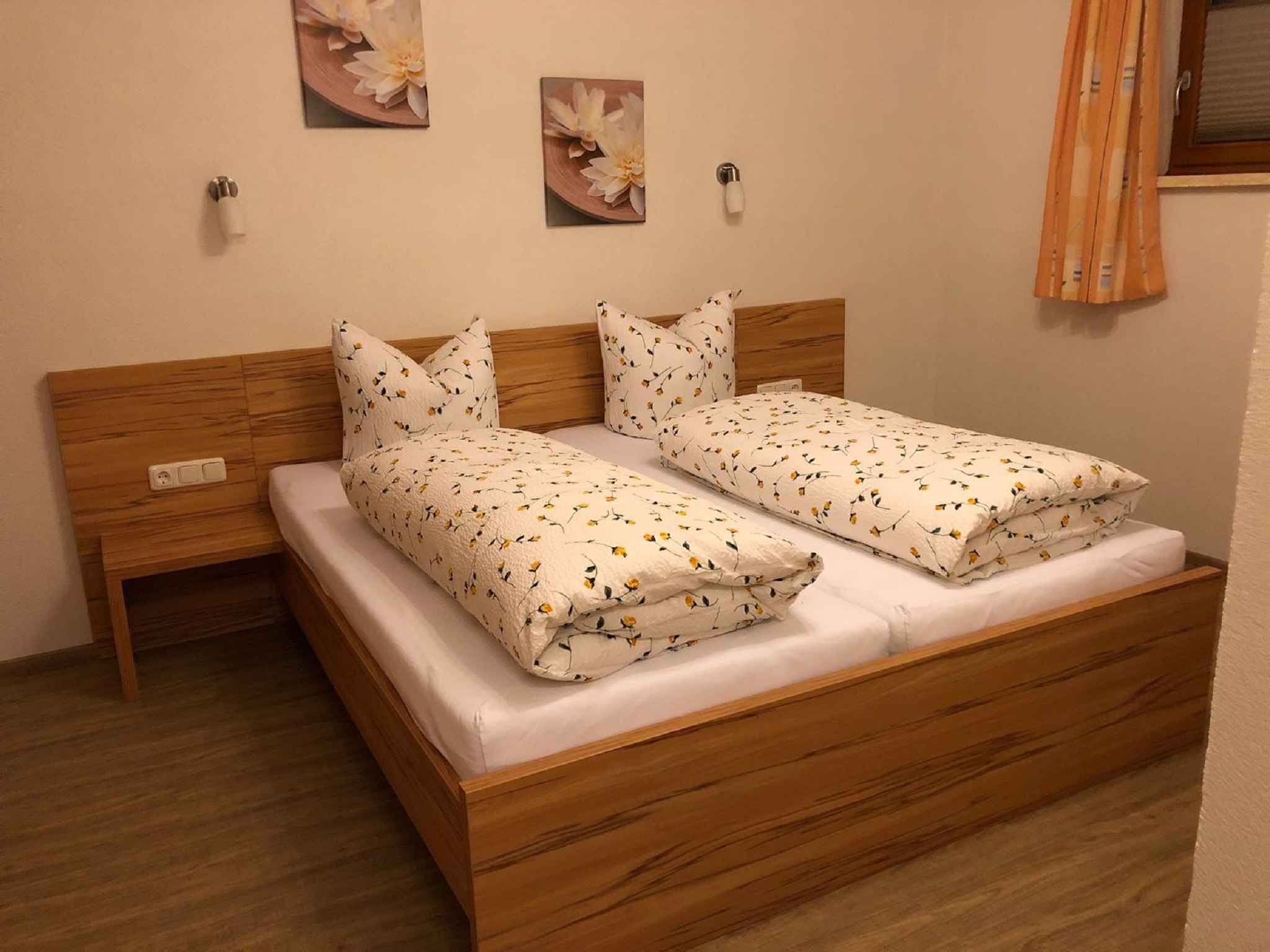 Ihre Ferienwohnung erstreckt sich über 1 Etage, 2 Zimmer (davon 2 Schlafzimmer), ist 50 qm groß und ist für maximal 5 Personen geeignet. An kälteren Tagen kann Ihre Ferienwohnung beheizt werden mit Zentralheizung (Öl, Holz/Kohle) und Fußbodenheizung. Das Rauchen ist in Innenräumen nicht gestattet. Der Eingang ist im Erdgeschoss und überdacht und führt über 3 Stufen und die Terrasse direkt in die Wohnküche. Es ist ein Großer Vorplatz vorhanden. Die Zimmer teilen sich wie folgt auf: Schlafzimmer mit 1 Doppelbett und 1 Einzelbett. Schlafzimmer als Durchgangszimmer und mit 1 Doppelbett und 1 Gitterbett. Küche in der Wohnküche als Durchgangszimmer und mit Essecke, TV, Geschirrspüler, Elektroherd (Cerankochfeld, 4 Platten), Backofen, Dunstabzugshaube, Kühlschrank (Eisfach), Mikrowelle, Kaffeemaschine, Toaster und elektrischem Wasserkocher. Die Essecke bietet Platz für 6 Personen. Bad mit Dusche, 1 Waschbecken, WC und Föhn. Darüber hinaus ist Ihre Ferienwohnung mit WLAN- Internetzugang, Gitterbett und Kinderstuhl ausgestattet. TV- bzw. Rundfunksender können nur in Landessprache per Kabel und Satellit empfangen werden.