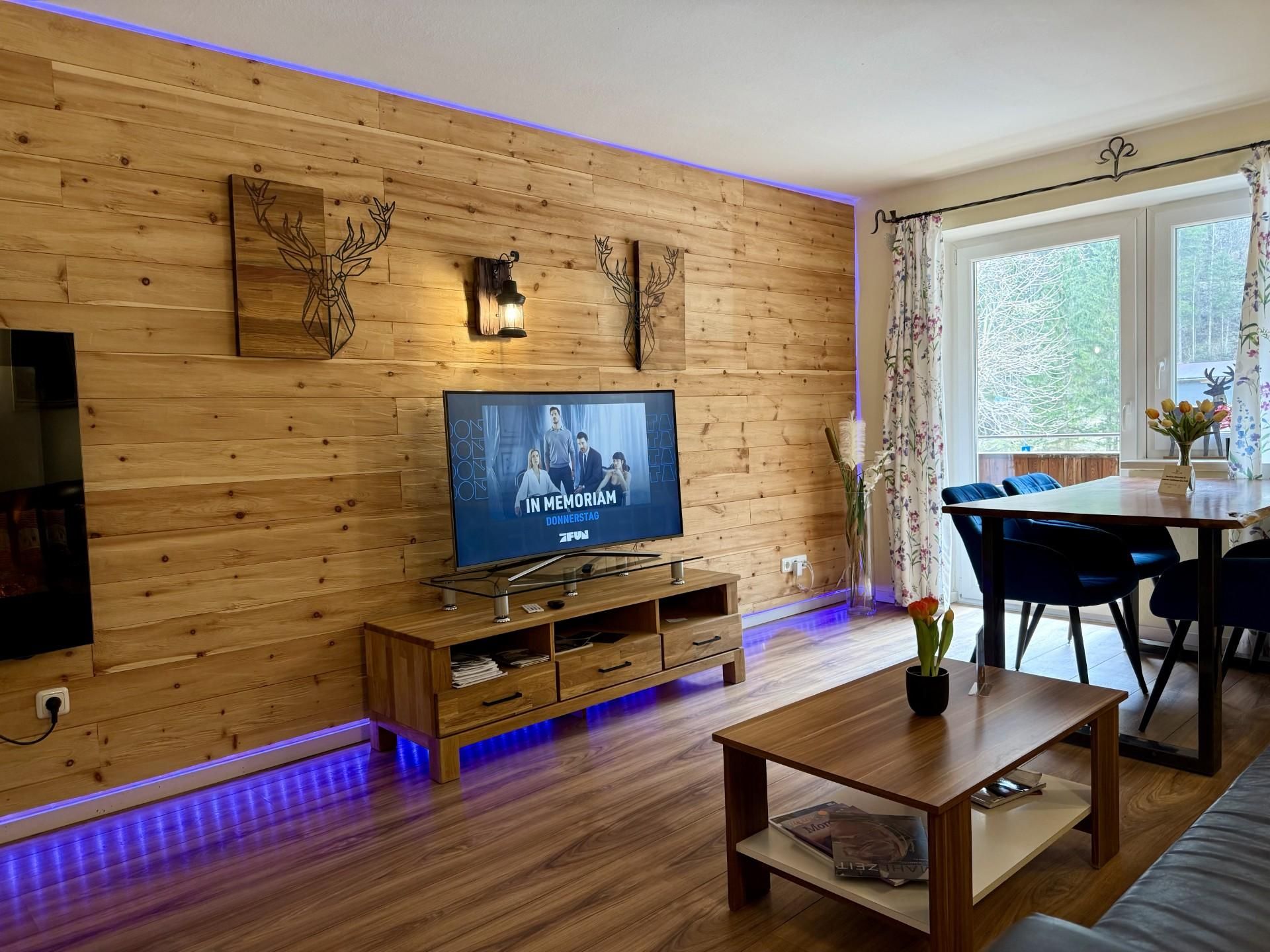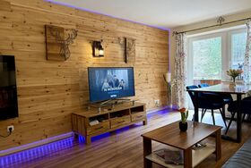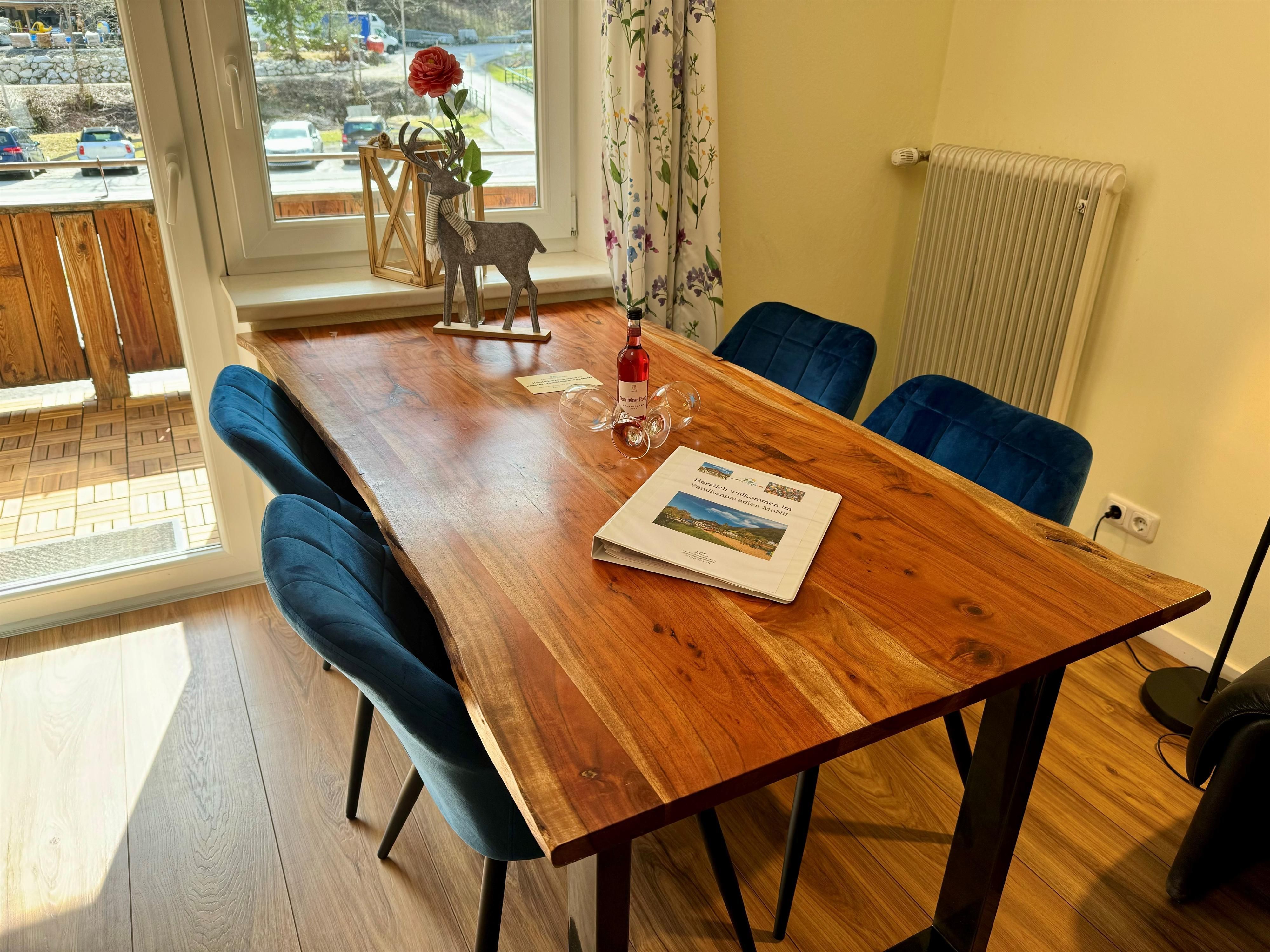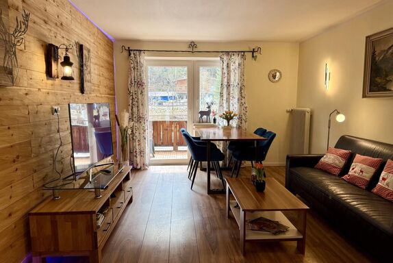Im lichtdurchfluteten Wohnzimmer mit Ledersofa, Medienbereich mit Flachbildfernseher und gemütlicher Essecke könnt ihr nicht nur bei schlechtem Wetter verweilen. Gratis WLAN steht euch hier und im gesamten Haus zur Verfügung. Der Elektrokamin sorgt für ein gemütliches Ambiente.