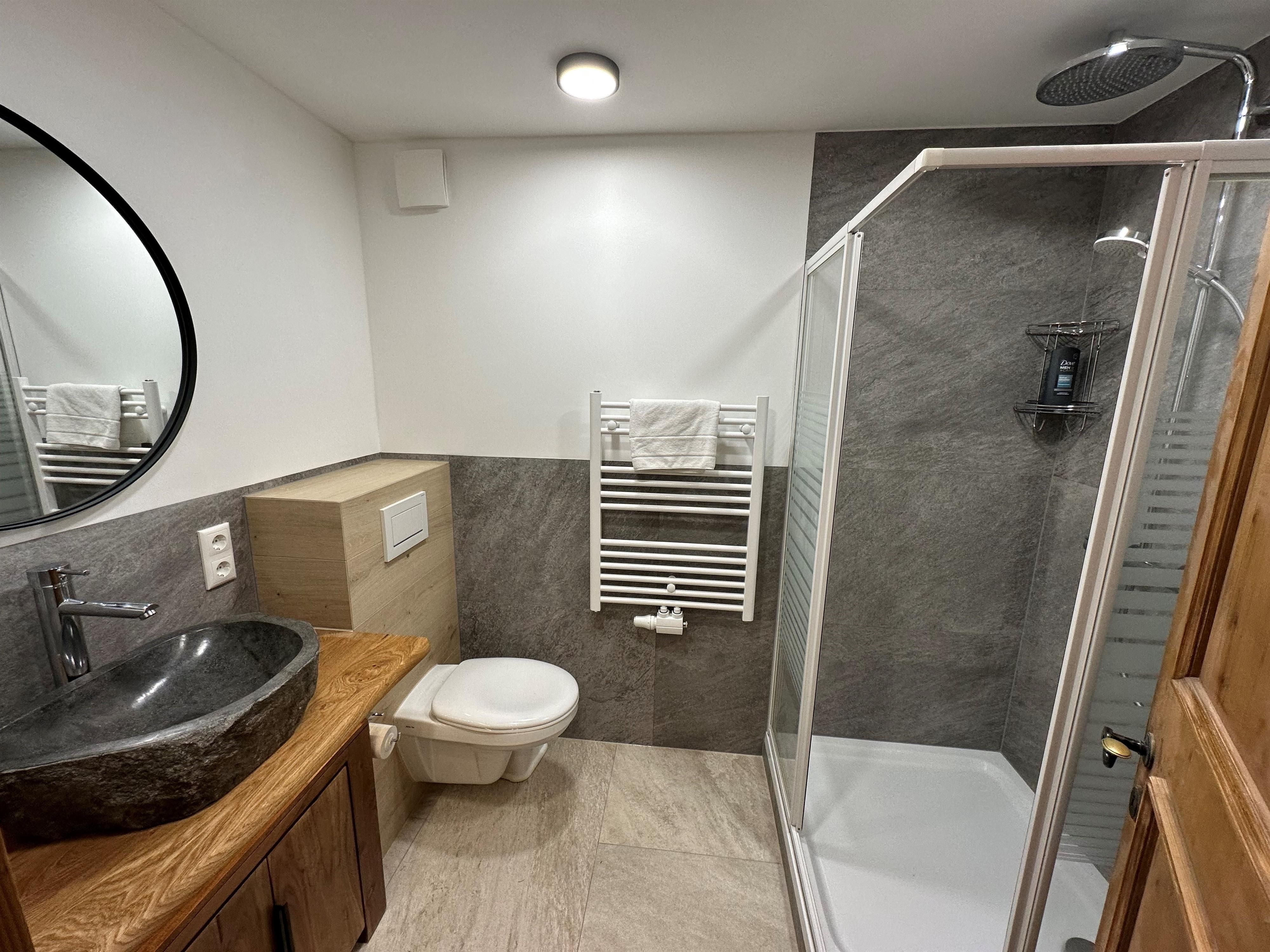 Ihr findet ein modernes und adäquat ausgestattetes Badezimmer mit Dusche, WC und Haartrockner vor.
