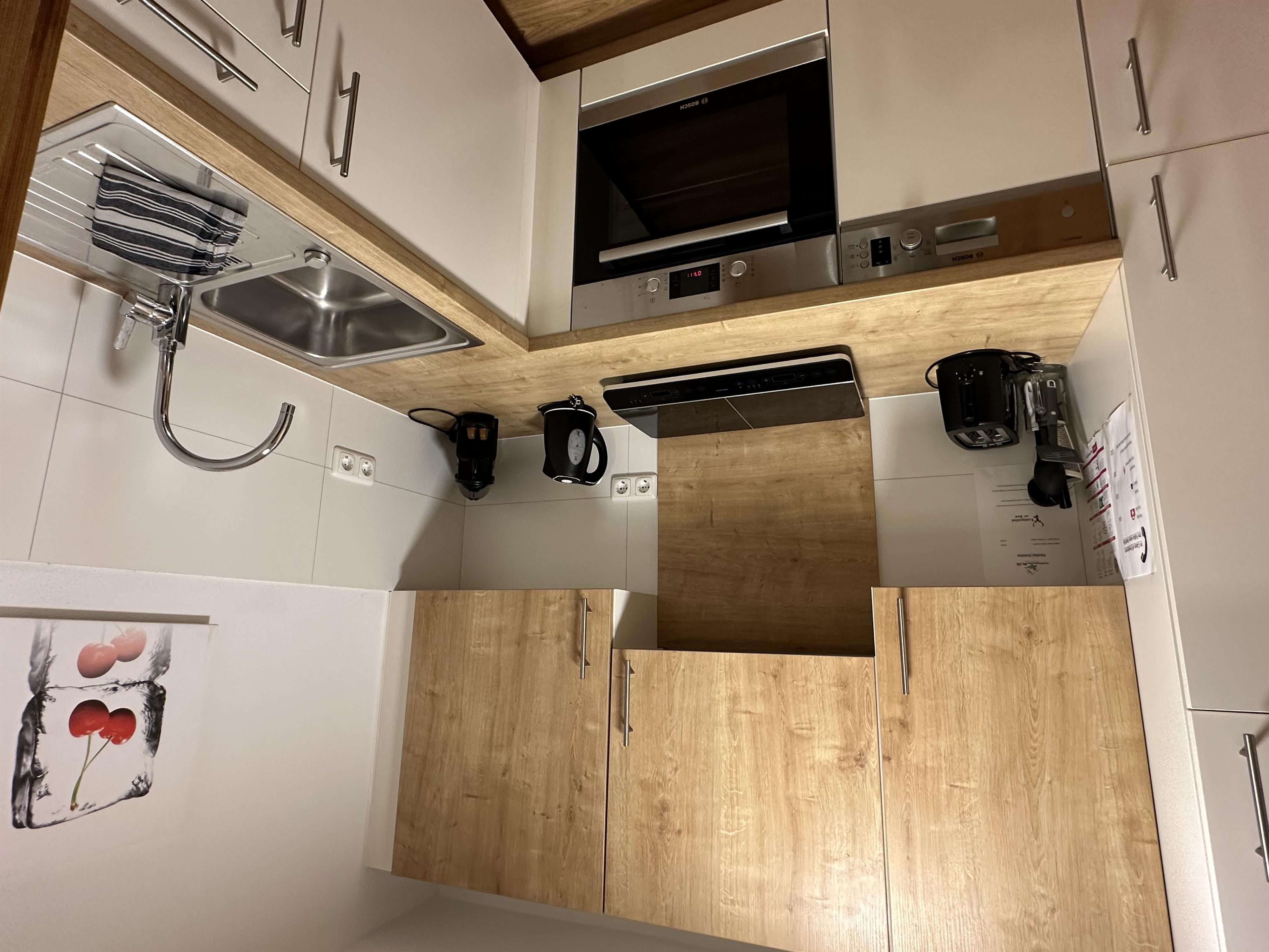 Die moderne und voll ausgestattete Küche verfügt u.a. über eine Spülmaschine, einen Backofen, einen E- Herd, einen Kühlschrank mit Gefrierfach, einen Wasserkocher, eine Nespressomaschine, einen Toaster und Geschirr.
