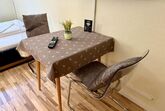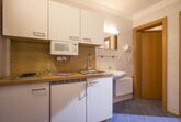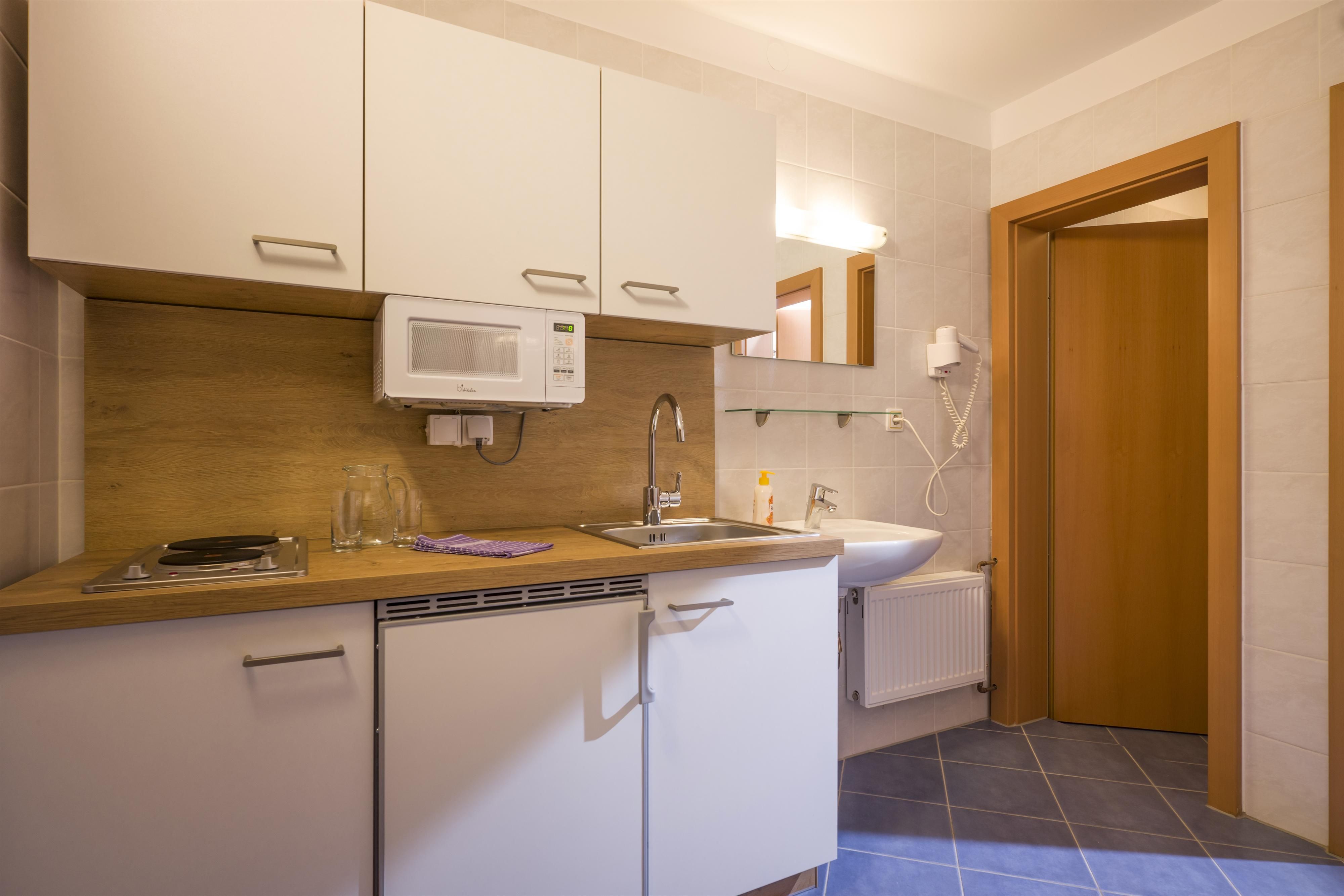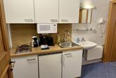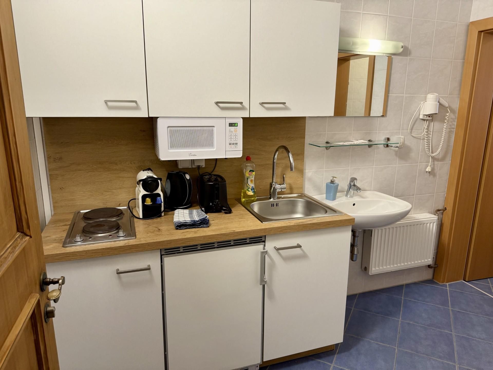 Die moderne und ausgestattete Küchenzeile verfügt über einen E-Herd, einen Kühlschrank mit Gefrierfach, einen Wasserkocher, eine Nespressomaschine, einen Toaster und Geschirr.