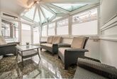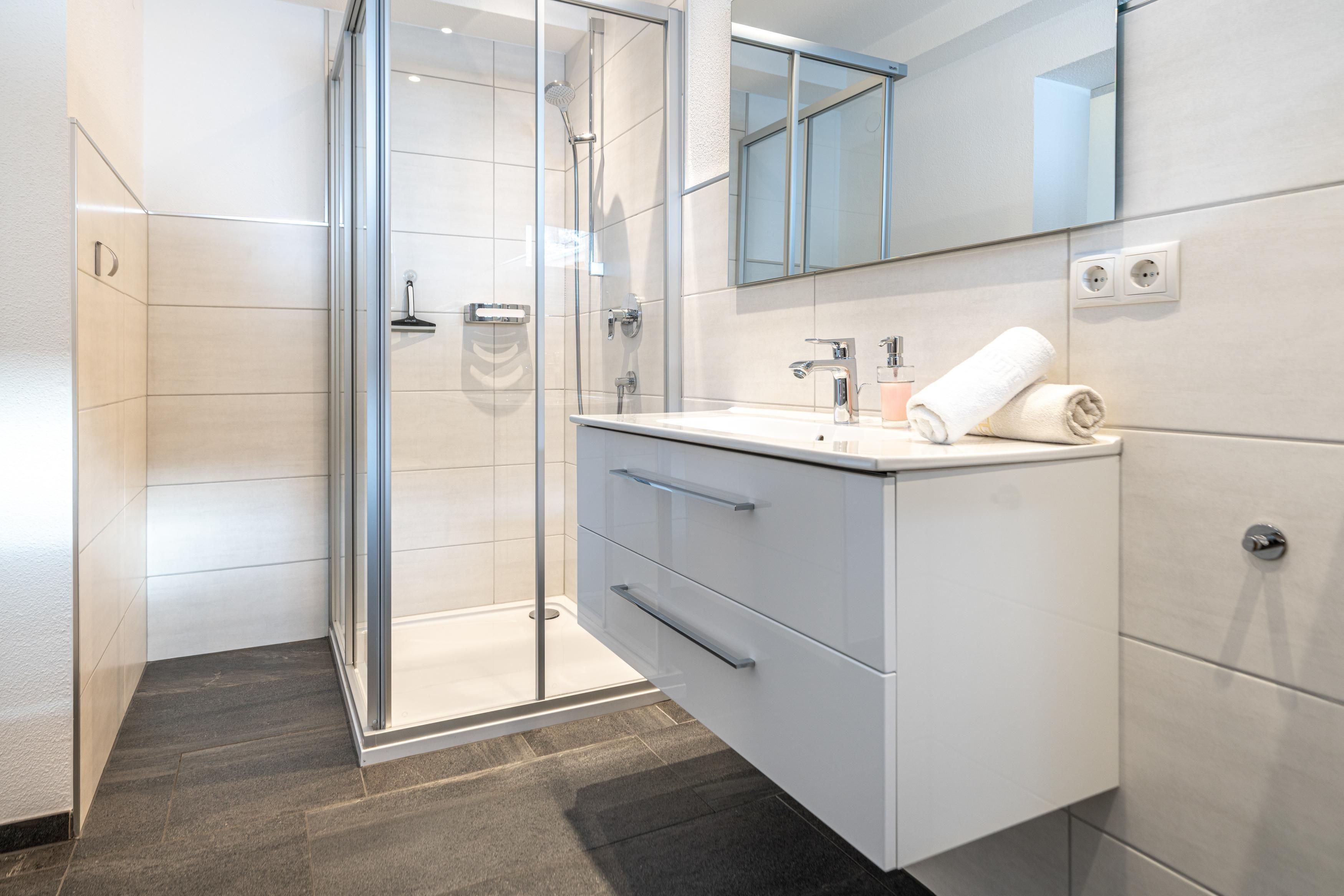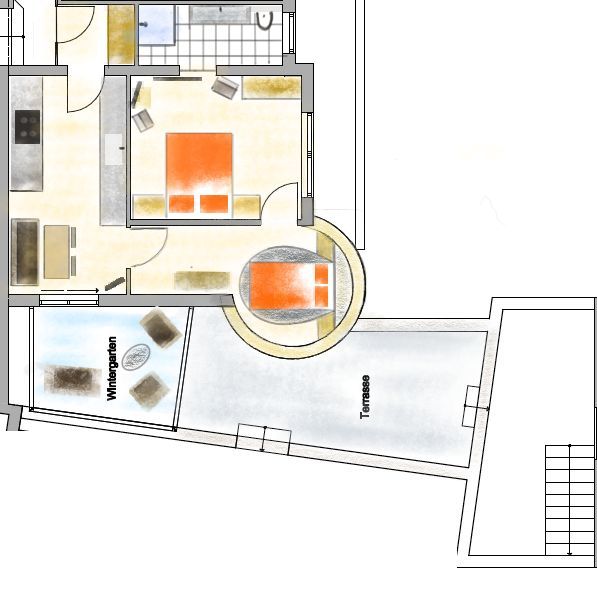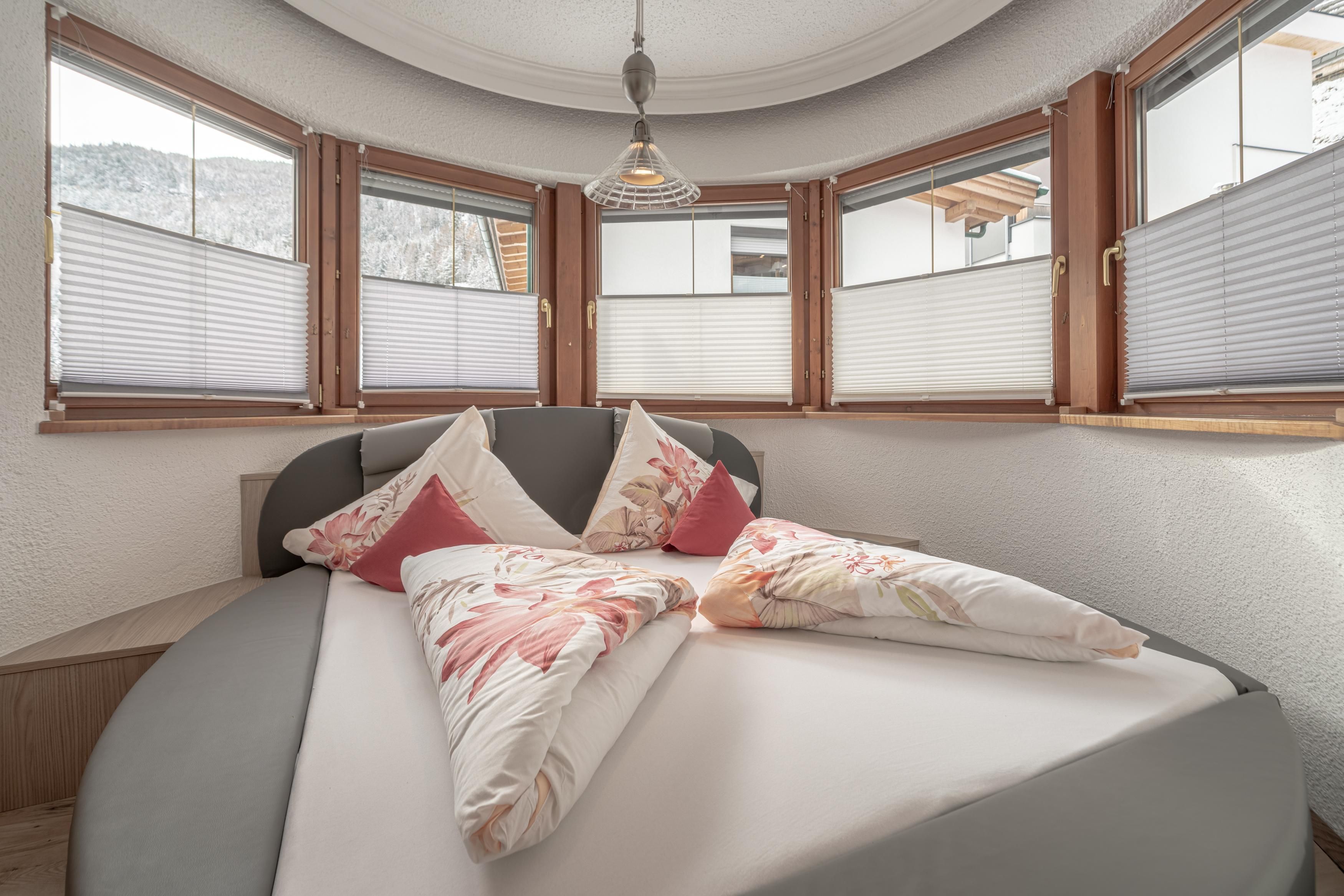 Großzügige Küche mit Sitzecke und TV. Die Küche ist komplett eingerichtet u.a. mit Kaffeemaschine, Toaster, Wasserkocher, Microwelle, 4 Plattenherd, Backofen, Geschirrspüler und Kühlschrank mit Tiefkühlfach. Weiteres gibt es noch einen Wintergarten mit großer Terrasse mit Blick auf die Berge und den Innenhof. Schlafzimmer 1: Doppelbett mit TV und Dusche mit WC. Dieses Zimmer erreicht man durch Schlafzimmer 2. Schlafzimmer 2: Doppelbett