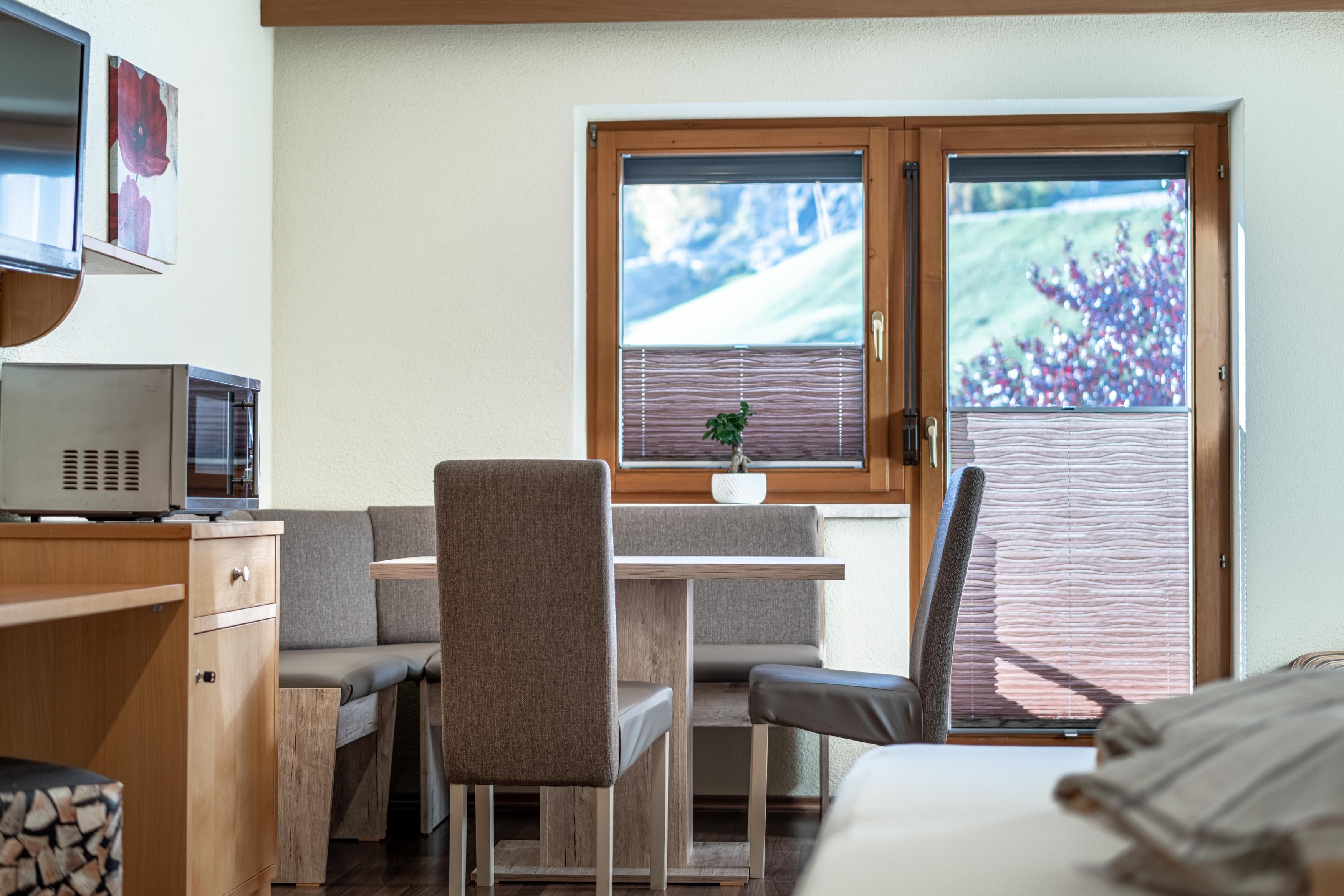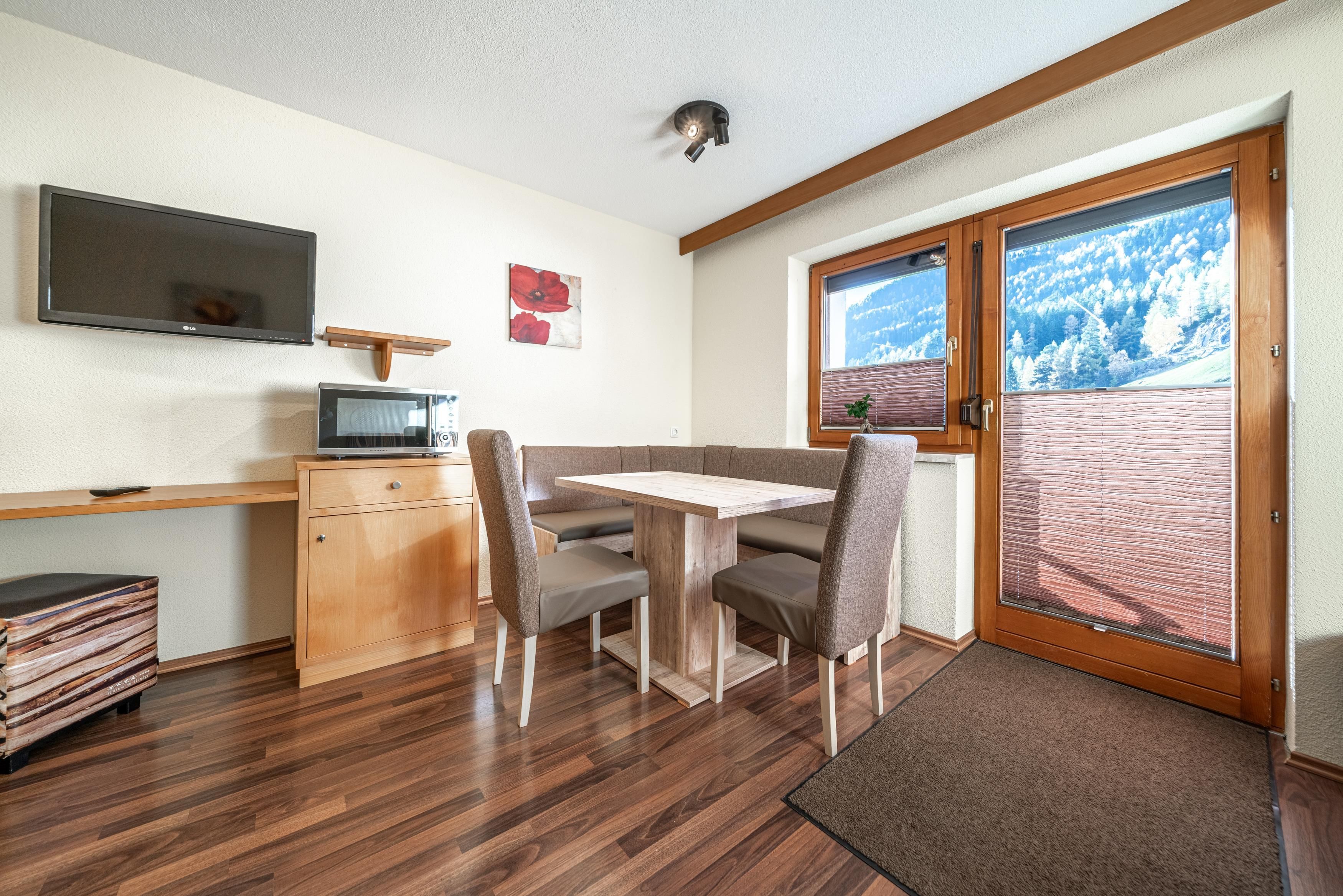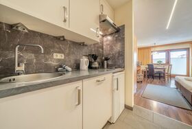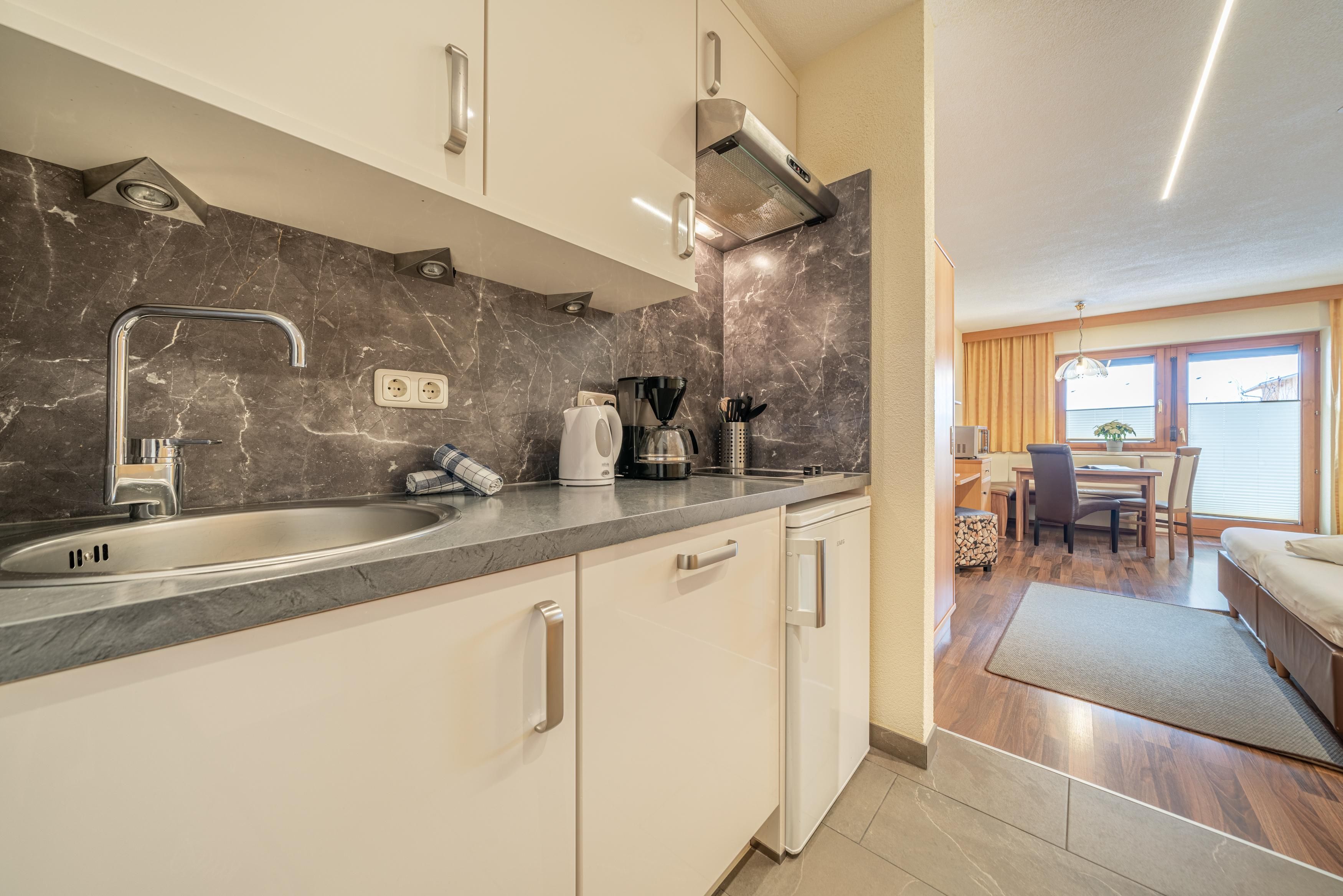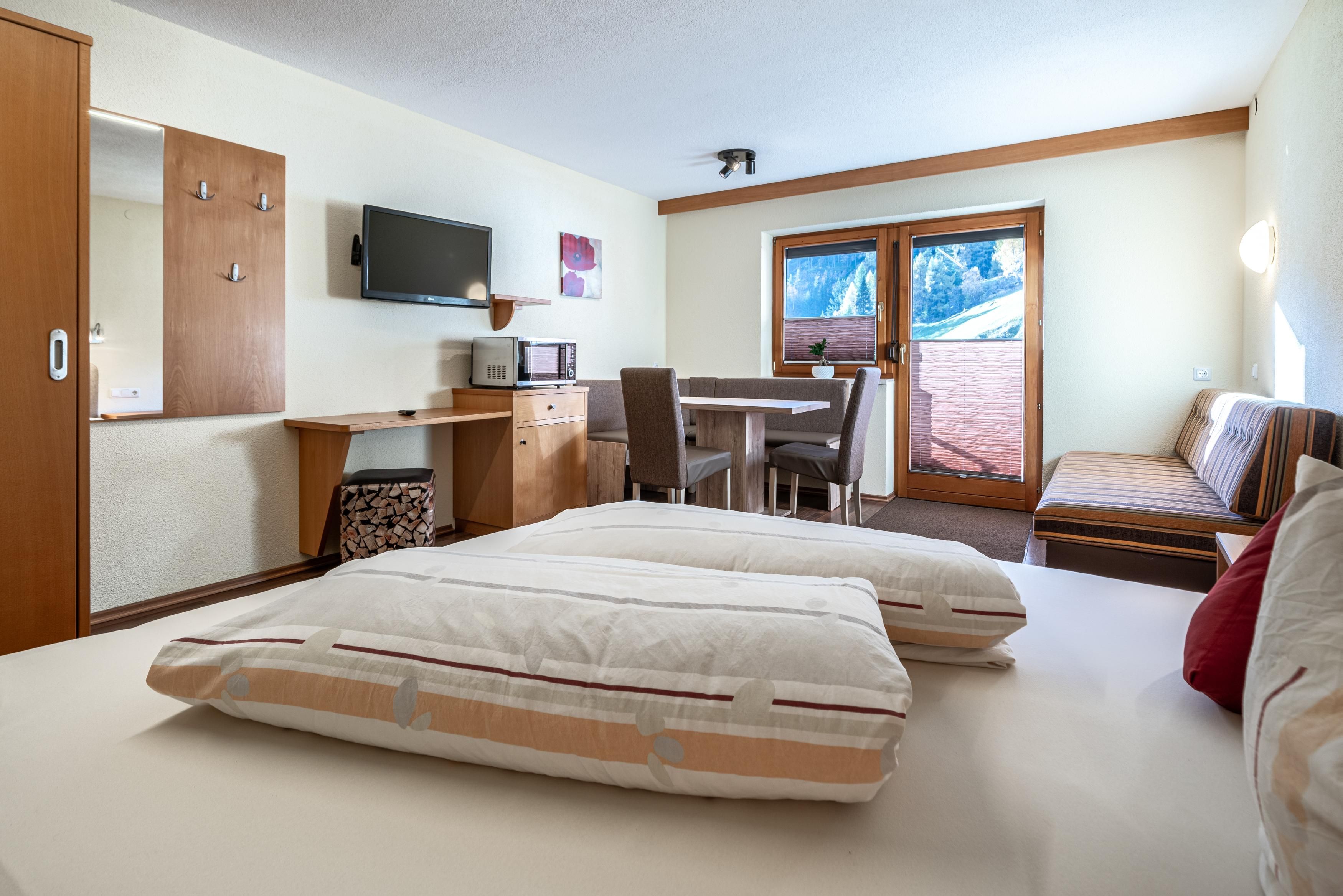 Dieses Studio verfügt über eine kleine Küche. Die Küche ist komplett eingerichtet u.a. mit Kaffeemaschine, Toaster, Wasserkocher, Microwelle, 2 Plattenherd, Geschirrspüler und Kühlschrank mit Tiefkühlfach. Twinbett und ein Schlafsofa (80 x 200 cm), TV, Dusche mit WC und gemütliche Sitzecke mit Aussicht auf die Berge mit Südbalkon.