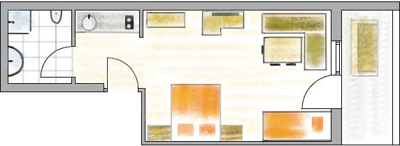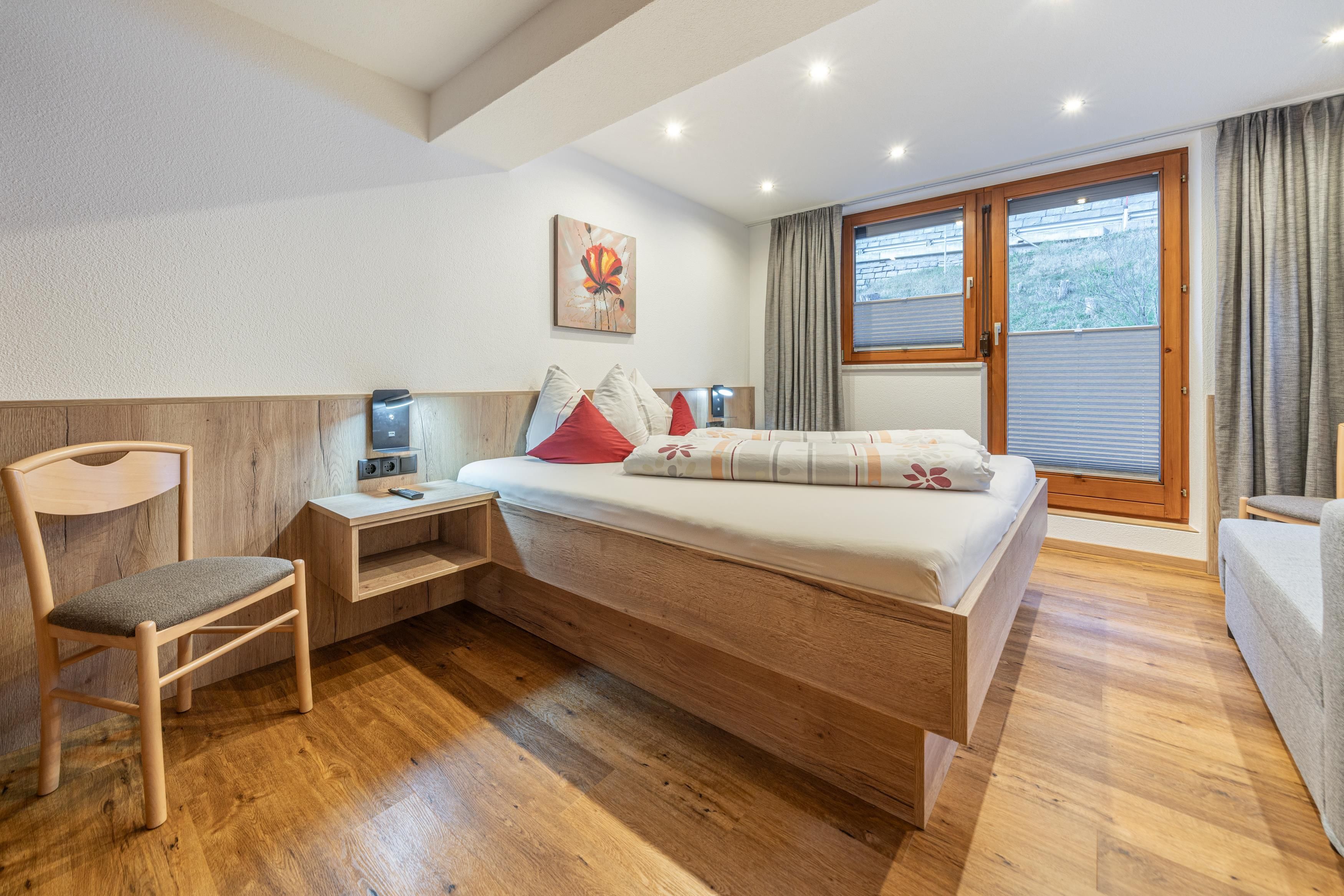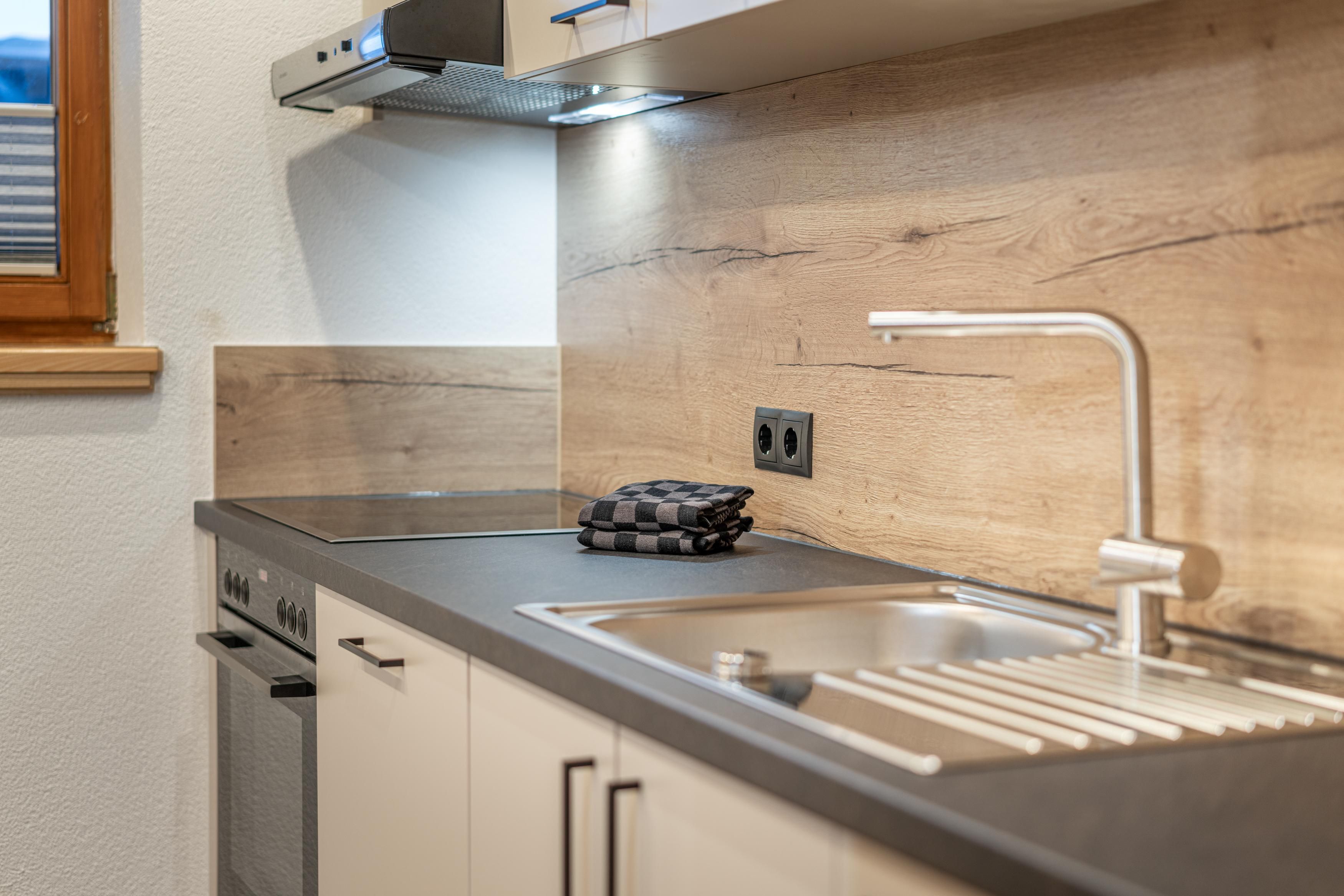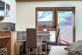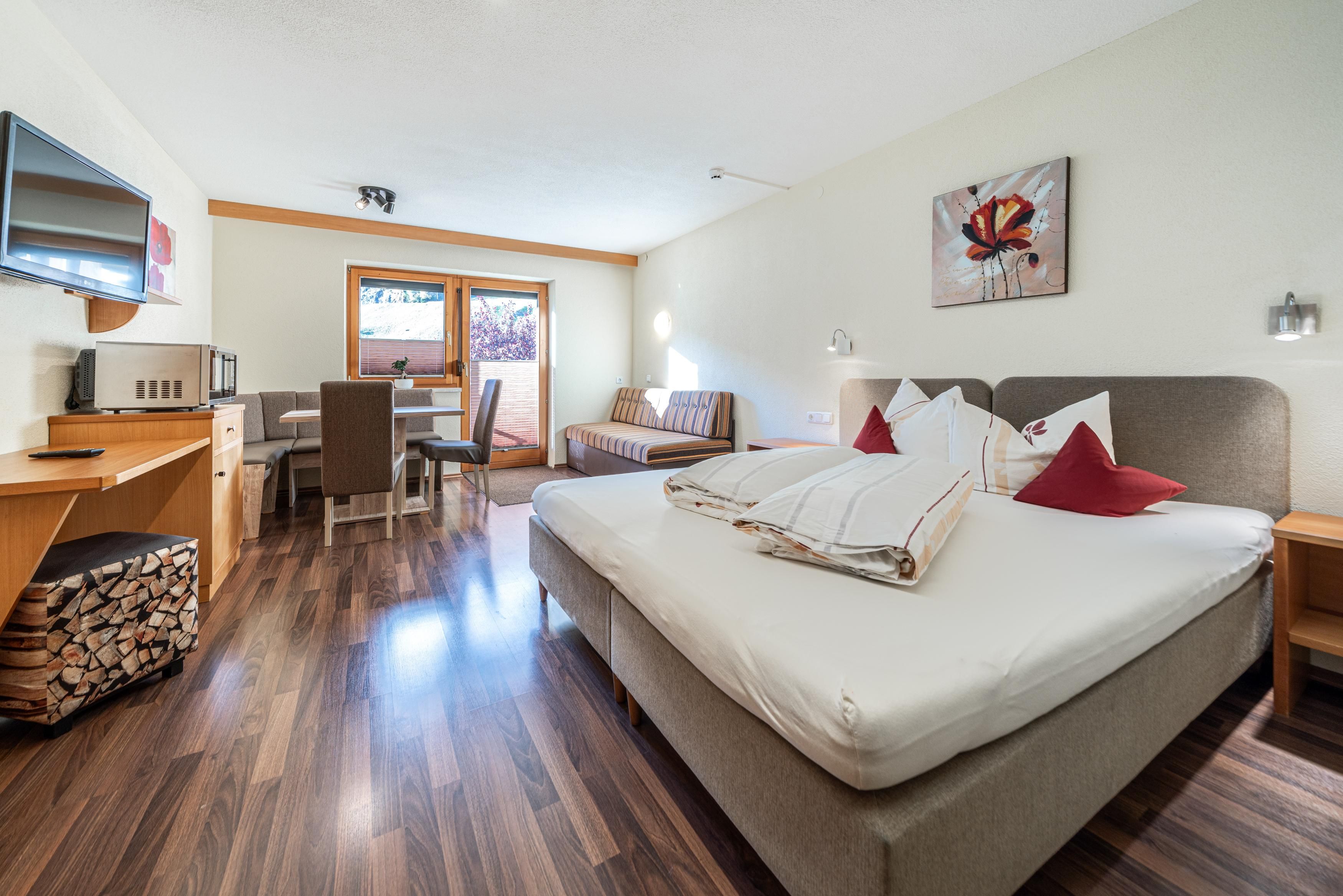 Dieses Studio verfügt über eine kleine Küche. Die Küche ist komplett eingerichtet u.a. mit Kaffeemaschine, Toaster, Wasserkocher, Microwelle, 2 Plattenherd, Geschirrspüler und Kühlschrank mit Tiefkühlfach. Twinbett und ein Schlafsofa (80 x 200 cm), TV, Dusche mit WC und gemütliche Sitzecke mit Aussicht auf die Berge mit Südbalkon.