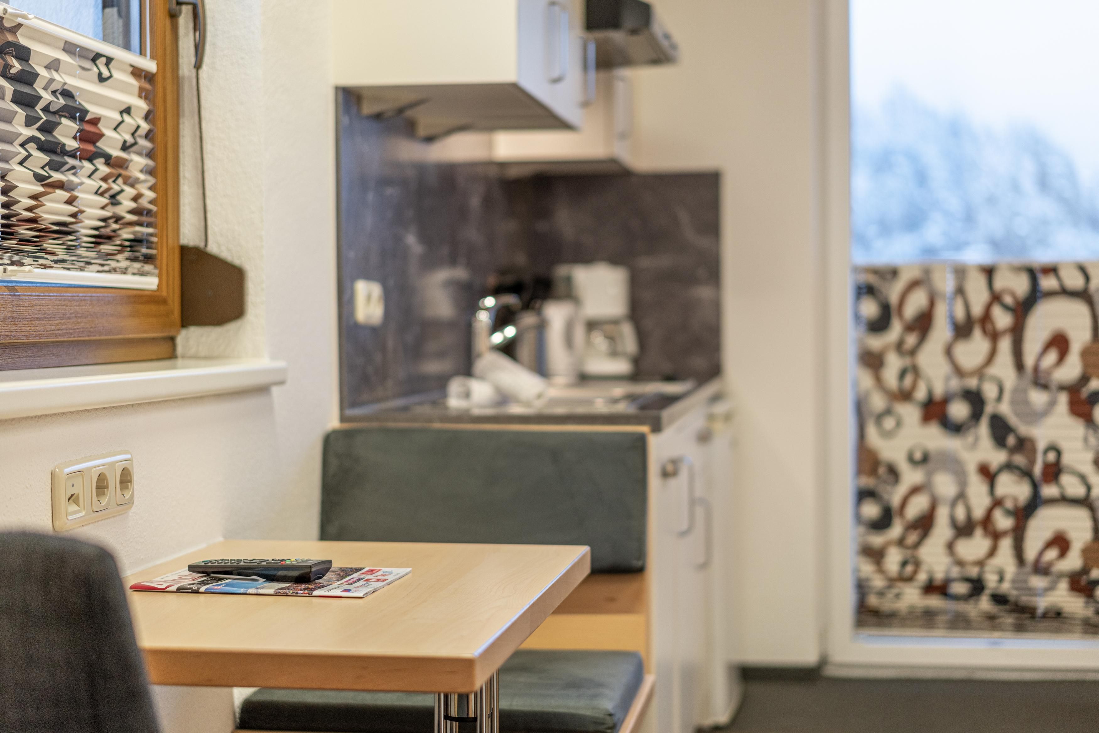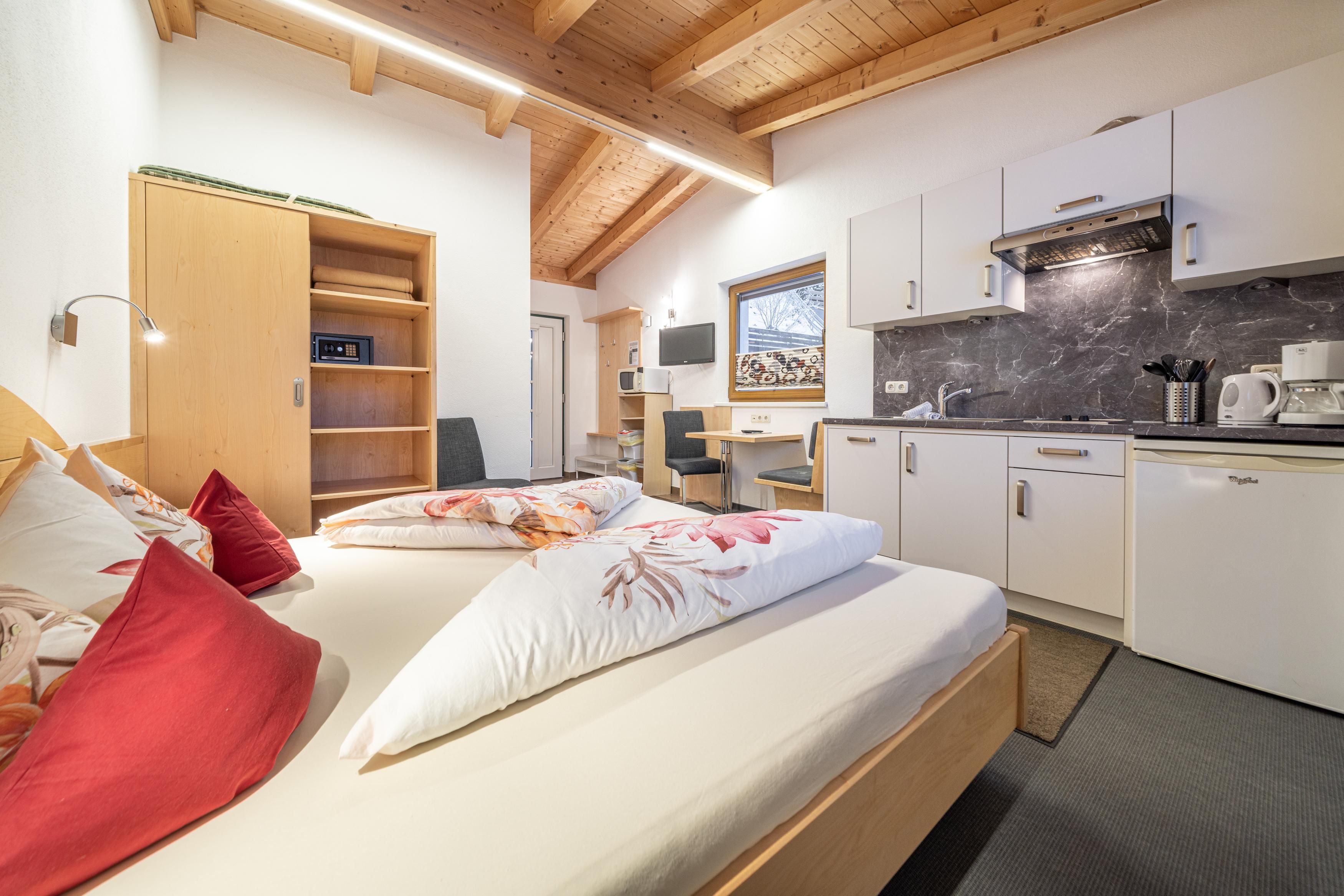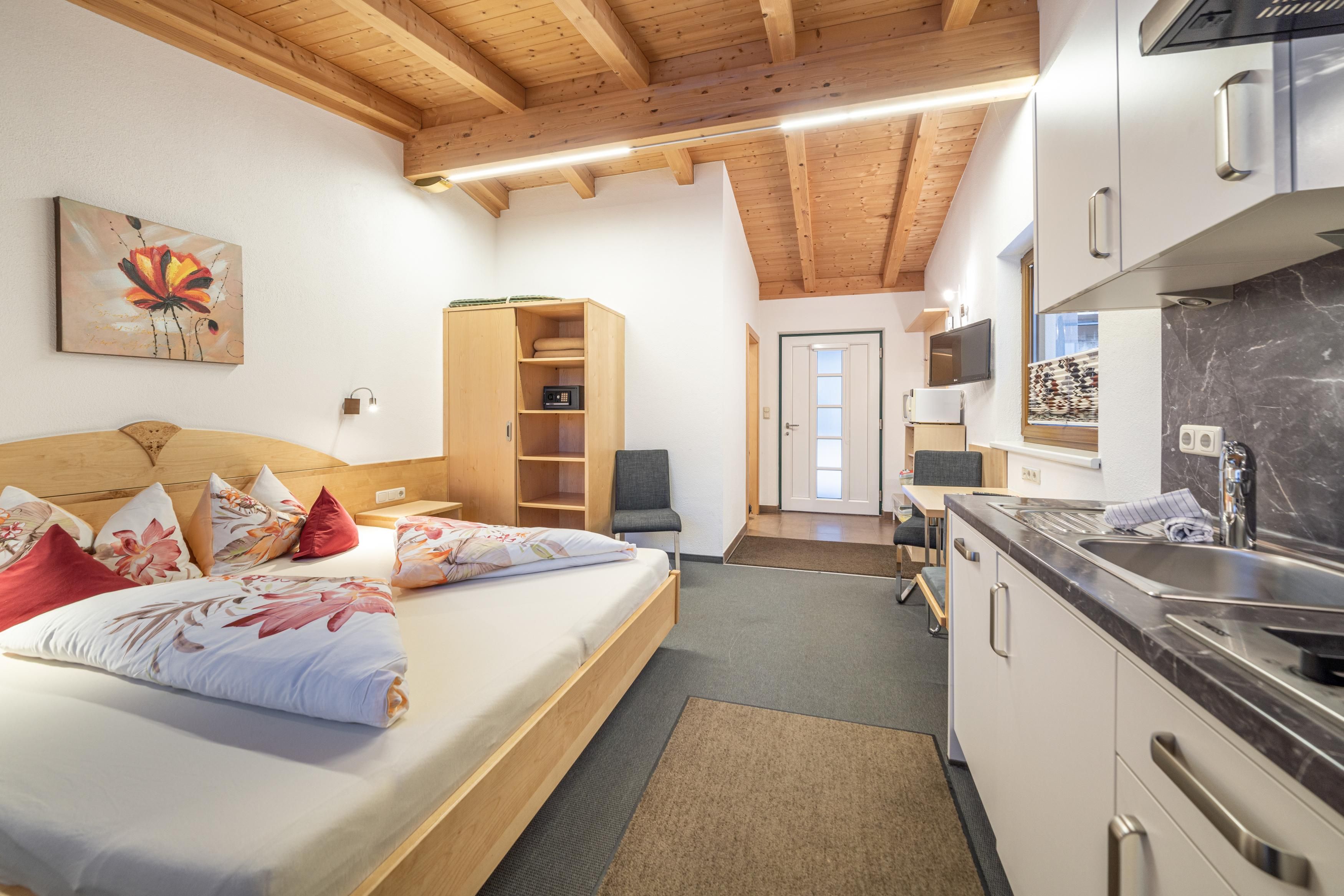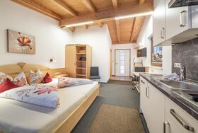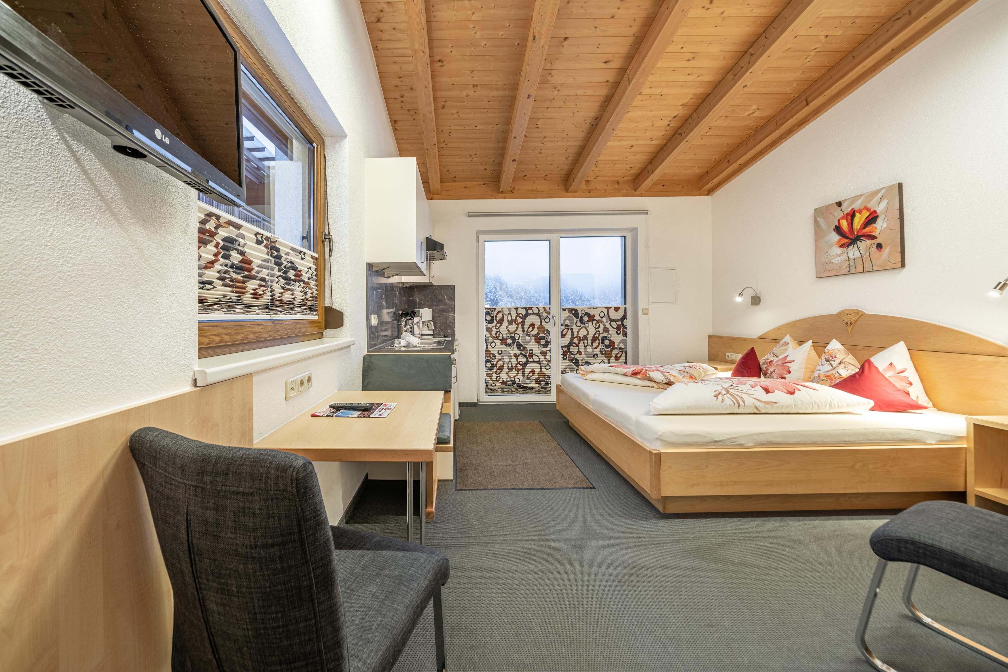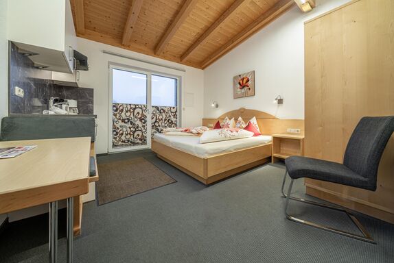 Studio mit eigenen Eingang vom Parkplatz aus. Dieses Studio verfügt über eine kleine Küche. Die Küche ist komplett eingerichtet u.a. mit Kaffeemaschine, Toaster, Wasserkocher, Microwelle, 2 Plattenherd, Geschirrspüler und Kühlschrank mit Tiefkühlfach. Doppelbett, Badezimmer mit Dusche/WC, Vorraum mit Garderobe und Balkon mit Ausblick zu den Söldener Bergen. Dieses Studio ist barrierefrei. Das Appartementhaus mit dem Wellnessbereich hat keinen Aufzug und ist aus diesem Grund nicht barrierefrei.
