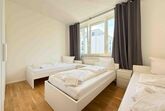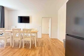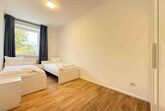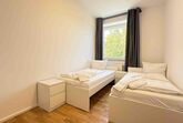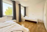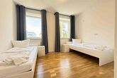 Die möblierte 90 m² große Obergeschosswohnung in Amberg umfasst drei Schlafzimmer mit sieben Einzelbetten und ist für bis zu sieben Personen geeignet.