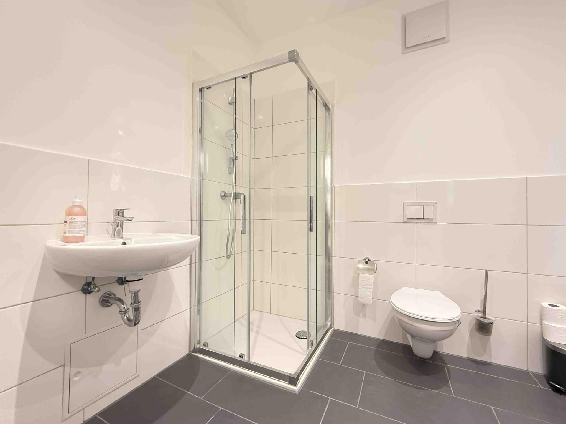 Das Badezimmer besteht aus einer Dusche/Badewanne, Toilette und einem Waschbecken.