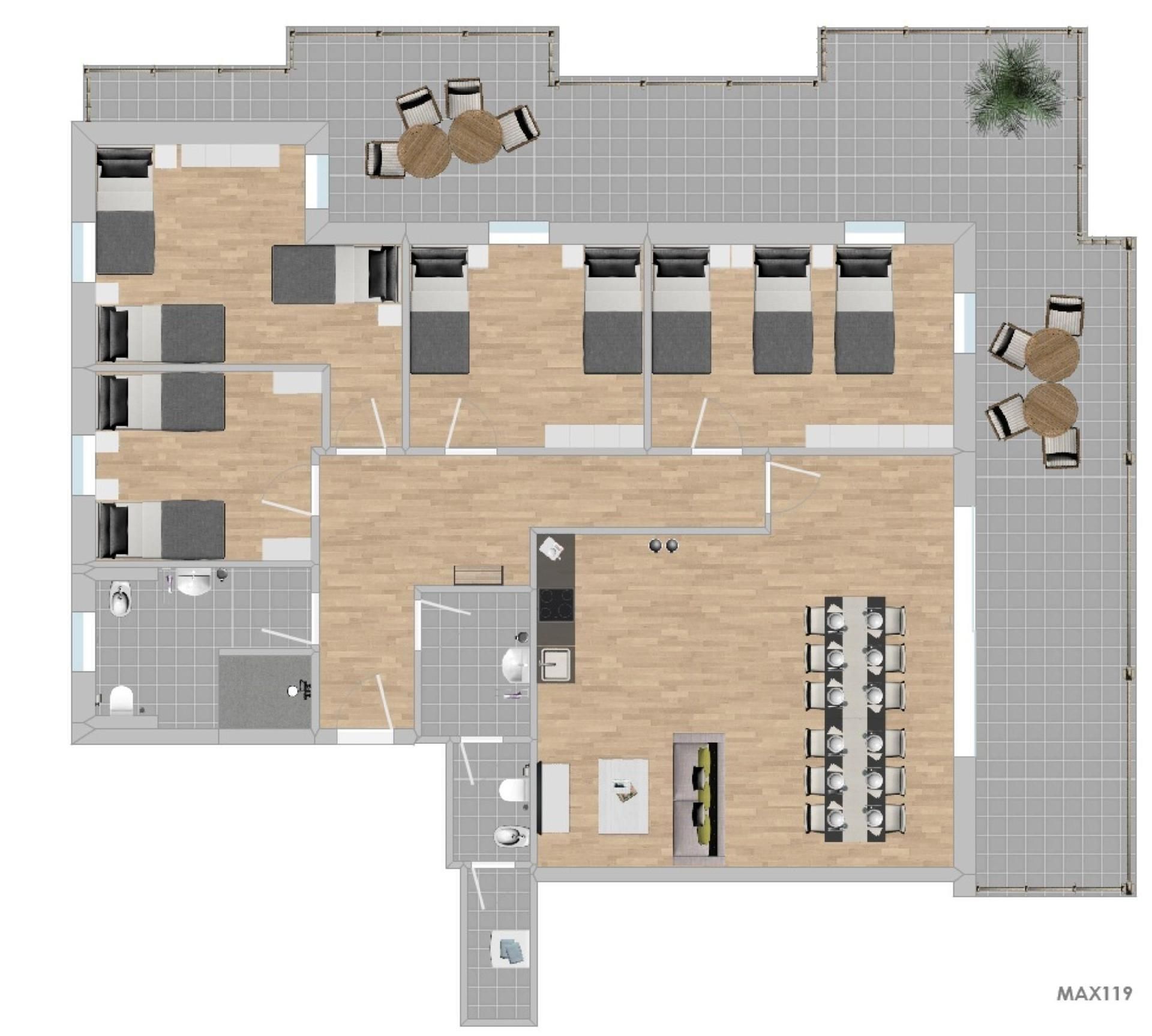 Auf dem Grundriss der Unterkunft können Sie die genaue Zimmer- und Bettenaufteilung sehen.