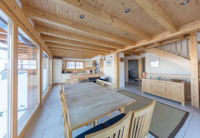 Essbereich mit Zugang zur Terrasse und zum Garten des Chalets sowie zum Whirlpool mit Holz. Barbecue.