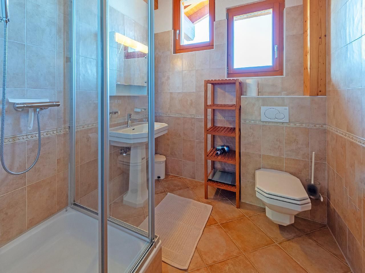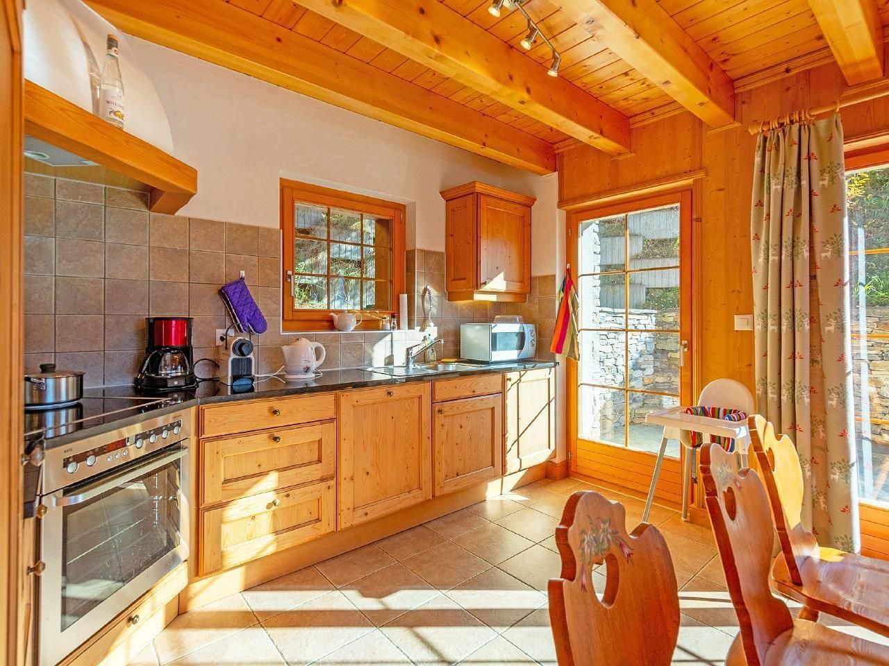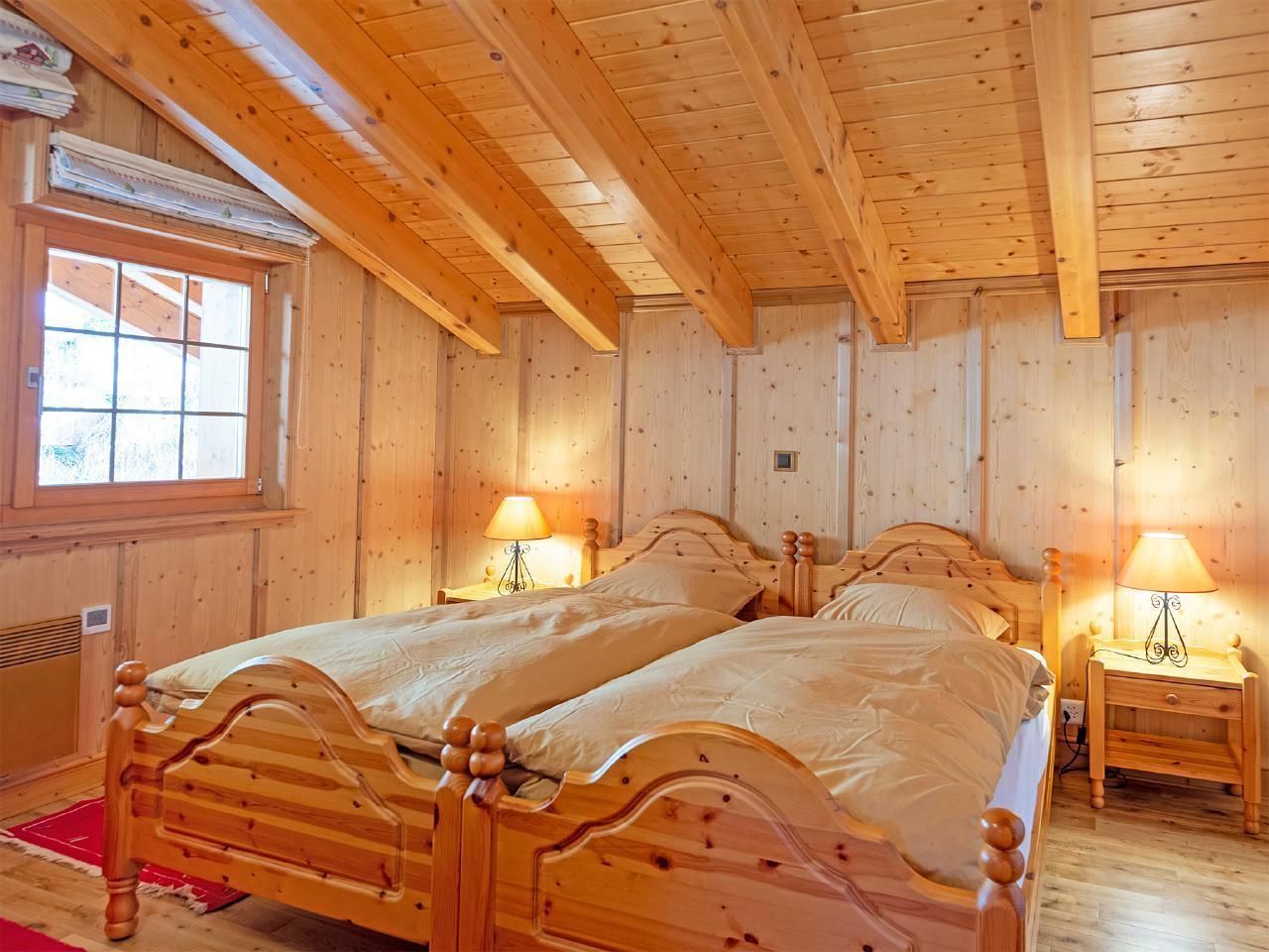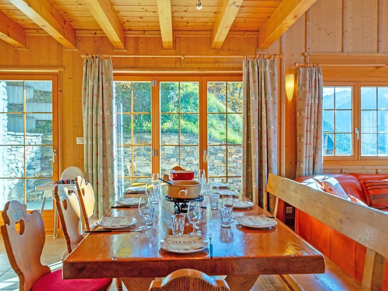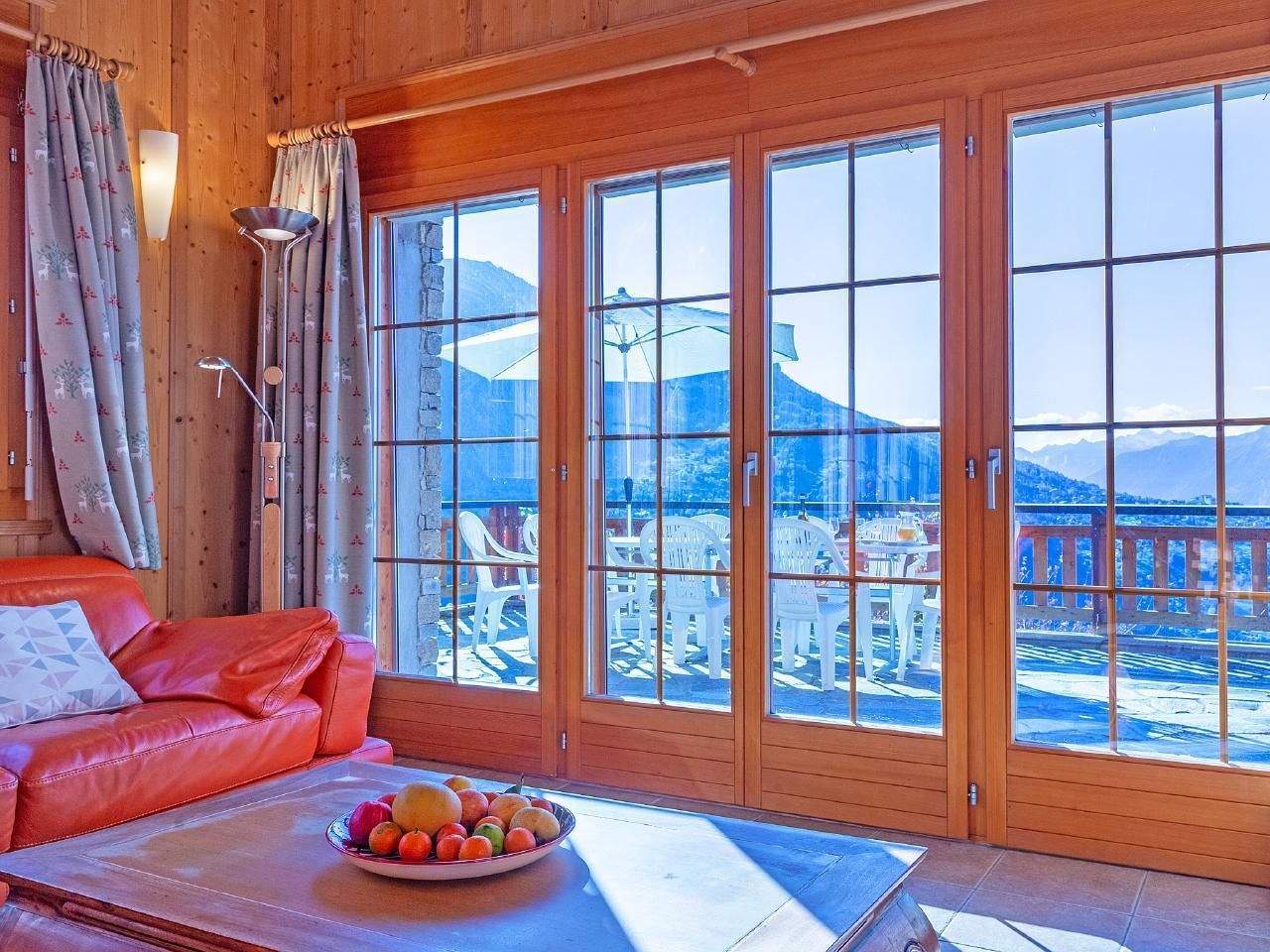 Gemütliches Chalet auf zwei Etagen mit fünf Schlafzimmern, Kamin und Gratis-WLAN. Eine große Terrasse mit Süd-West-Ausrichtung steht Ihnen ebenfalls zur Verfügung, ideal um den Sonnenuntergang zu bewundern und die verschneite Landschaft zu genießen. Im Erdgeschoss befindet sich die voll ausgestattete Küche mit Esstisch, an dem alle Gäste bequem Platz finden können. Heller Wohnbereich mit Panoramafenstern sowie bequemen Sofas vor dem offenen Kamin. Auf derselben Etage befinden sich zwei Schlafzimmer, eines mit zwei Einzelbetten (zum Doppelbett verbindbar) und ein Schlafzimmer mit einem Einzelbett (mit Schreibtisch). Ebenfalls auf dieser Etage befindet sich ein Badezimmer mit Dusche und WC. Vom Wohnzimmer aus haben Sie Zugang zur großen Terrasse mit Gartenmöbeln, hier können Sie nach einem Tag auf der Piste einen Aperitif genießen.