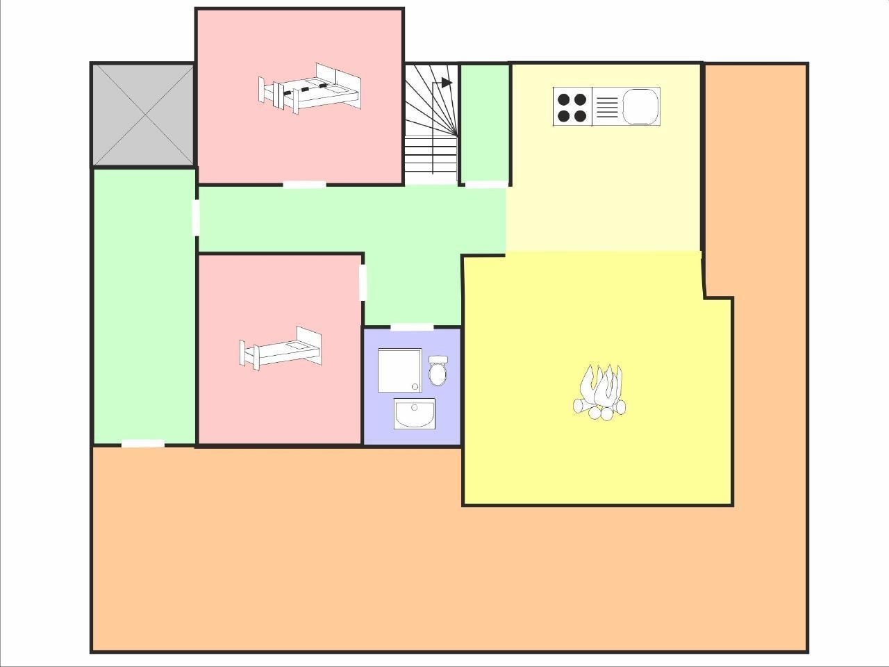 Auf der 1. Etage befinden sich 3 Schlafzimmer mit je zwei Einzelbetten (zum Doppelbett verbindbar) sowie ein Badezimmer mit Badewanne und ein Badezimmer mit Dusche. Alle Betten haben die Maße 90 x 200 cm.