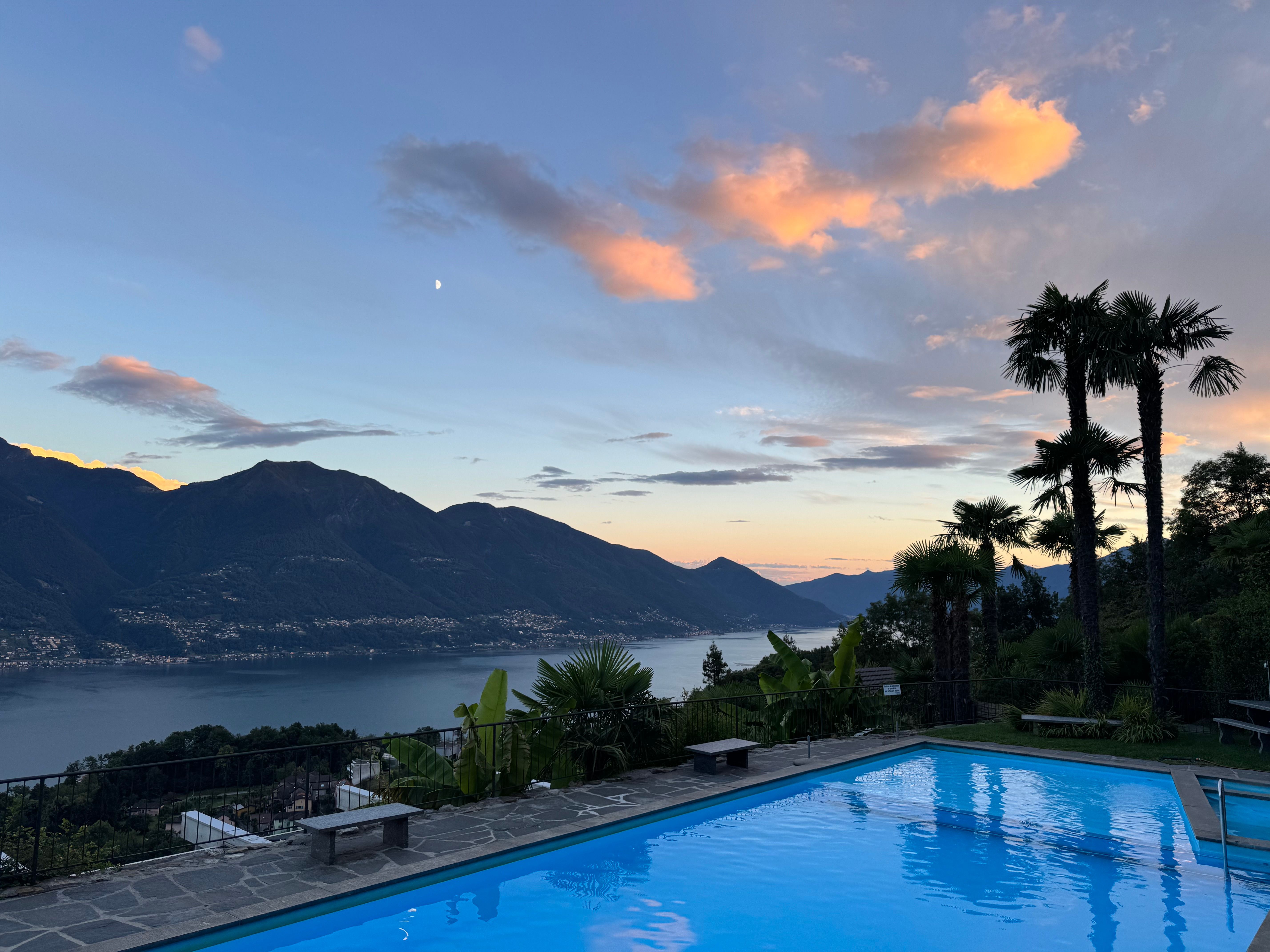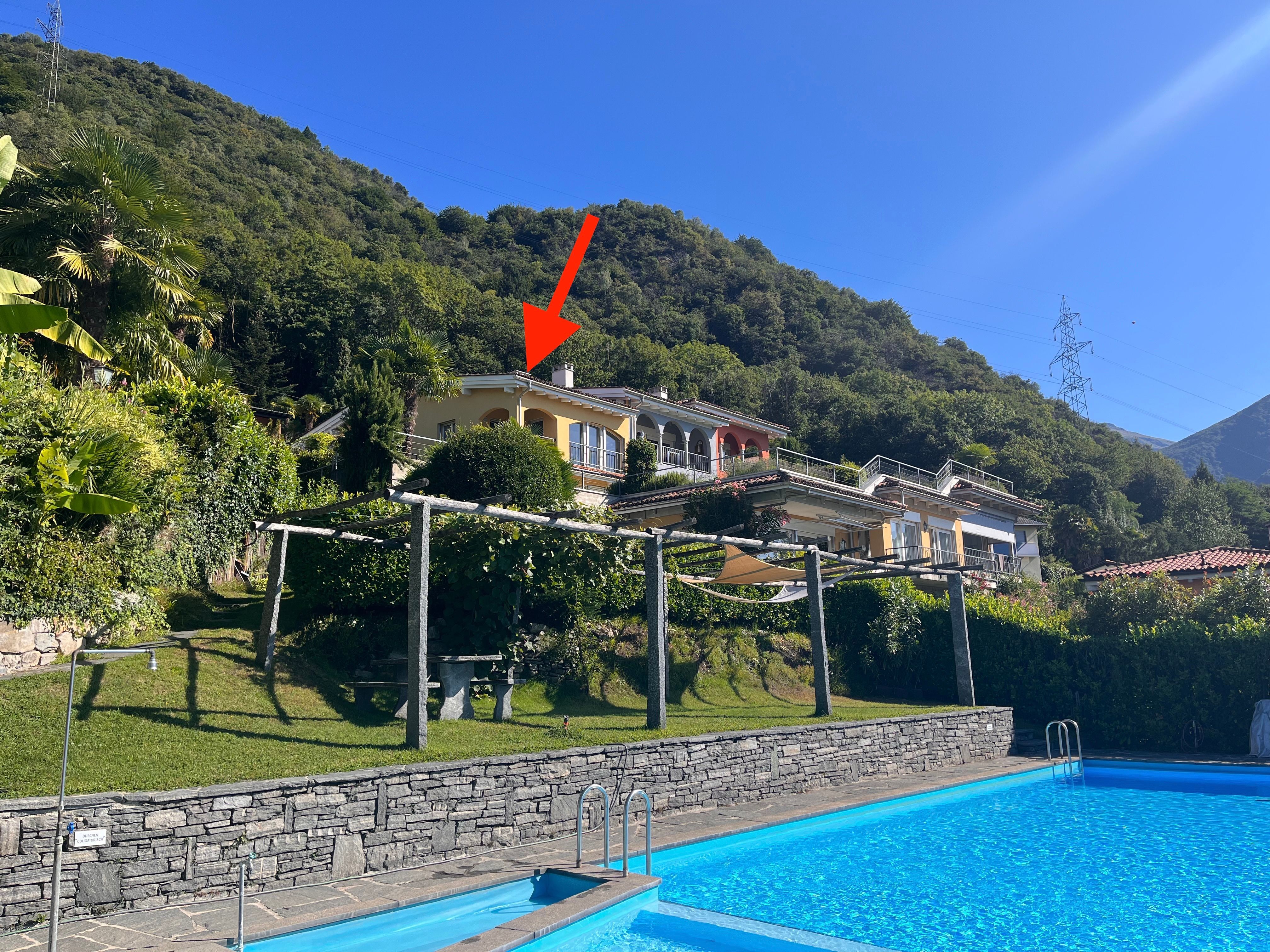 Der Aussenbereich dieses wunderschönen Refugiums lässt keine Wünsche offen. Eine private Terrasse mit grosser Sonnenstore und ein zusätzlicher kleiner wettergeschützter Balkon laden dazu ein, die idyllische Ruhe und die frische Luft zu geniessen. Der gemeinschaftliche Poolbereich ist ein ganz grosses Highlight. Wunderbar gelegen, ist er auf der einen Seite tief genug, um auch mal eine Sprung zu wagen und auf der anderen Seite ist ein wenig tiefer Kleinkinderbereich. BITTE BEACHTEN: Es besteht keine Aufsicht, d.h. die Poolnutzer haften selbst und insbesondere für ihre minderjährigen Kinder. Im Sommer tummeln sich auch Bienen am Rand des Pools, dies kann nicht verhindert werden. Diese sind nicht aggressiv, aber v.a. Kinder und Allergiker sollten dies beachten. Der Pool ist i.d.R. ab Ostern bis Mitte Oktober offen (bitte ggf. mit uns vorgängig abklären). Er ist NICHT beheizt. Im Sommer (Juli/Oktober) bei entsprechendem Wetter wird er 22 bis 25 Grad warm, in der Vor-/Nachsaison ist er wetterbedingt i.d.R. etwas kühler.