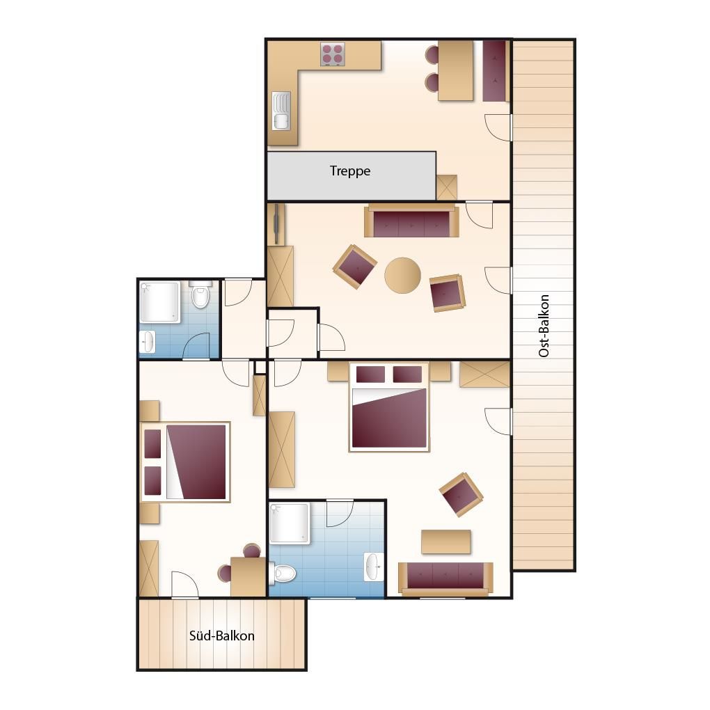 Die Wohnung liegt auf der ersten Etage mit Ost- und Südbalkon
