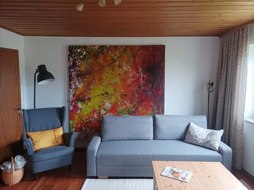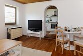 Gemütliches Wohnzimmer mit Couchtisch, Zeitschriften und einer gemütlichen Essgruppe, bestehend aus einem Esstisch 5 Stühlen und einen Kindersessel.