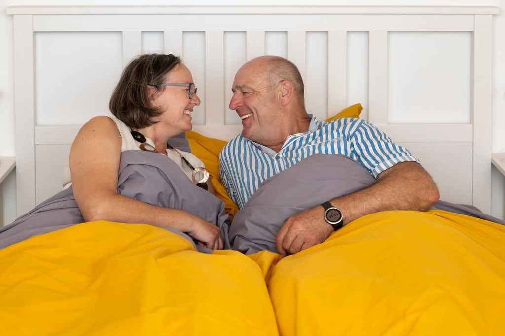 Helles Schlafzimmer mit gemütlichem Bett – die Morgensonne scheint sanft ins Gesicht und sorgt für einen warmen Start in den Tag.
