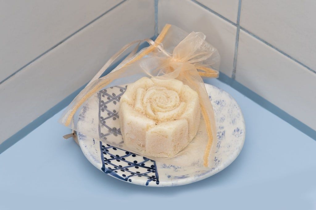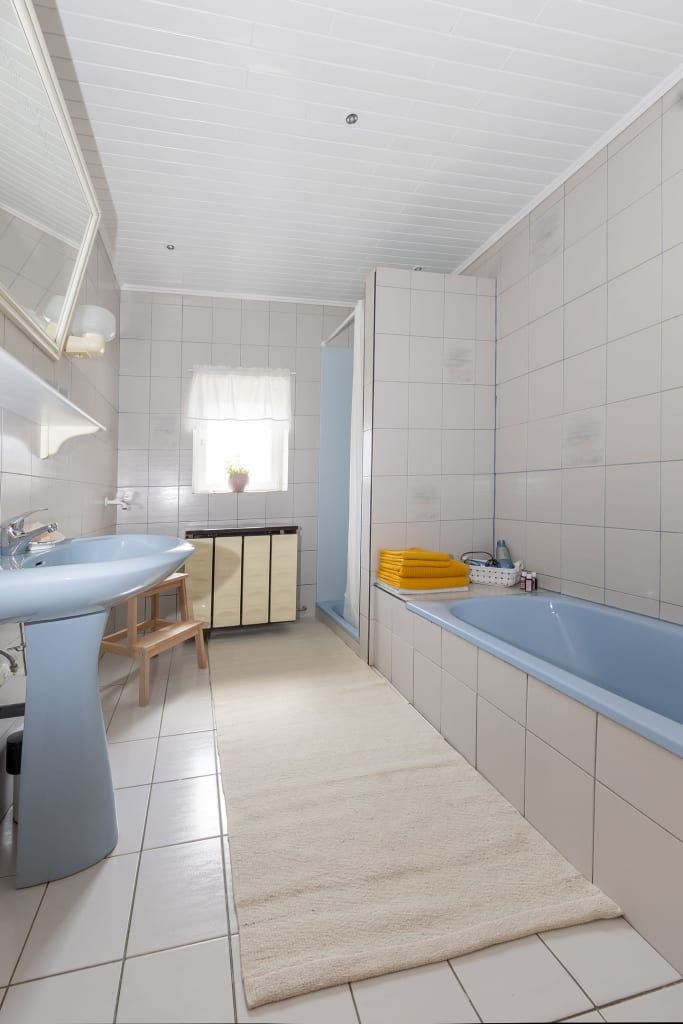 Badezimmer mit Waschbecken, Dusche und Badewanne funktional eingerichtet - handgeschöpfte Seife für die Gäste.