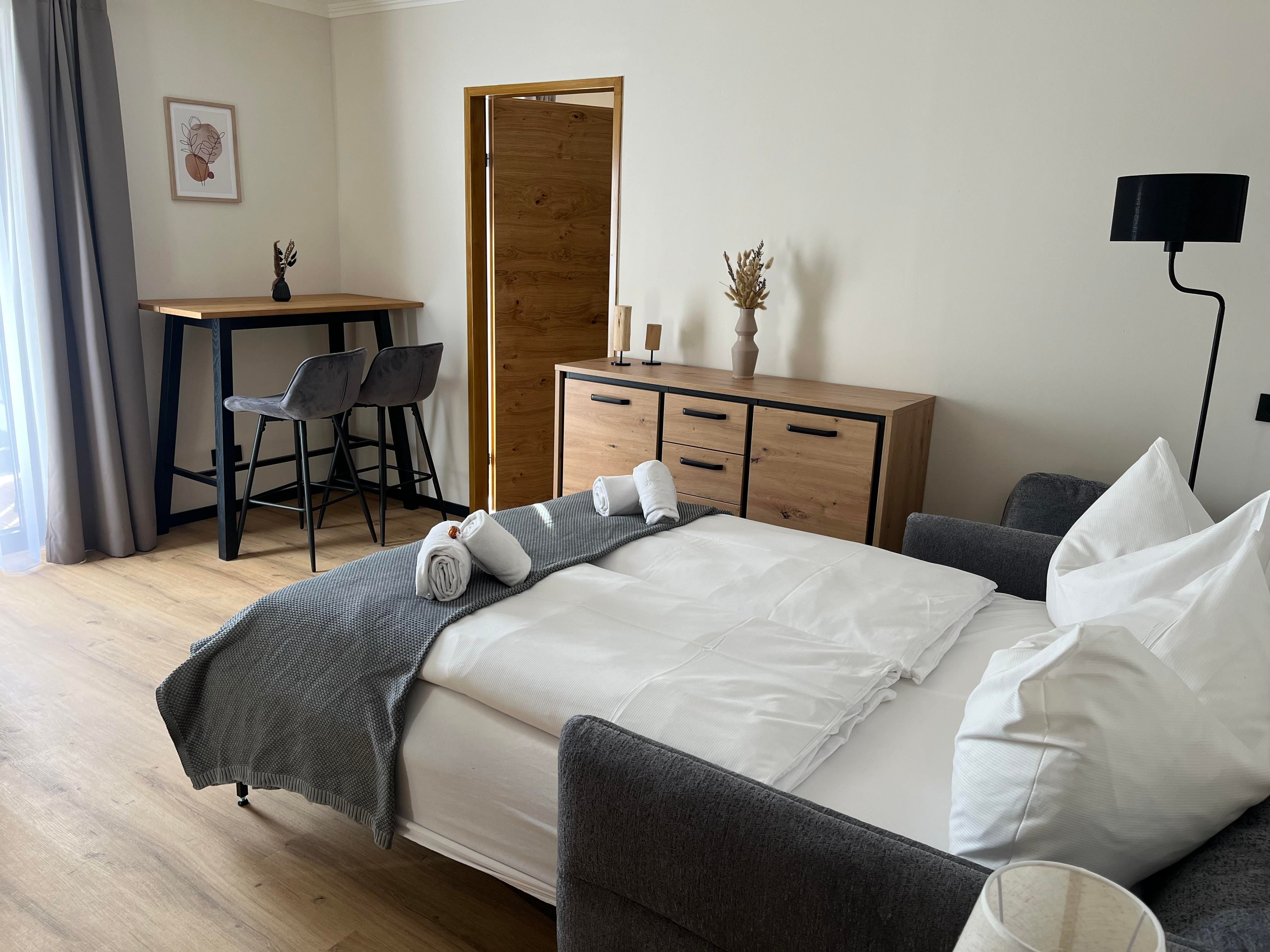 Unsere renovierten Appartements, ideal für Einzelreisende, Paare und Familien, bieten Platz für bis zu 6 Personen. Jedes Appartement verfügt über eine voll ausgestattete Küche, einen Essbereich, ein Bad mit Dusche/WC, Fernseher, WLAN (200 Mbit) und einen gemütlichen Wohnbereich. Entspannen Sie sich auf Ihrem privaten Balkon oder im Garten und genießen Sie die atemberaubende Aussicht. Zusätzlich stehen Ihnen kostenlose Parkplätze, ein Skikeller und einWaschraum mit Waschmaschine und Trockner zur Verfügung.
