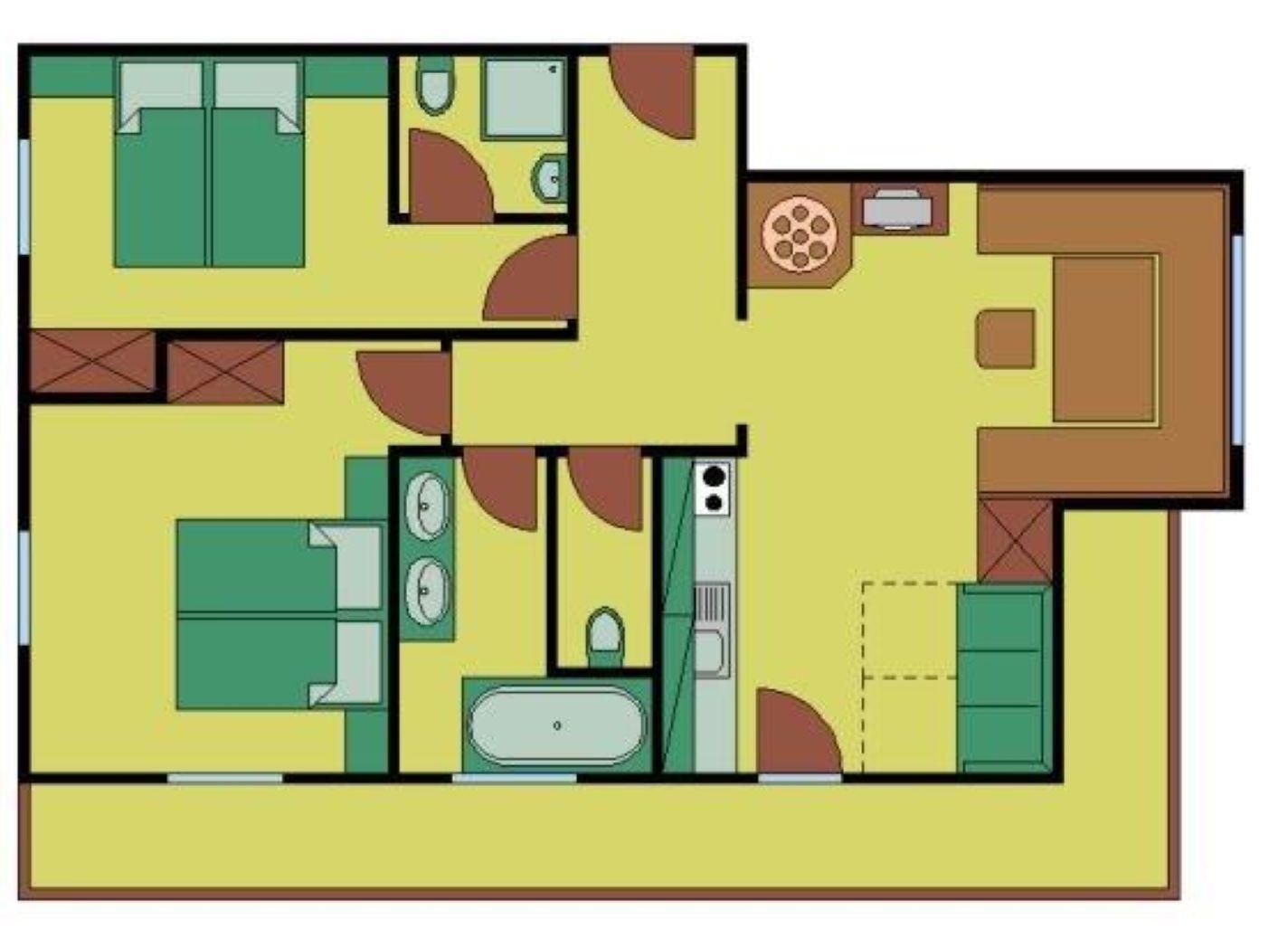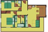 Ein 3-Raum-Appartement: Appartement für 6 Personen (62 qm), 2 Schlafräume für je 2 Personen, DU/WC, Bad/WC, Wohnraum mit Kachelofen, Küchenzeile mit Geschirrspüler, Esstisch, Schlafcouch für 2 Personen und Balkon.