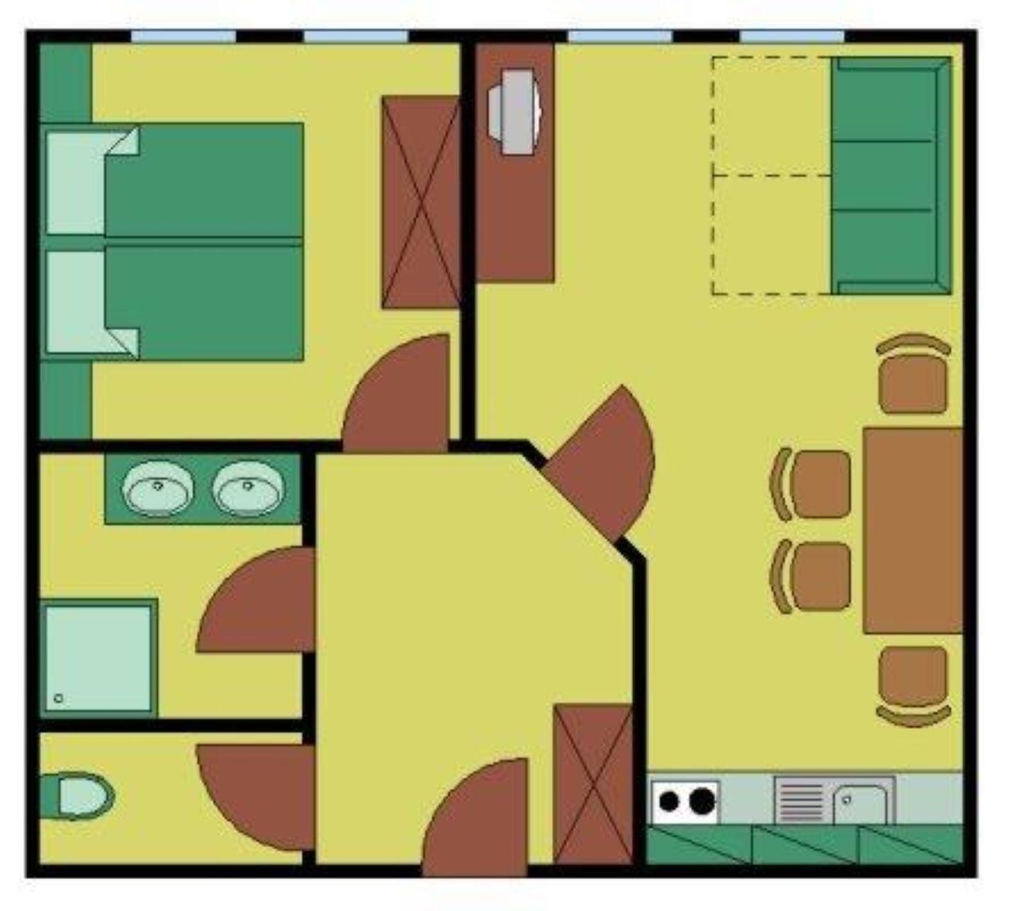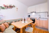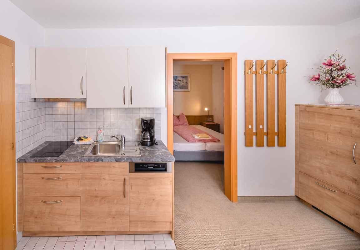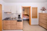 Ein 2-Raum-Appartement: Appartement für 4 Personen (30 qm), Wohnraum mit Küchenzeile, Esstisch und Schlafcouch für 2 Personen, Vorraum, Schlafraum für 2 Personen, DU/WC, Doppelwaschtisch.