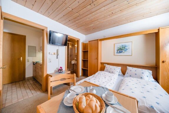Ein Studio bzw. Einraum-Appartement: 1 Appartement für 2 Personen (21 qm), Wohnschlafraum mit Esstisch, Doppelbett für 2 Personen, kleine Küche, Dusche/WC, Balkon