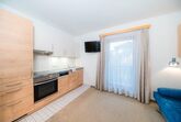 Ein 3-Raum-Appartement: Appartement für 7 Personen (64 qm), 1 Schlafraum (2 Pers.), 1 Schlafraum (3 Pers.), DU/WC, Bad/WC, Wohnraum mit Kachelofen, Küchenzeile mit Geschirrspüler, Esstisch, Schlafcouch, Balkon.