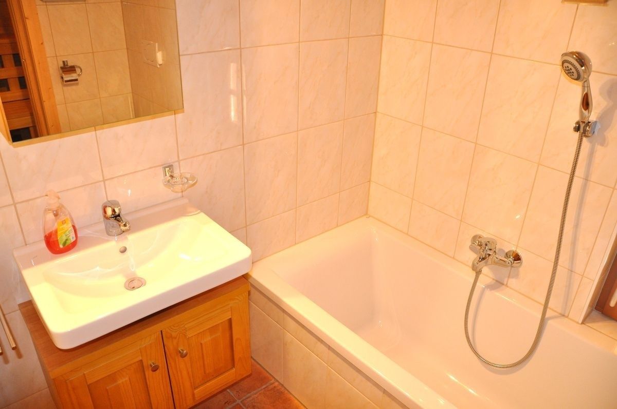 1 Badezimmer mit Badewanne, Waschbecken & WC