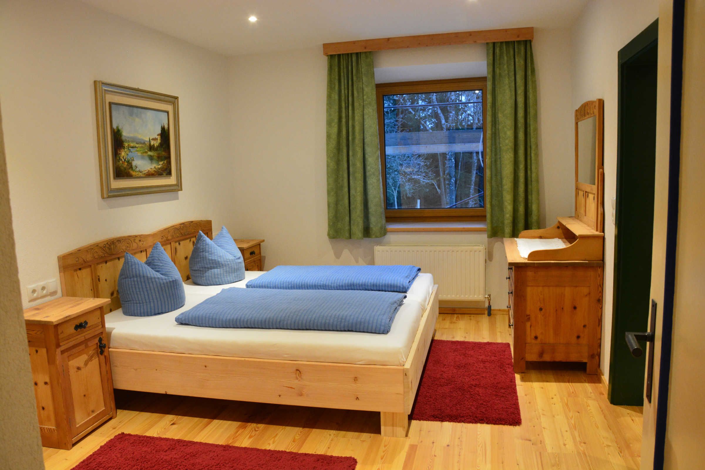 Die kleine Ferienwohnung besteht aus einem Wohn-Schlafzimmer mit ausziehbarer Doppelcouch, Sitzecke, Küchenblock (mit Kaffeemaschine, Mikrowellenherd) und SAT Fernseher, einem mit hellen Bauernmöbeln eingerichtetem Schlafzimmer, einem Vorraum, WC und Dusche mit Haarfön. Sie bietet Platz für 2 bis zu 5 Personen. Von der Wohnung aus haben Sie Balkon einen Blick nach Süd-Osten direkt ins Tiergehege.