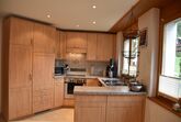 Wohn-Esszimmer mit Sitzgruppe, Esstisch, moderne offene Küche mit Keramikkochfeld, Backofen, Mikrowelle, Geschirrspüler, Kapselkaffeemaschine Krups Dolce Gusto, Wasserkocher, Fondue-Set, Racletteofen.