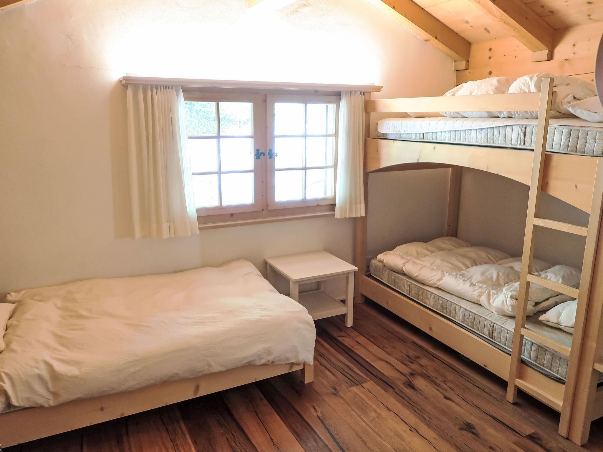 4-Zimmer-Wohnung 150 m2 auf 2 Stockwerken. Komfortabel und gemütlich eingerichtet: Wohn-/Esszimmer mit offenem Kamin (nur Deko). Ausgang zum Balkon. 1 Doppelzimmer mit Dusche/WC. Grosse, offene Küche (Backofen, Geschirrspüler, 4 Glaskeramikplatten, Toaster, Wasserkocher, Tiefkühler, elektrische Kaffeemaschine, Racletteofen, Fondue Set (Käse)). Sep. WC. Obergeschoss: Galerie. 1 Doppelzimmer mit Dusche/WC. 1 Zimmer mit 1 Bett und 1 x 2 Etagenbetten, Dusche/WC. Balkon 25 m2, Südlage, Gartensitzplatz 40 m2. Terrassenmöbel, Balkonmöbel, Liegestühle (2). Schöne Sicht auf die Berge, die Landschaft und die Ortschaft. Zur Verfügung: Waschmaschine, Wäschetrockner. Internet (WLAN, gratis). Parkplatz, Garage (2 Autos) beim Haus, Höhe 190 cm. Bitte beachten: Nichtraucher-Unterkunft.