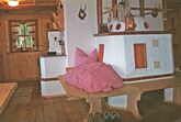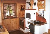 Voll ausgestattete Küche: Elektroherd mit Backofen, Kühlschrank mit Gefrierfach, Kaffeemaschine, Toaster, Wasserkocher, Holzofenherd & Aufschnittmaschine