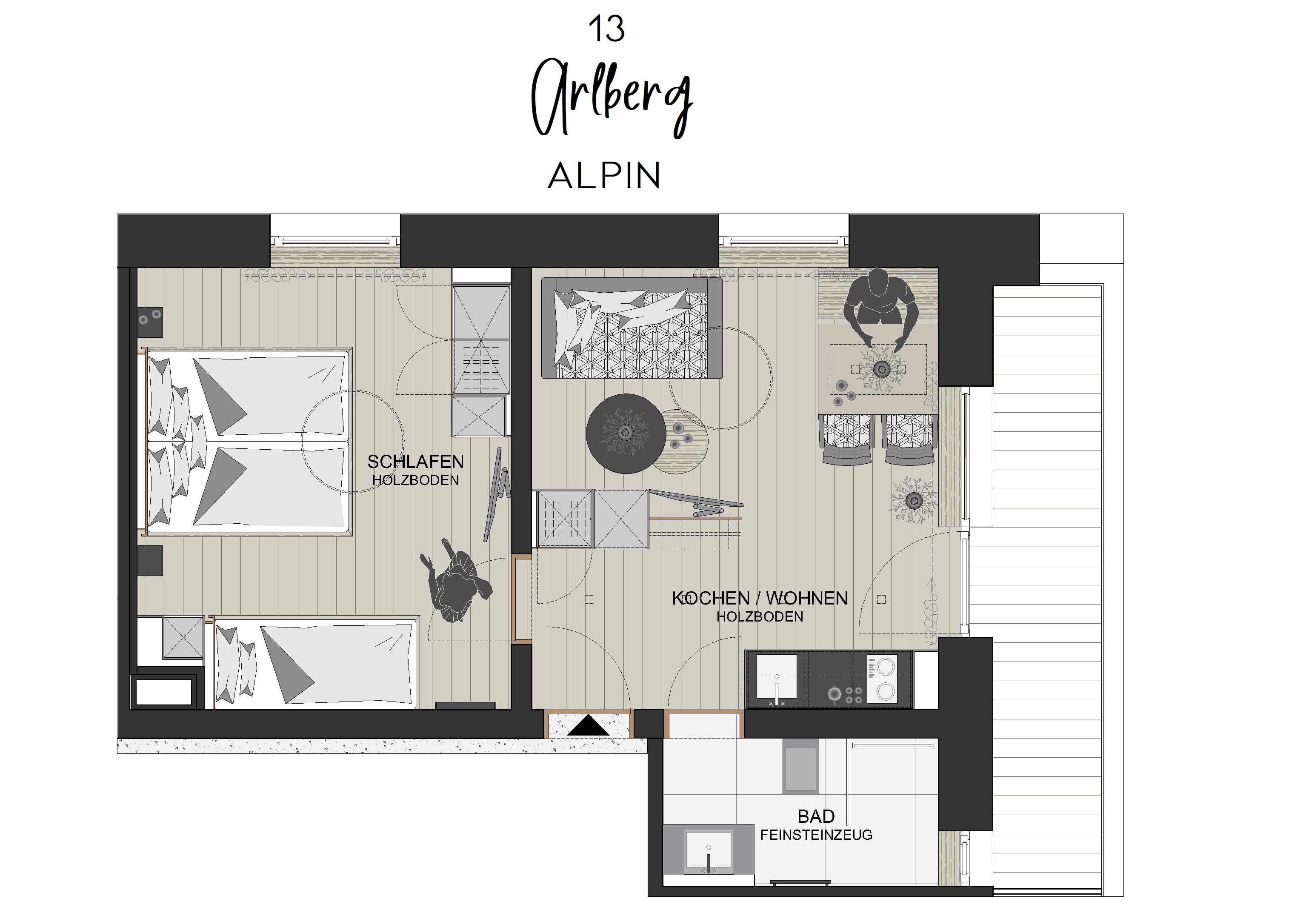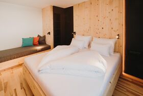 Bis zu 5 Personen einer Familie oder eine kleine befreundete Gruppe finden in den geräumigen Familienstudios Family Alpin Platz. Ein getrenntes Schlafzimmer mit Doppelbett und einem Einzelbett aus Zirbenvollholz sowie ein Wohnbereich mit hochwertiger Schlafcouch für die 4. und 5. Person sorgen für die nötige Erholung. Essbereich mit Kitchenette, Badezimmer mit Walk-In Regendusche und WC, Balkone für sonnige Stunden und panoramareiche Ausblicke. Glasfaser-TV im Schlaf- und Wohnzimmer, Telefon, Safe und kostenloses WLAN.